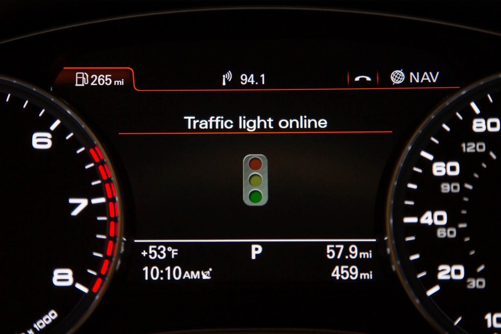A táblafelismerő jeleit beépített internethozzáféréssel kombinálva értelmezi a rendszer, hogy a forgalom változására tudjon reagálni a sofőr. Jelez, ha felesleges már gyorsítani, így az autó kigurításával egy gyorsítást és az utána következő erős fékezést is meg tudjuk úszni, közben szépen csorgunk a forgalomban. Mivel dugó van, amúgy sem tudnánk átugrani az autótömeget, csak feleslegesen izmoznánk a nagy Audiban. Az autó nem a lámpákat nézi, az intelligens forgalomirányítók jeleit internetkapcsolaton keresztül kapja.