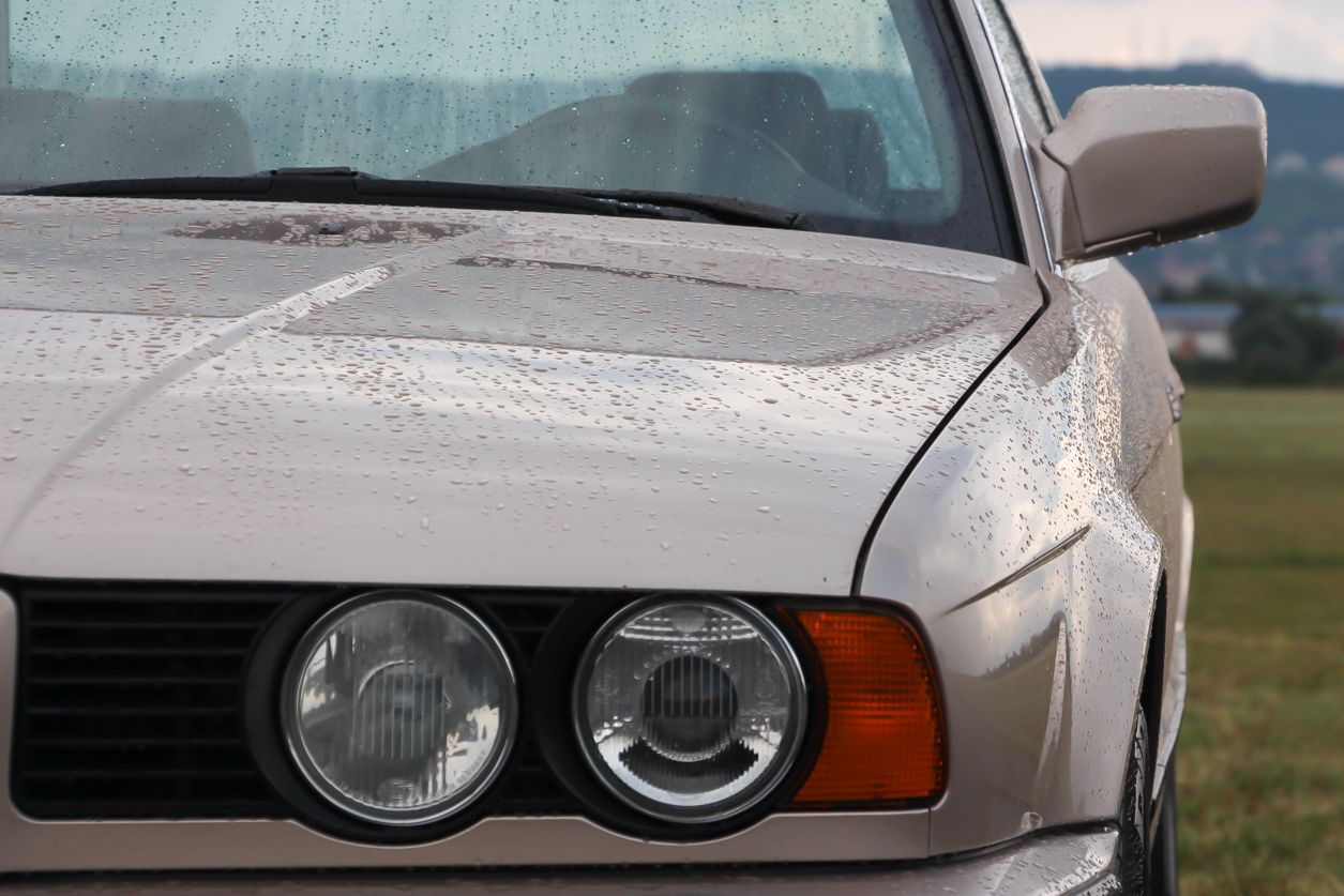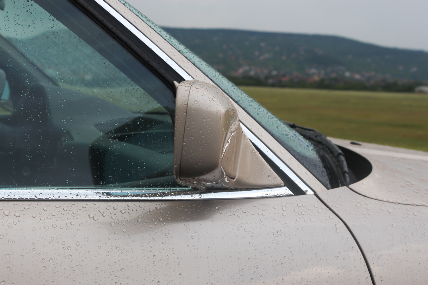 A fotózás megvolt, elkapott minket egy erős záporeső, aminek a tulaj érthetően nem örült, de a képeket látva, a motorházon szánkázó vízcseppek később megenyhítették. Ezeken az ötösökön eddig a külső visszapillantók alatti kis felfelé kanyarodó ív volt a kedvencem, amivel az autó oldalsó és első ablakvonalát kötik össze. Azért az autó oldalán, a kilincsek magasságában húzott vonal törése az első sárvédőn sem kutya. Agresszív részlet, ami ezen a világos fényezésen jobban kijön, mint a szokásos sötétzöldön, kéken, vagy feketén. A tulaj egy nagyon ritka középbordó színt keresett, de állapota miatt végül ezt a bézst vette meg, és nem járt vele rosszul.