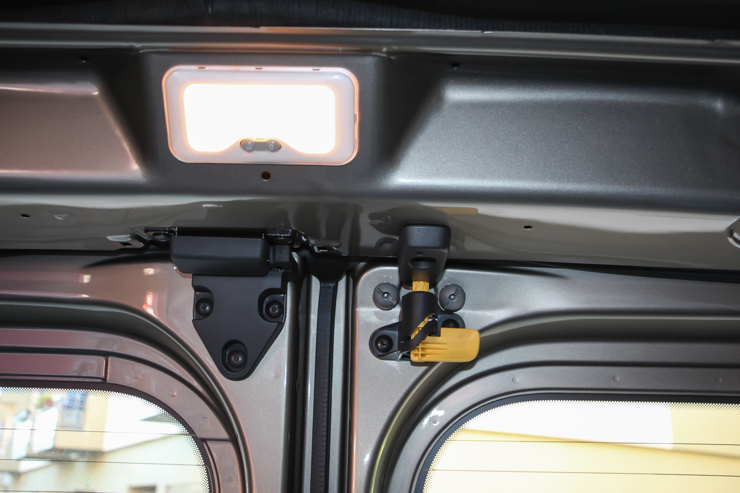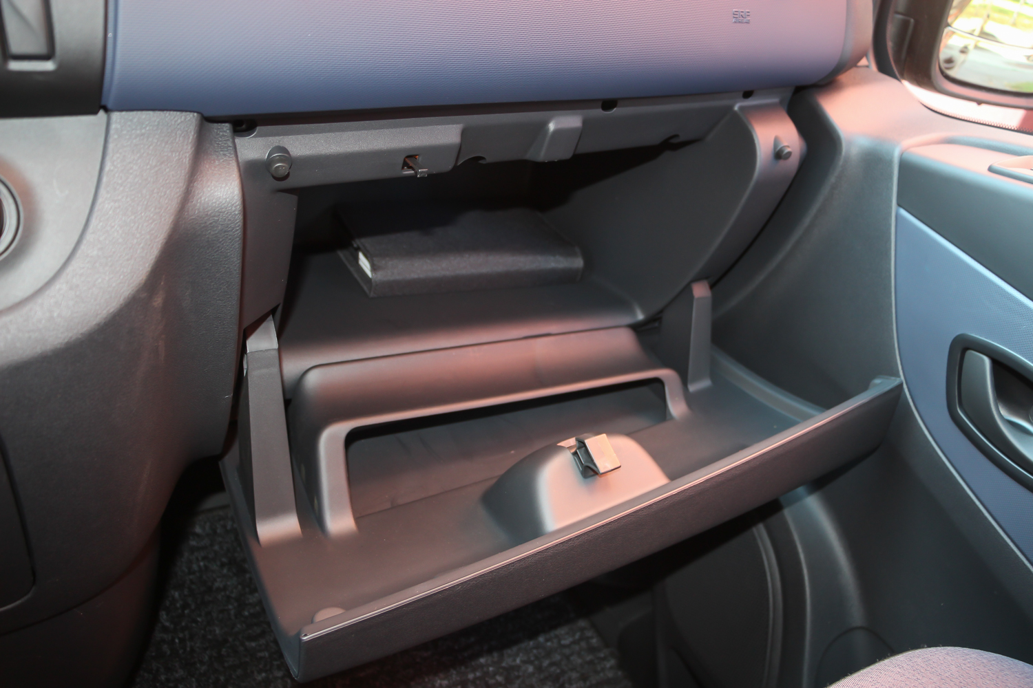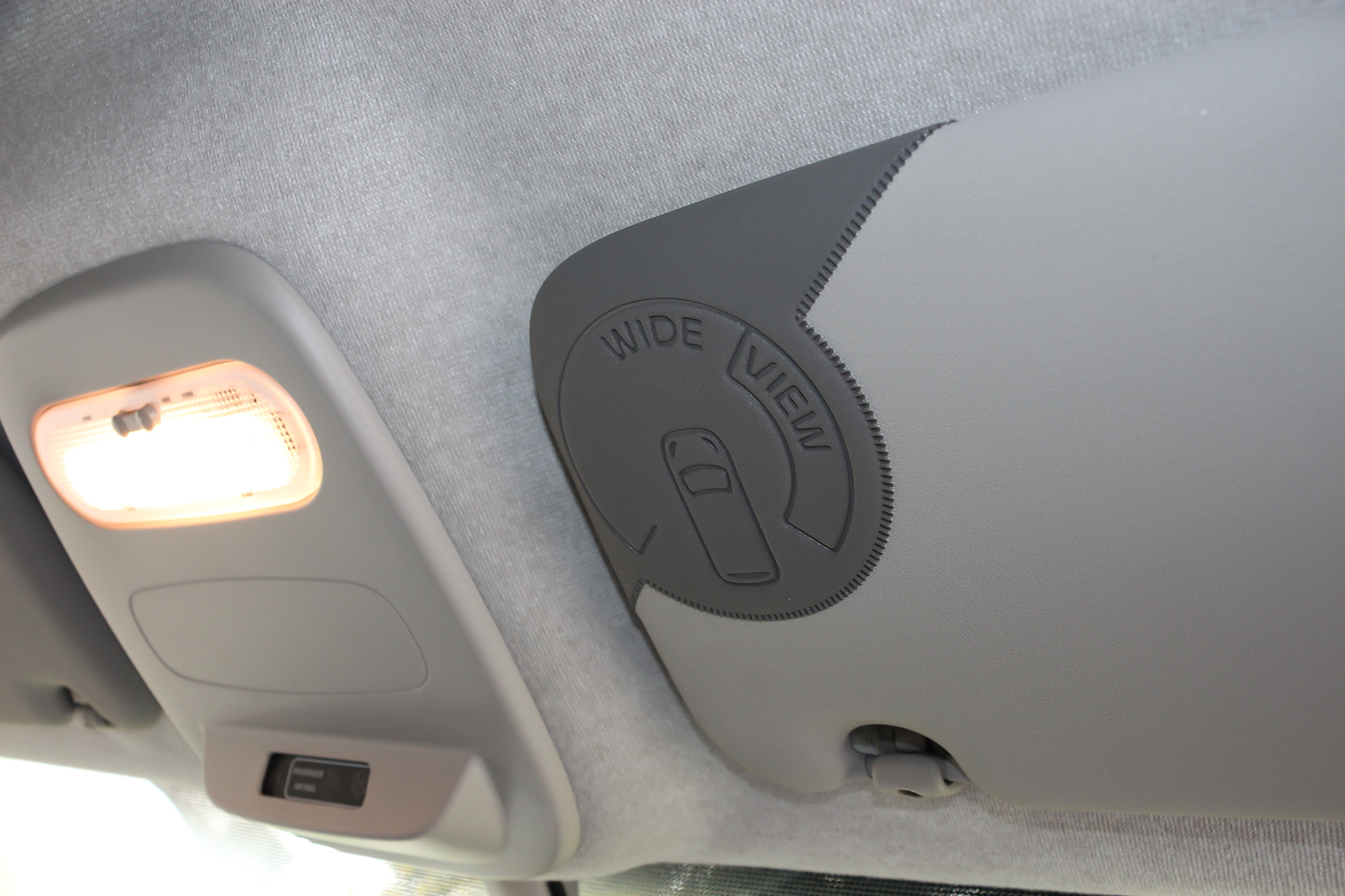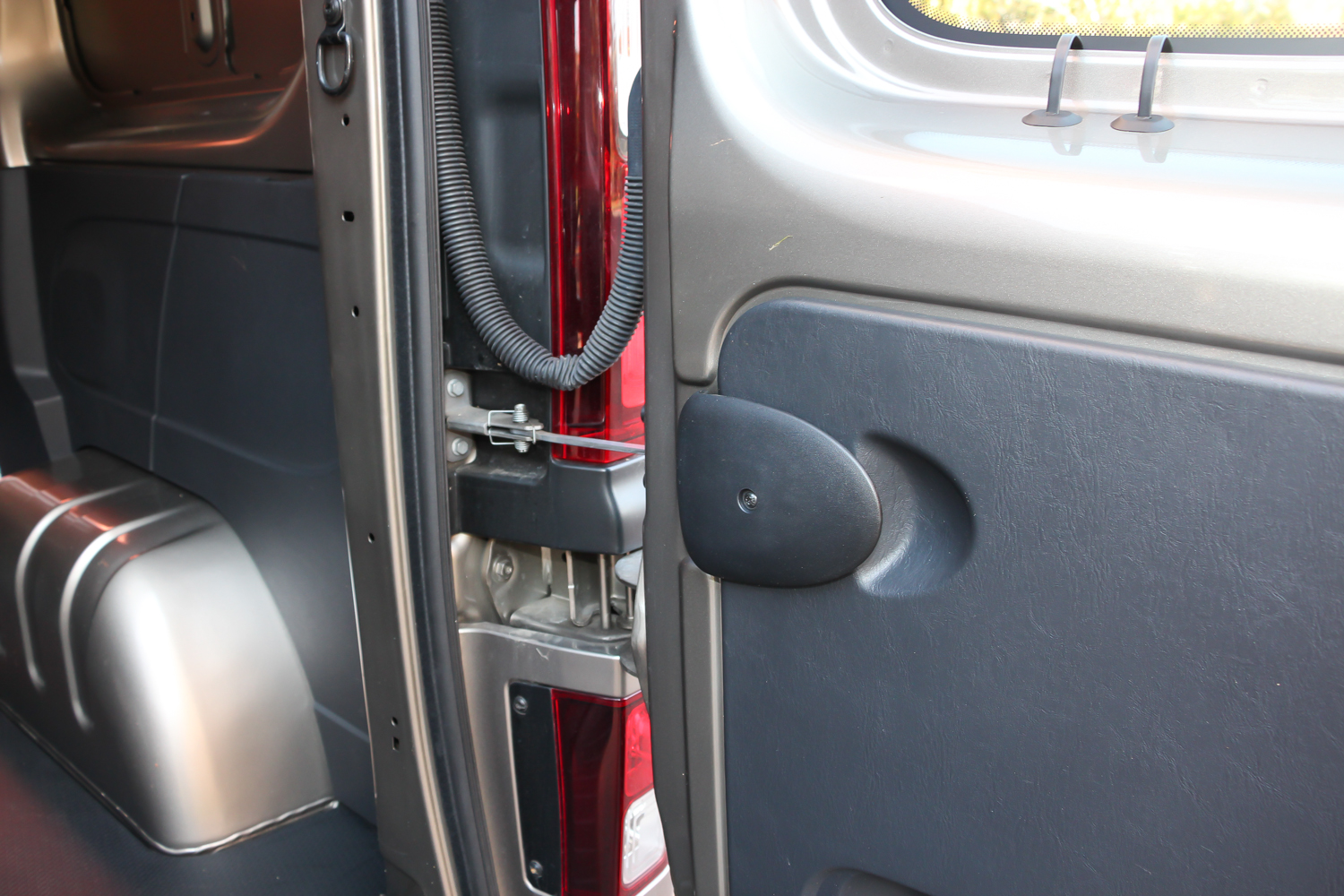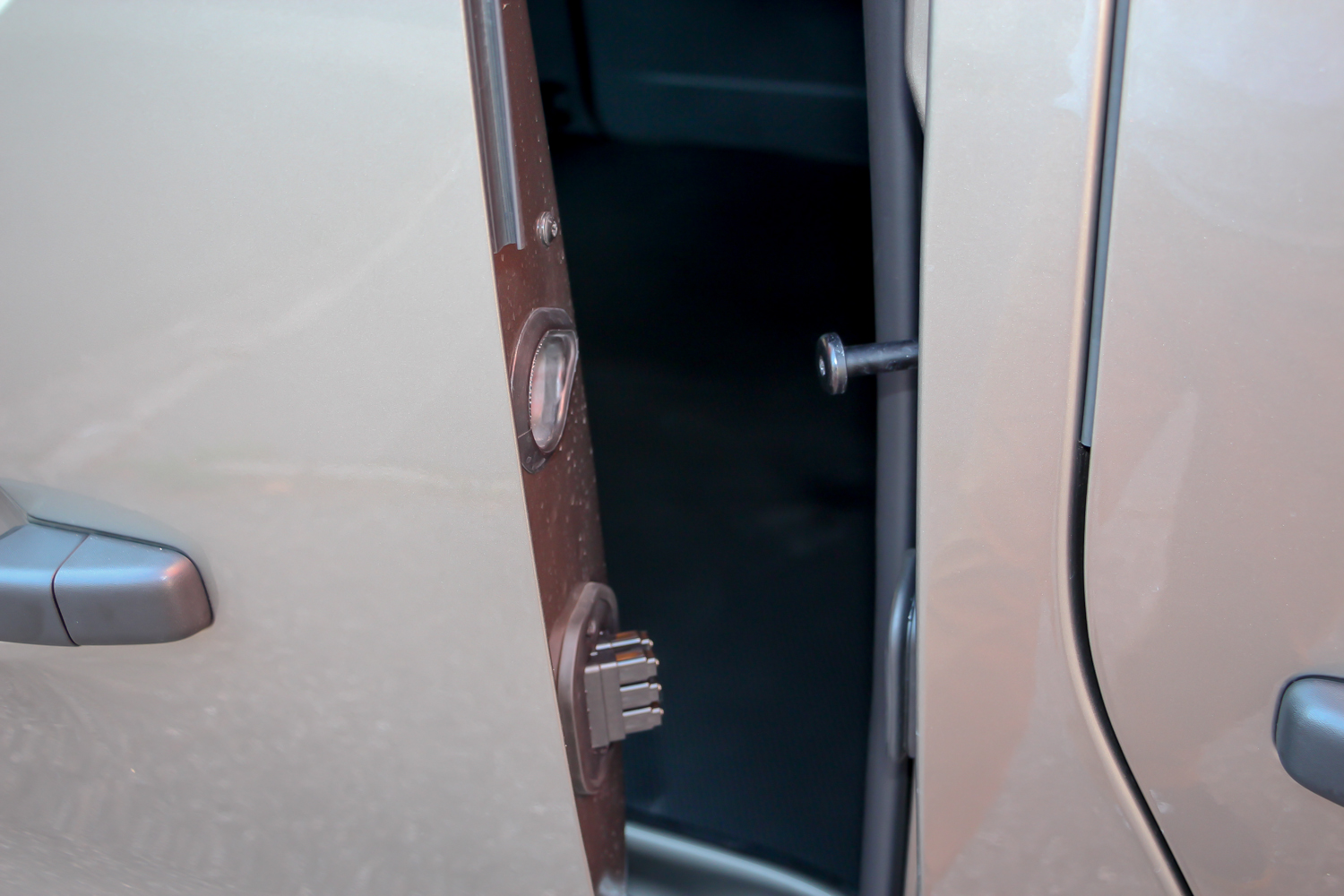 A hátsó ajtókon van ablak, és ablaktörlő, sőt fűtőszál is, így cuccok nélkül ki lehet látni hátra a kabint elválasztó ablakon át. Fényre sötétedő, elektorkróm belső visszapillantó is jutott a Renault konfekciójából, de egy lemezelt furgonba felesleges az ilyen. A külső visszapillantók sokkal fontosabbak, azok alja nagyítós, a szélük meg holttér-csökkentő. Azokból ezért nagyon jól el lehet navigálni, még annak is aki személyautókhoz szokott. A padka mellé parkolás öröm emiatt is, meg a 16 colos, magas oldalfalú cargo gumik is bírják a strapát, még a teljes dísztárcsával sem könnyű a kerekeket megnyúzni.