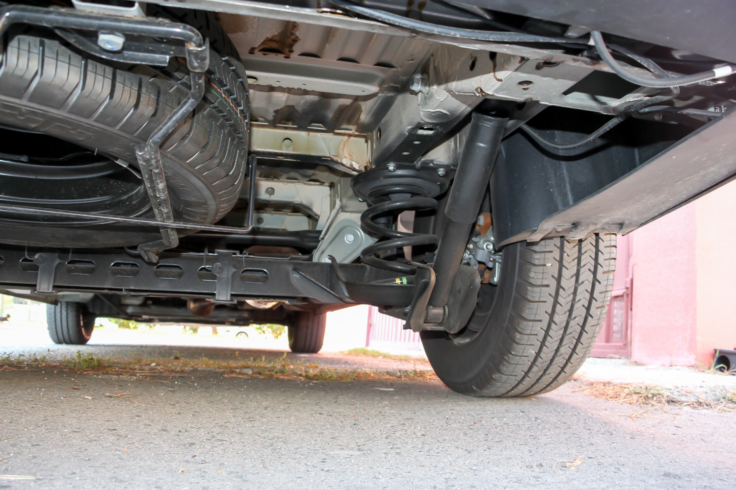 A Vivaro alatt bár van egy vastag és kellőképpen merev tengely, de ez egyrészt mindkét oldalt egy lengőkarral csatlakozik az autó aljához, másrészt ott az a bizonyos Panhard rúd (mint a Zsigákban), ami még egy ponton, keresztirányban is összeköti a tengelyt a kasztnival. Ehhez jön még, hogy a rugók függőlegesek, de a lökésgátlók rajtuk kívül vannak elhelyezve, tompaszögben állnak, a felső bekötésük hátrébb van, mint az alsó. Kicsit bonyolult talán így leírva, a lényeg annyi, hogy nagy tömegben olcsón gyártható, egyszerű alkatrészekből sikerült összerakni egy jó futóművet, amivel terheletlenül sem pattog vészesen az autó. Rossz úton persze az üres raktér zeng a nagyobb úthibák ütésétől, de ez nem a Vivaro hibája.