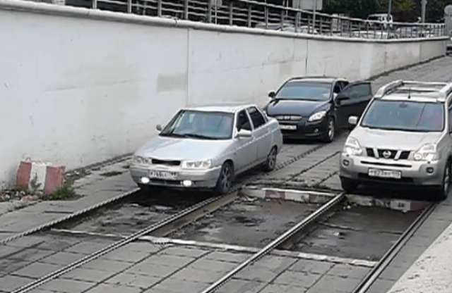 Aki félti az autóját, például az alábbi videó elején az Audi A8, vagy közepén a Kia pro_cee’d sofőrje, az áthajtás előtt kiszáll, és megnézi, hogy jó helyen, pontosan a sínen van-e az autó. Egy ladás meg sem próbálkozik a szokott mutatvánnyal, vélhetően már tudja, hogy a Zsiguli nyomtávja szerényebb, mint a villamossínek egymástól mért távolsága. A Lada hasmagasságának persze nem gond, hogy nincs út a sínek között. Aztán van még egy remek jelenet: egy Kia Sorento sofőrje véli úgy, hogy ő nem csak a síneken tud átkelni. Aztán már az első kerekek lerakása után meggondolja magát, s végül maga is a sínen autózik. Szabálytalanul, de biztosan időt spórolva, ahogyan teszik azt hazánkban is sokan.