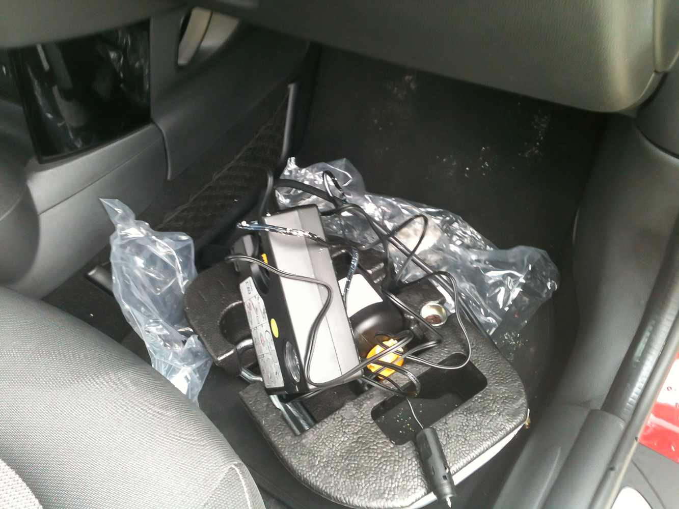 Nem meglepő, hogy az oldalfalán kiszakadt gumit a kompresszor nem tudta rendesen felfújni. Használat után az első lábtérben a szett az üres palackkal