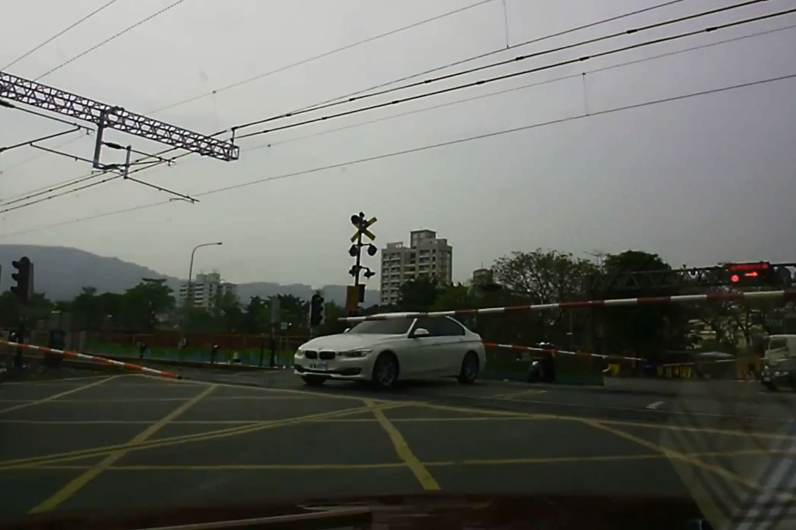 A BMW 3-as vezetője nem tűnik túl ijedősnek. Mintha nem is zavarta volna, hogy beragadt autójával a vasúti átkelő sorompói közé. Szerencsére a felvételt készítő autós segített neki, így nem lett baleset.