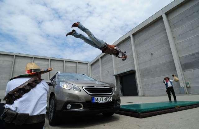 A remek képeken kaszkadőrök profi és biztonságos mutatványa látható, amint cowboyok vitás ügyét imitálva a Peugeot 2008 motorházteteje felett repkednek, egy harmadik, akinél a pénzeszsák, meg jól lelövi őket. Szivacsra esnek, tudják, mit csinálnak, s nem utolsósorban áll a kocsi, amit „csak keresztben ugranak át. A lenti videón nagyon más a helyzet, ott és akkor szerencséje volt a srácnak (fotó: Hilbert Péter/Peugeot)