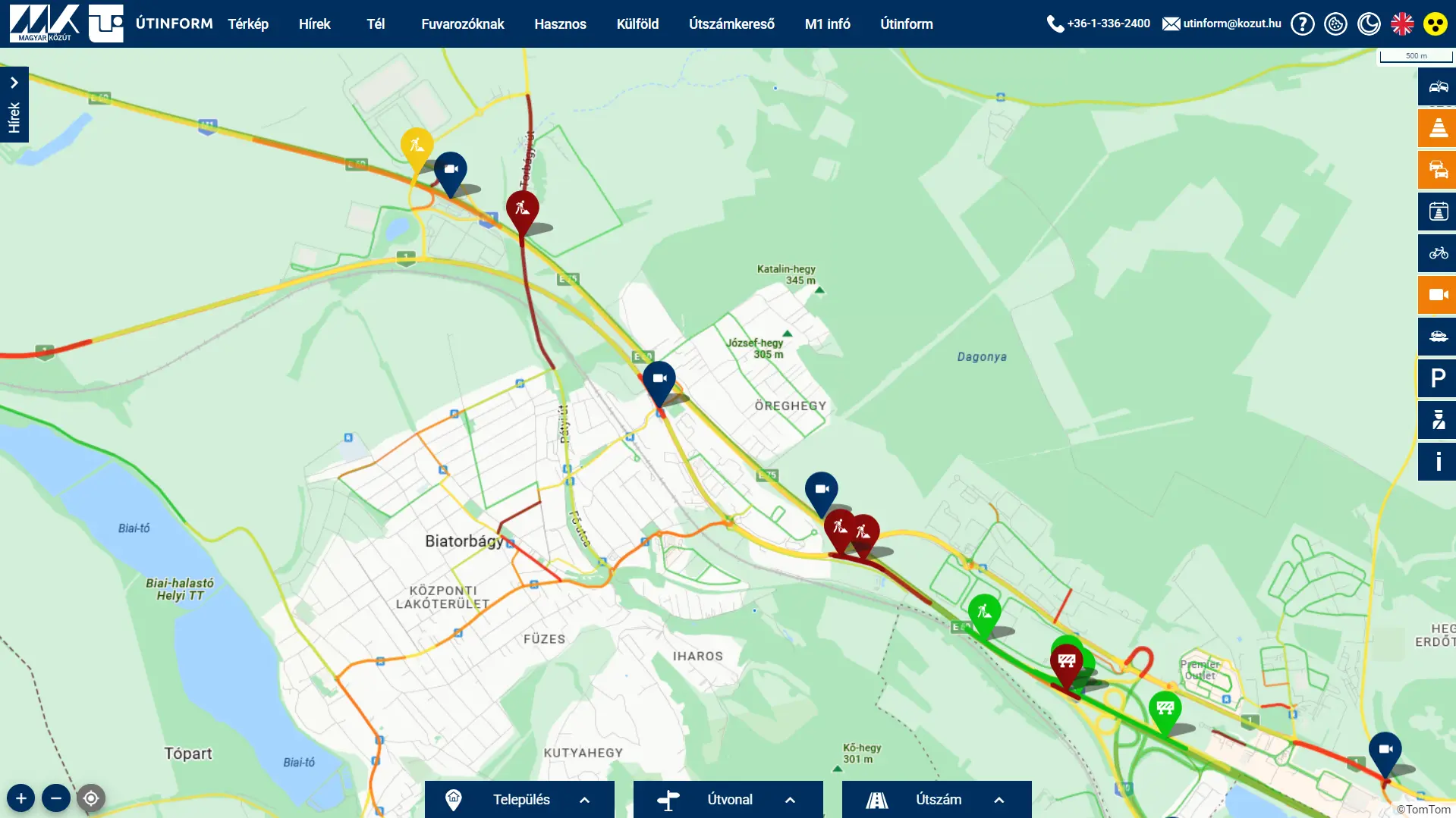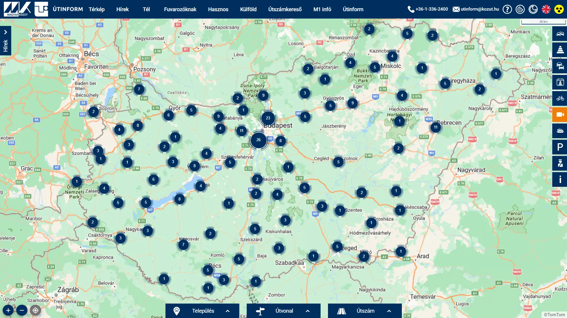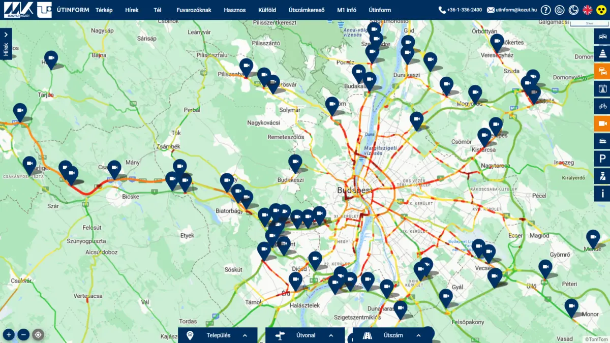Nem újdonság már az Útinform térképe, sőt, annak webkamerás hálózata sem, ám most mindenkit szeretnénk emlékeztetni erre a szolgáltatásra, hiszen a hóhelyzetben különösen fontos, hogy tájékozódjunk az utak állapotáról. Már évek óta üzemel országos kamerahálózat a hazai utakon, amellyel bárki, bármikor ellenőrizheti több száz ponton az utak állapotát és a forgalmi helyzetet. Fontos azonban megjegyezni, hogy nem egy folyamatos videofelvételt láthatunk a gombostűkre kattintva, hanem egy nagyjából néhány perces állóképet, ám már ennyiből is egyértelműen kiderül, hogy milyen közlekedési viszonyokra számíthatunk az adott útszakaszon. Hogyha kíváncsi vagy a Budapesten kívüli webkamerák pillanatnyi képeire, akkor a térképet ide kattintva érheted el. A térképen ráadásul a torlódásokat, a dugókat is ellenőrizni lehet élő forgalmi adatok segítségével, illetve a különböző forgalmi akadályokat is jelezheti gombostű, ezeket a képernyő jobb szélén lehet ki-be kapcsolni a térképen, ahogy a webkamerákat is. Jelenleg is akadnak sajnos olyan kamerák, amelyek átmenetileg nem üzemelnek, ám a nagy részüknek még a hó sem jelent akadályt, íme néhány példa, hogy mit lehetett látni a kameraképeken tegnap kora este. Ehhez hasonló webkamerák találhatók Budapesten is, amelyekkel hatékonyan ellenőrizhető a forgalmi helyzet a fővárosban, ám azokat nem az útinform, hanem a Budapest Közút honlapján lehet elérni. Fontos, hogy az alábbi linken elérhető, fővárosi térképen nagyon közelre kell nagyítani a gombostűkre, csak akkor válnak kattinthatóvá, ha minden kamera külön jelenik meg. Hogyha kíváncsi vagy a Budapesten található webkamerák pillanatnyi képeire, akkor a térképet ide kattintva érheted el.