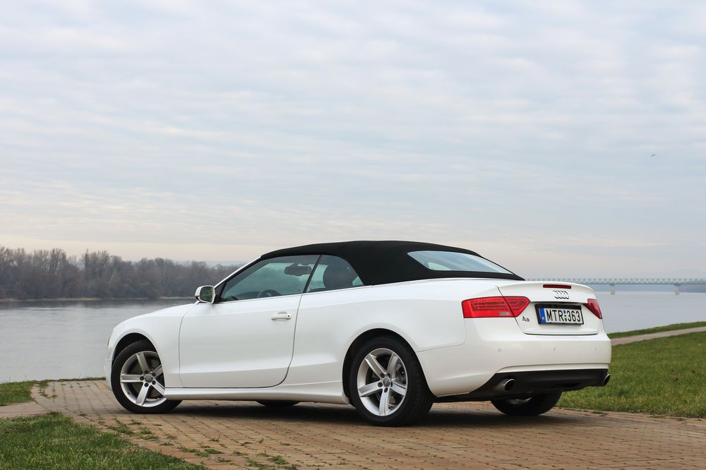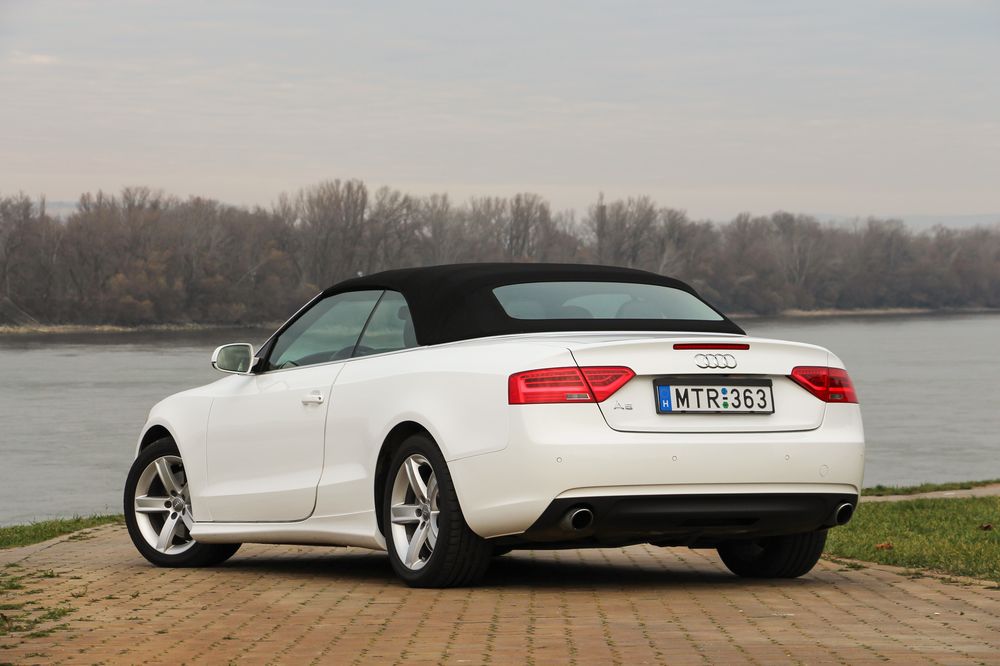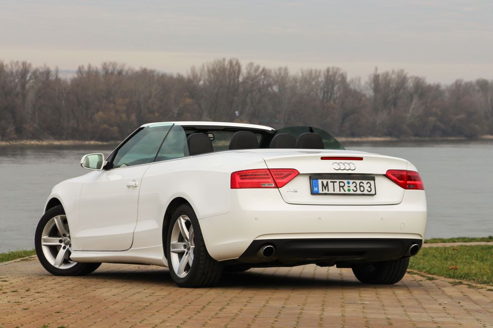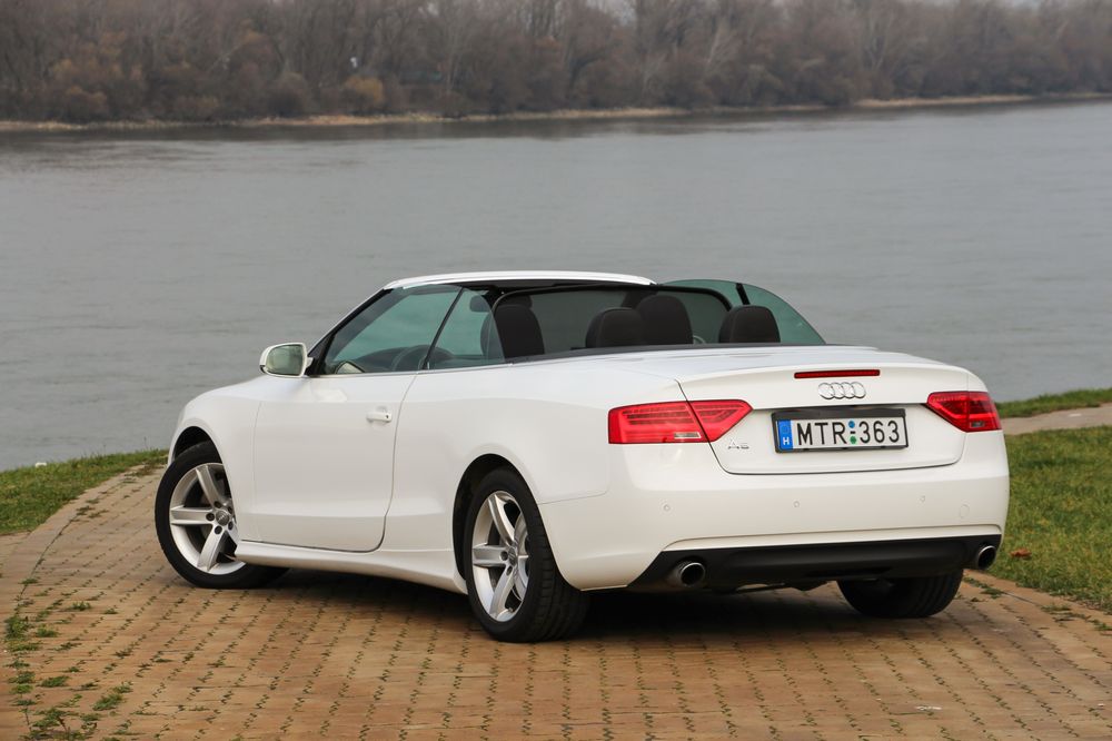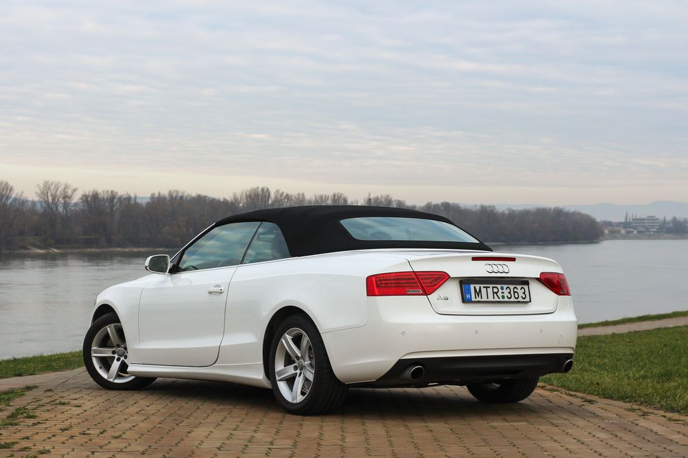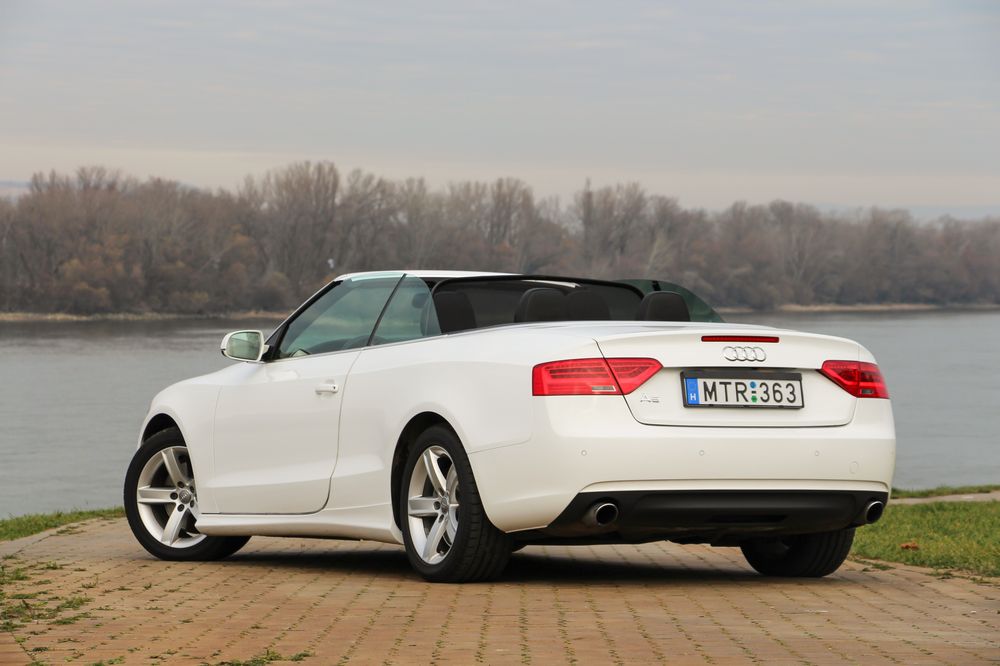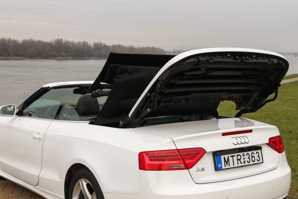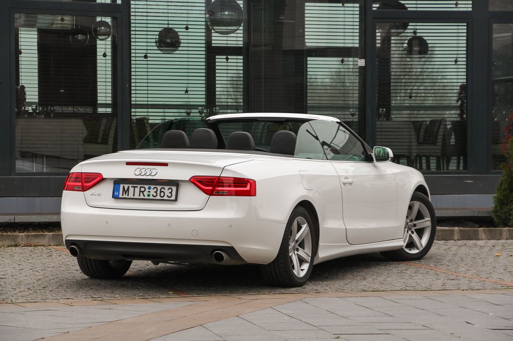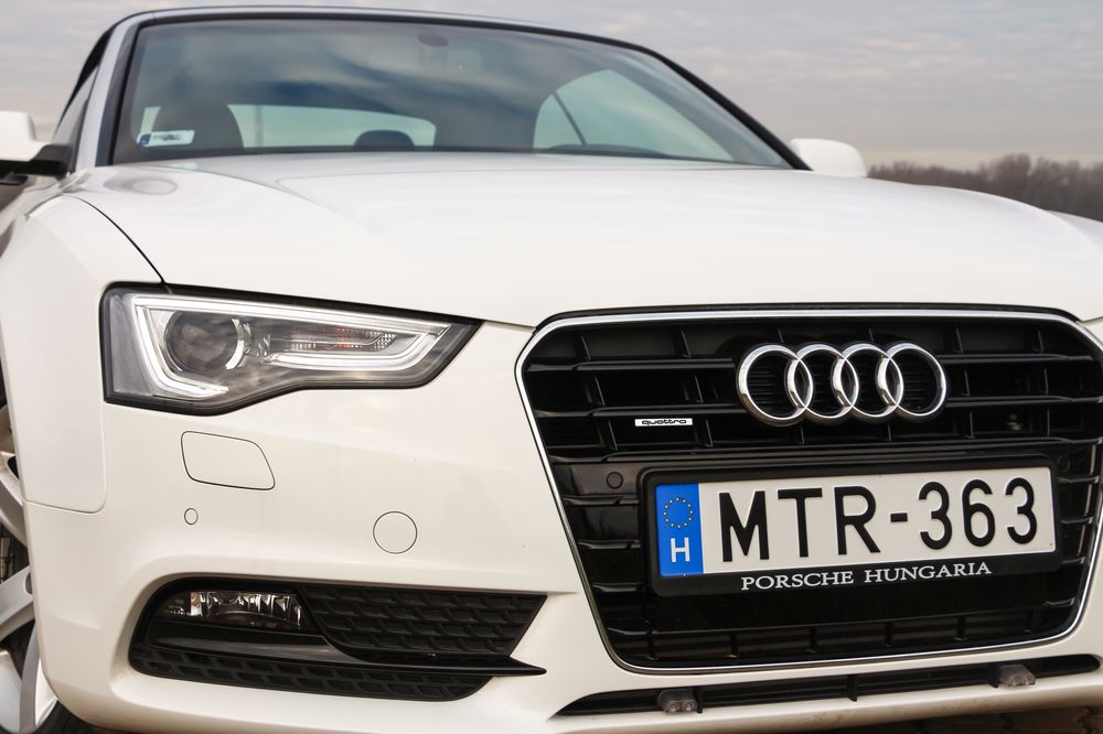Duplakuplungos, az Audi terminológiája szerint S tronic a TFSi benzinmotorhoz csatlakozó hétfokozatú automataváltó, quattro, azaz állandó és Torsen differenciálműves az összkerékhajtás, adaptív és hangolható lengéscsillapítós a meglehetősen igényes, elöl kettős keresztlengőkaros, hátul oldalanként ötkaros független futómű. A felnik „csak” 17 colosak, de nem teljesen alapok, azok ugyanis 225/50 R17-es abroncsokat kapnak, ezekre az ötküllős kerekekre pedig 245/45-ösök kerültek – Continental Sport Contactok. Azok sincsenek elkoptatva, hiszen a 2,5 éves autóban még 12 ezer kilométer sincs. Újszerűbb ez a kabrió, mint számos tesztautó, ami nálunk jár. Ezt a kategóriát ugyanis – nagyon helyesen – nem kapja meg mindenki. Nincs összekaristolva a kormány bőrhuzata, nincsenek megütve a felnik, nincs gépi mosóval széjjelkaristolva a gyöngyházfehér fényezés.