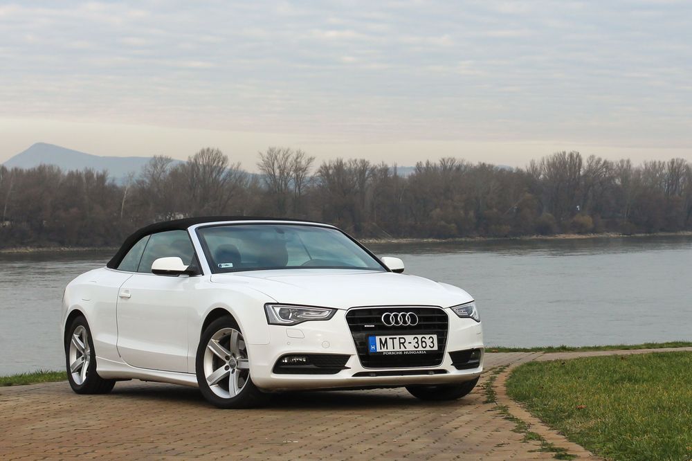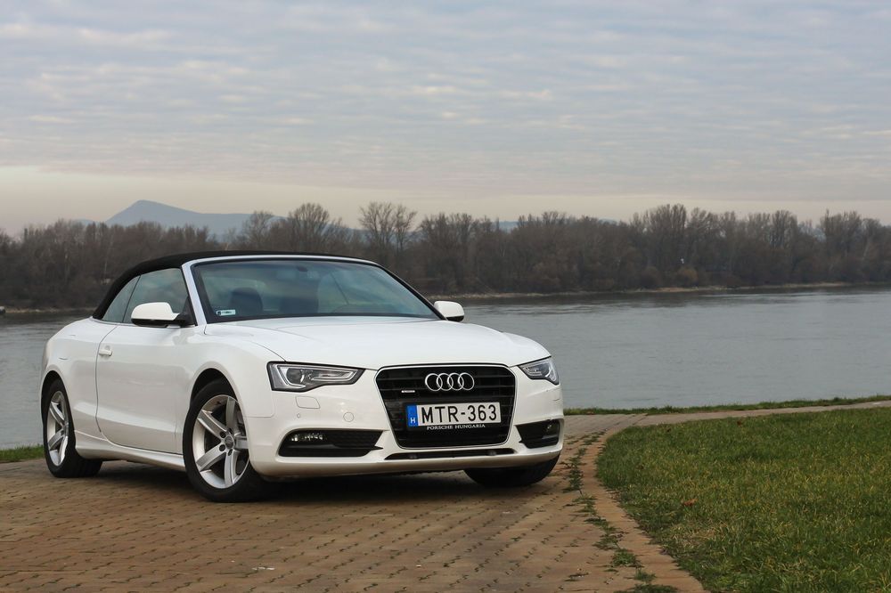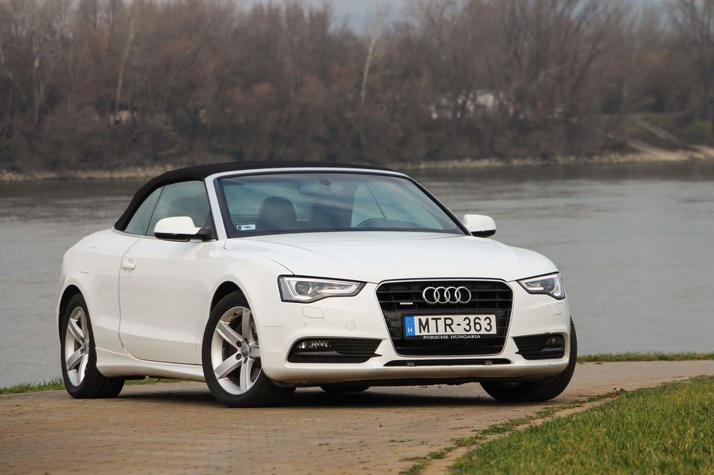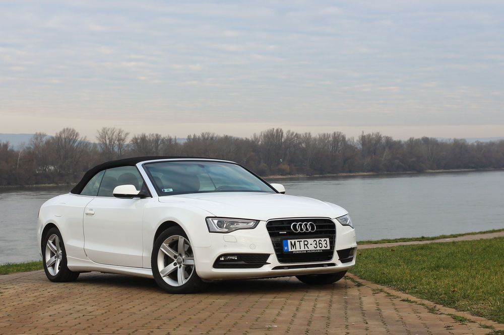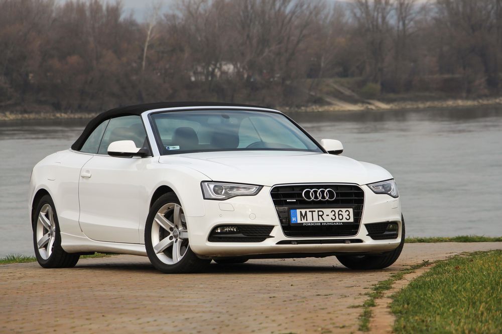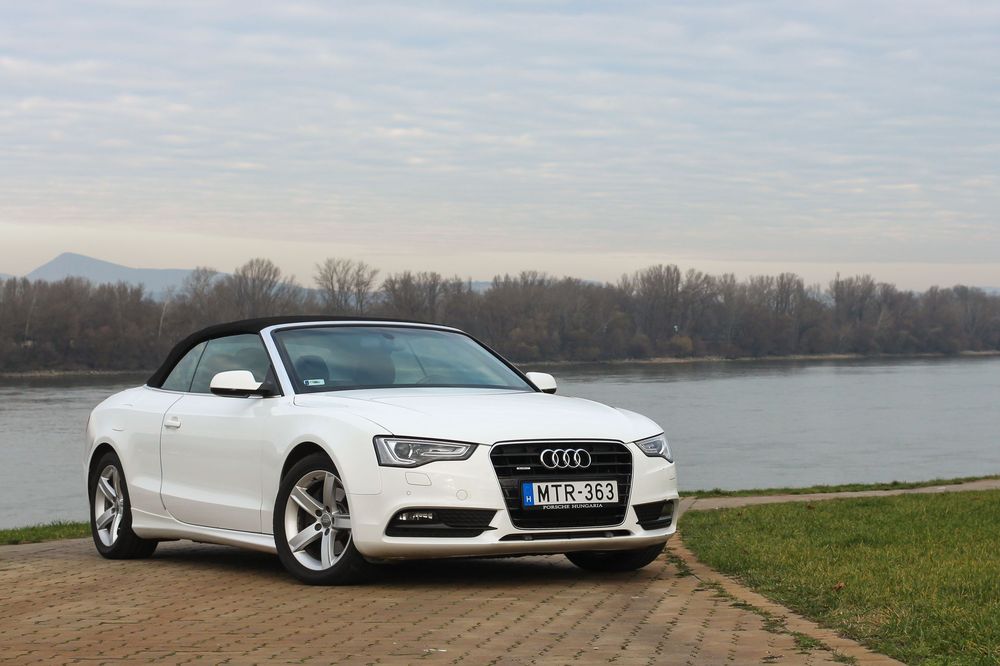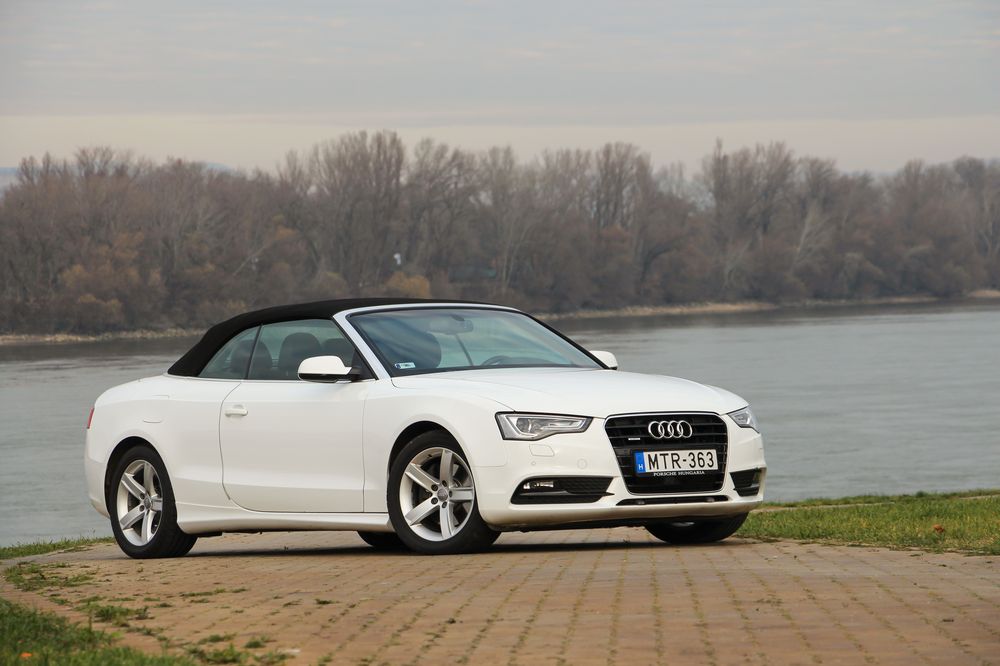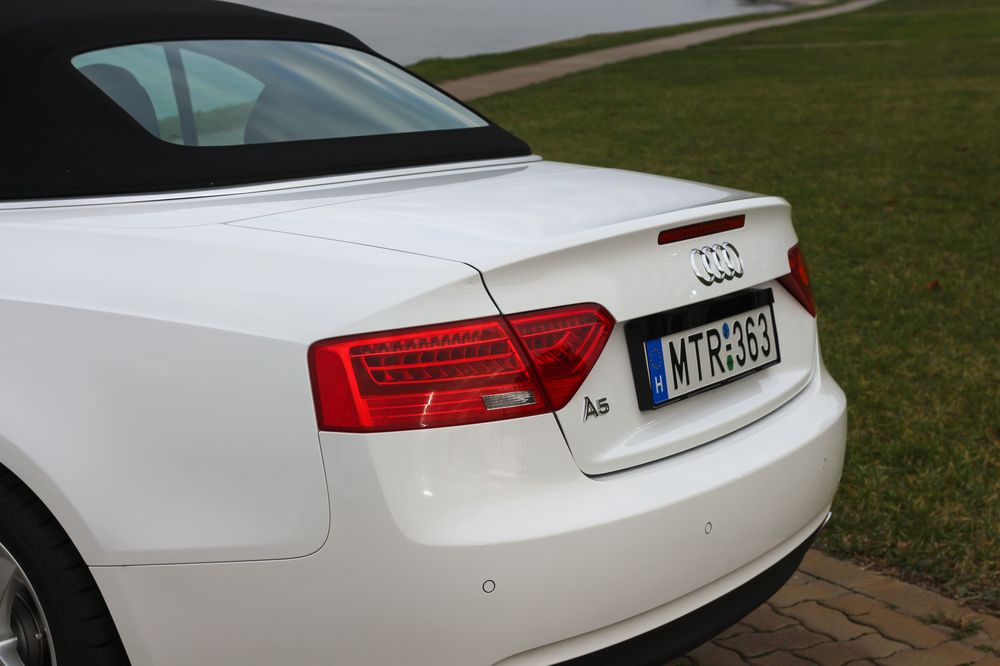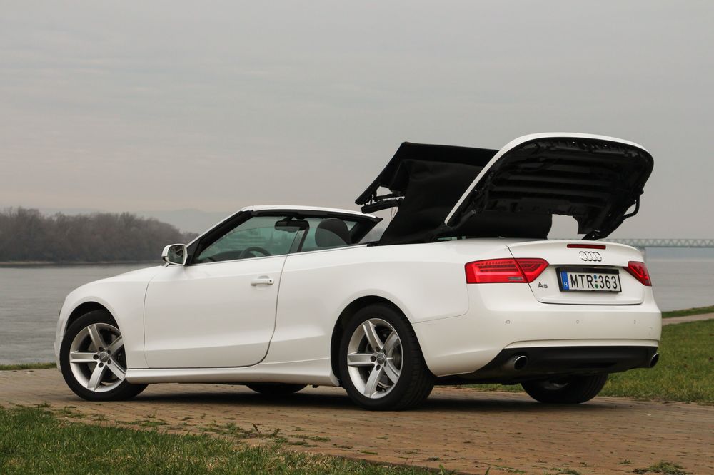 Duplakuplungos, az Audi terminológiája szerint S tronic a TFSi benzinmotorhoz csatlakozó hétfokozatú automataváltó, quattro, azaz állandó és Torsen differenciálműves az összkerékhajtás, adaptív és hangolható lengéscsillapítós a meglehetősen igényes, elöl kettős keresztlengőkaros, hátul oldalanként ötkaros független futómű. A felnik „csak” 17 colosak, de nem teljesen alapok, azok ugyanis 225/50 R17-es abroncsokat kapnak, ezekre az ötküllős kerekekre pedig 245/45-ösök kerültek – Continental Sport Contactok. Azok sincsenek elkoptatva, hiszen a 2,5 éves autóban még 12 ezer kilométer sincs. Újszerűbb ez a kabrió, mint számos tesztautó, ami nálunk jár. Ezt a kategóriát ugyanis – nagyon helyesen – nem kapja meg mindenki. Nincs összekaristolva a kormány bőrhuzata, nincsenek megütve a felnik, nincs gépi mosóval széjjelkaristolva a gyöngyházfehér fényezés.