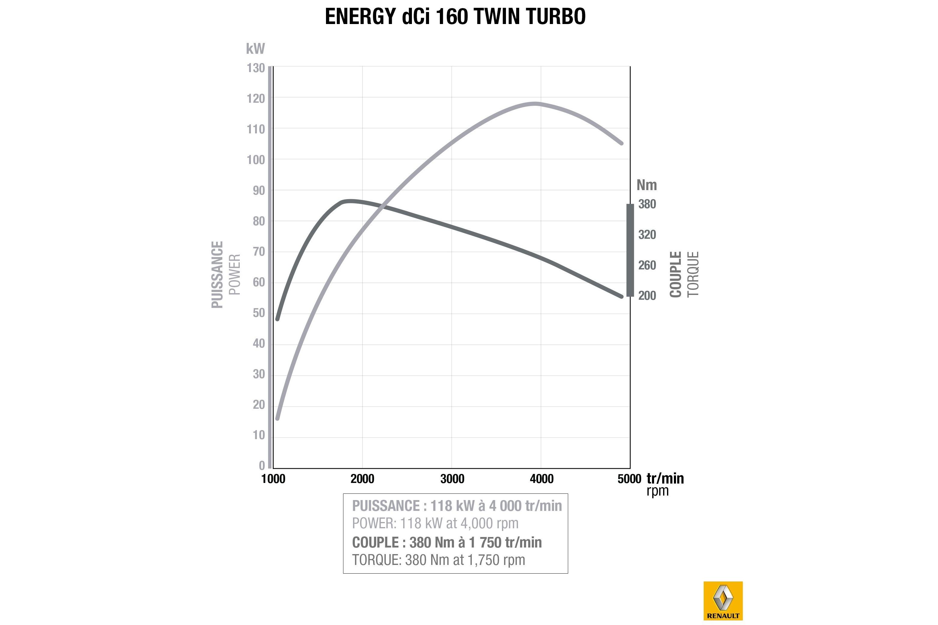 A Renault-nál is gőz-, pontosabban dízelerővel folyik a motorok méretcsökkentése. A kínálat legújabb tagja a már ismert 1.6 Energy dCi duplaturbós változata, amit a jövőbeli középkategóriás és annál nagyobb modellek fognak megkapni. Erőben tud annyit, mint a kétliteres gázolajosok, de azokhoz képest 25 százaléknyi fogyasztáscsökkenést lehet vele elérni, ami természetesen a szén-dioxid kibocsátásra is jótékonyan hat. Az ikerturbós technológia használata lehetővé teszi, hogy a nyomaték már alacsony fordulaton elérhető legyen, ugyanakkor magasabb fordulaton nagy teljesítményt adjon le a motor. Ezt a könnyen felpörgő, kisebb tehetetlenségű és a több levegőt szállító nagyobb turbó eltérő karakterével oldották meg a fejlesztők.