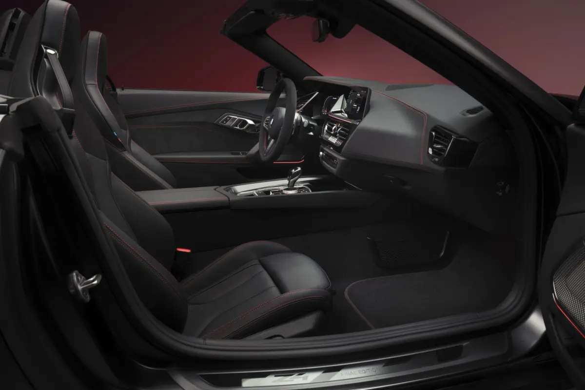 A Z4 Final Edition csomag látványos ismertetőjegye a mattfekete fényezés, amellyel tökéletesen harmonizálnak a magasfényű vörös féknyergek. Bent ugyancsak vörös kontrasztvarrás teszi egyedivé, amely a műszerfal, a középkonzol és az ajtókárpitok mellett a Vernasca bőr/Alcantara kettős borítású BMW M sportülésekre is kiterjed. Az Alcantara borítású sportkormány is ugyanezt a vörös kontrasztvarrást viseli, továbbá egyedi gravírozású küszöblécek növelik az exkluzivitást.