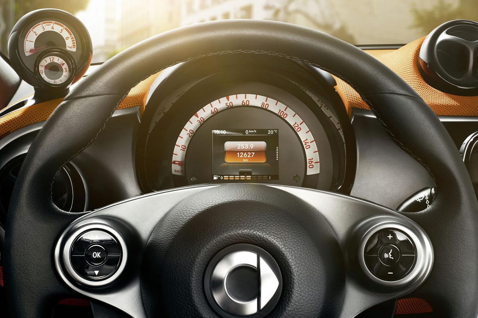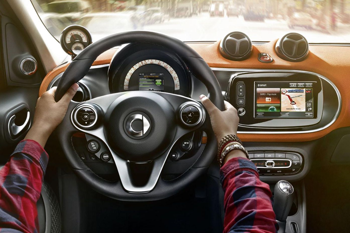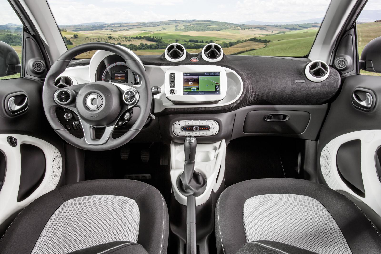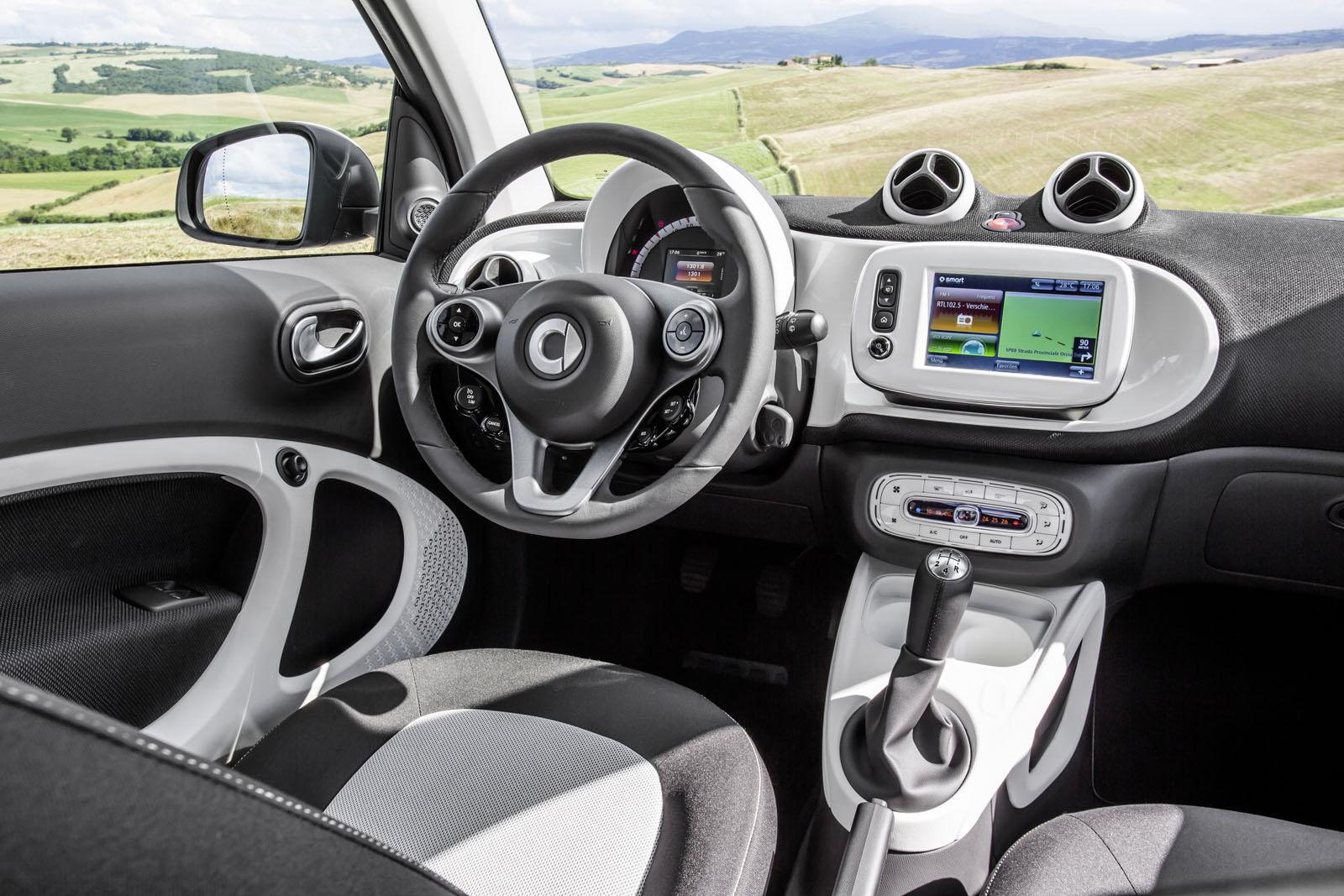 Nyilván ezerféle színben/dekorban pompázhat az utastér, a legjobban felszerelt smartok középkonzolján ilyen színes, szép nagy kijelző trónolhat okostelefon-kompatibilis multimédiával, opciós JBL hifivel. A menetstabilizáló visszagurulás-gátlós, alap az oldalszél-érzékenységet mérséklő rendszer és a térdlégzsák is. Ráfutásgátló, miegyéb (kulcs nélküli nyitás, tempomat, ülésfűtés) is lesz az extralistán