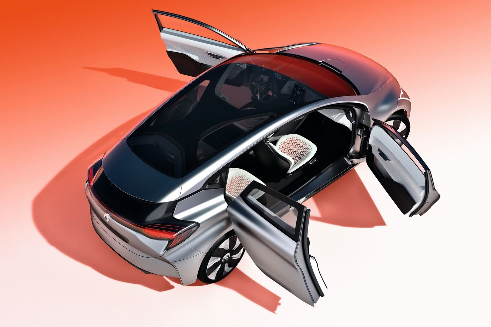 Méretadatok egyelőre nincsenek, az viszont jól látható, hogy a Hyundai Velosterhez hasonlóan a sofőr oldalán egyetlen, az utasén két, egymással szembe nyíló ajtó van a független négyüléses utasterű Eolabon. A panorámatetős, meredek farú karosszéria is egyedi, de még érdekesebb a hajtáslánc. Az 1 l/100 km-esnek és 22 g/km CO2 emissziójúnak mondott ciklus szerinti étvágy ugyanis egyértelműen arra irányítja a figyelmet. A Renault szerint 10 év múlva is lesz benzinmotor az autókban, az Eolab gépházába 1,0 literes, 75 lóerős, 95 Nm nyomatékú szívó benzinmotor kerül (az elképzelések szerint) és van benne egy 67 lóerős, 200 Nm állandó nyomatékú villanymotor is. Váltója 3 fokozatú, kuplung nélküli, s a villanymotort is magába foglaló. Utóbbit 6,7 kWh-s lítium-ion akkumulátor táplálja, a hibridrendszer kombinált teljesítménye 122 lóerő, azaz az egységesen az első kerekeket hajtó motorok ereje részint összeadódik. A konnektorból tölthető hibrid 60 kilométert tud megtenni emissziómentesen, utána és 120 km/órás tempó felett mindenképp jár a villanymotor is. Ami pedig a fogyasztást illeti: az 1 l/100 km érték telített akkukkal indulva értendő, akkor 60 kilométert emissziómentesen, majd 40 kilométert 1 liter benzinnel tesz meg, lemerült akkumulátor esetén 2,5 liter üzemanyag is kell 100 kilométerre, ami még mindig igen barátságos érték.