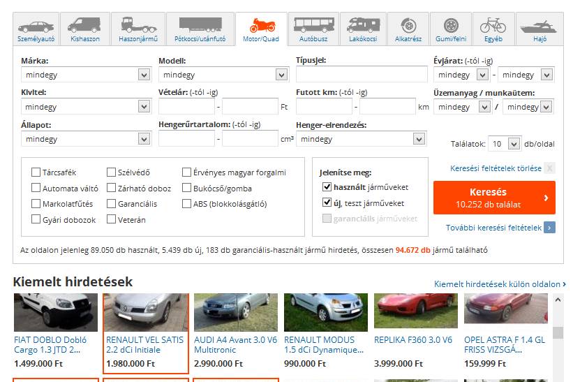 A Használtautó.hu rendszerében is lehet keresni és szép számmal találni – motorral hajtott – kétkerekűeket. A személyautók után e kategória rendelkezik a legtöbb – cikkünk írásakor több mint tízezer – hirdetéssel. A keresés e kategóriában is egyszerű, a Használtautó.hu rendszerétől megszokottan minden főbb paraméter és ismertebb felszerelés, sőt a bővített keresésnél gyakorlatilag minden létező paraméter, illetve extra alapján, vagy annak kizárásával lehet válogatni a motorok között is, így aztán nem is meglepő, hogy a tavaszi időszakban a naponta érkező átlagosan 250 000 látogató összesen mintegy hatmillió motorkeresést indít.
