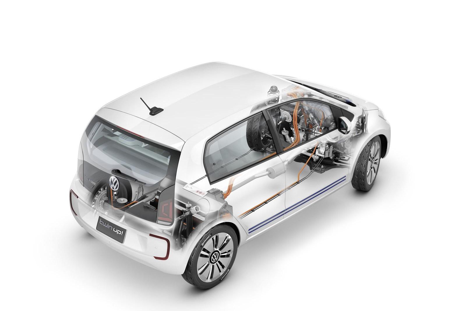 A twin up! egy ötajtós up! tehát az XL1 csöppet módosított hajtásláncával: 2 hengeres, 0,8 literes TDI Clean Diesel dízelmotor 48 lóerővel és 119 Nm nyomatékkal plusz dettó 48 lovas és 139 Nm-es villanymotor 5,5-ről 8,6 kWh-sra hizlalt lítium-ion akksiból táplálkozva plusz 7 fokozatú DSG duplakuplungos automata váltó. A rendszerteljesítmény 75 LE, az együttes nyomaték 215 Nm. Tisztán villanyosan 60 km/órás sebességre képes a nem lepkesúlyú, 1,2 tonnás, négyszemélyes kocsi, ezt a tempót 8,8 mp alatt éri el. Százra – üzemanyagot is égetve – 15,7 mp alatt gyorsul. Végsebessége elektronika korlátozta 125-140 km/óra, ígért fogyasztása 1,1 l/100 km. Emissziómentes hatótávja 50 km, üzemanyagtankja 33 literes – ritkán látogatja majd a kutakat.