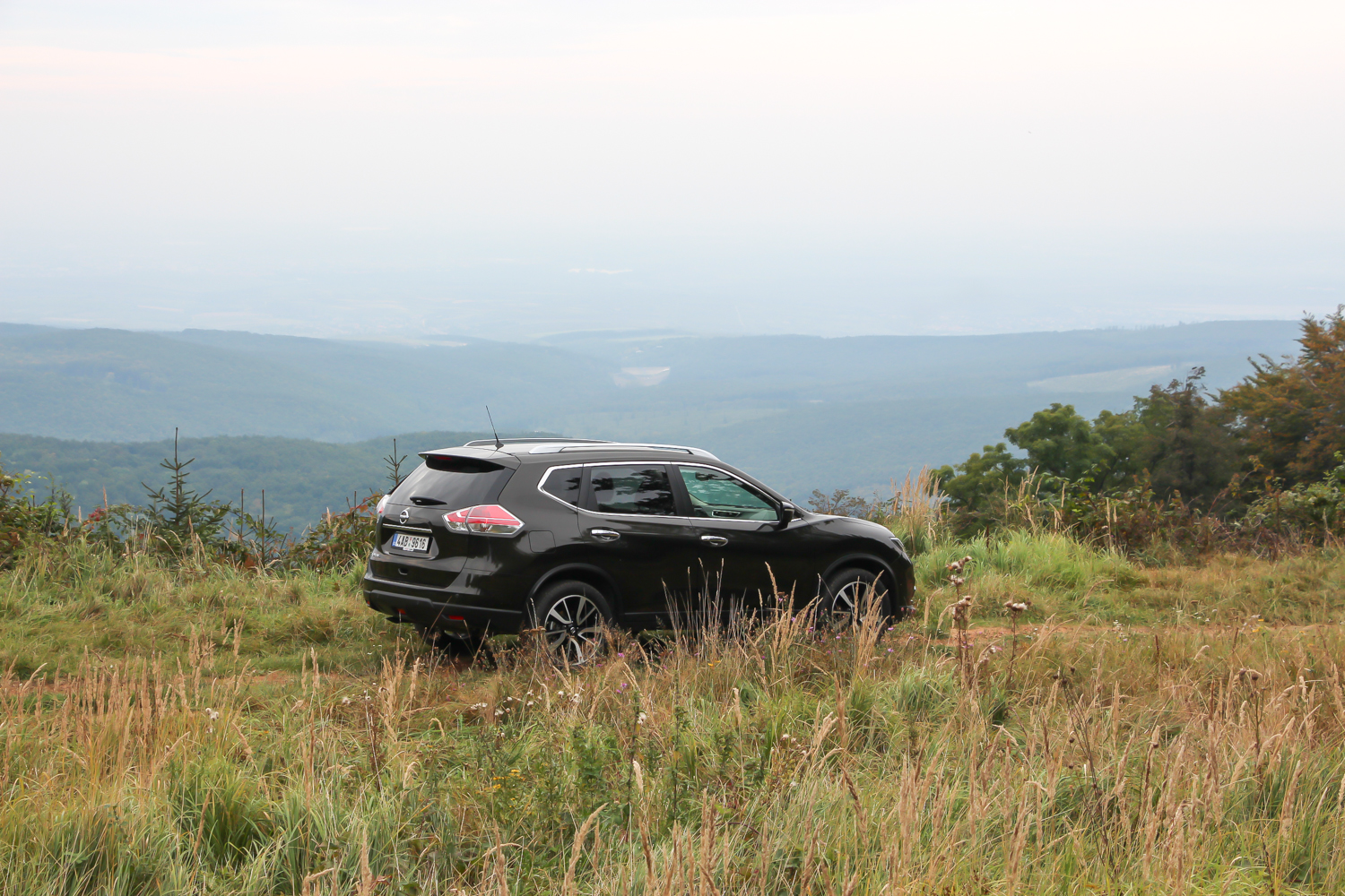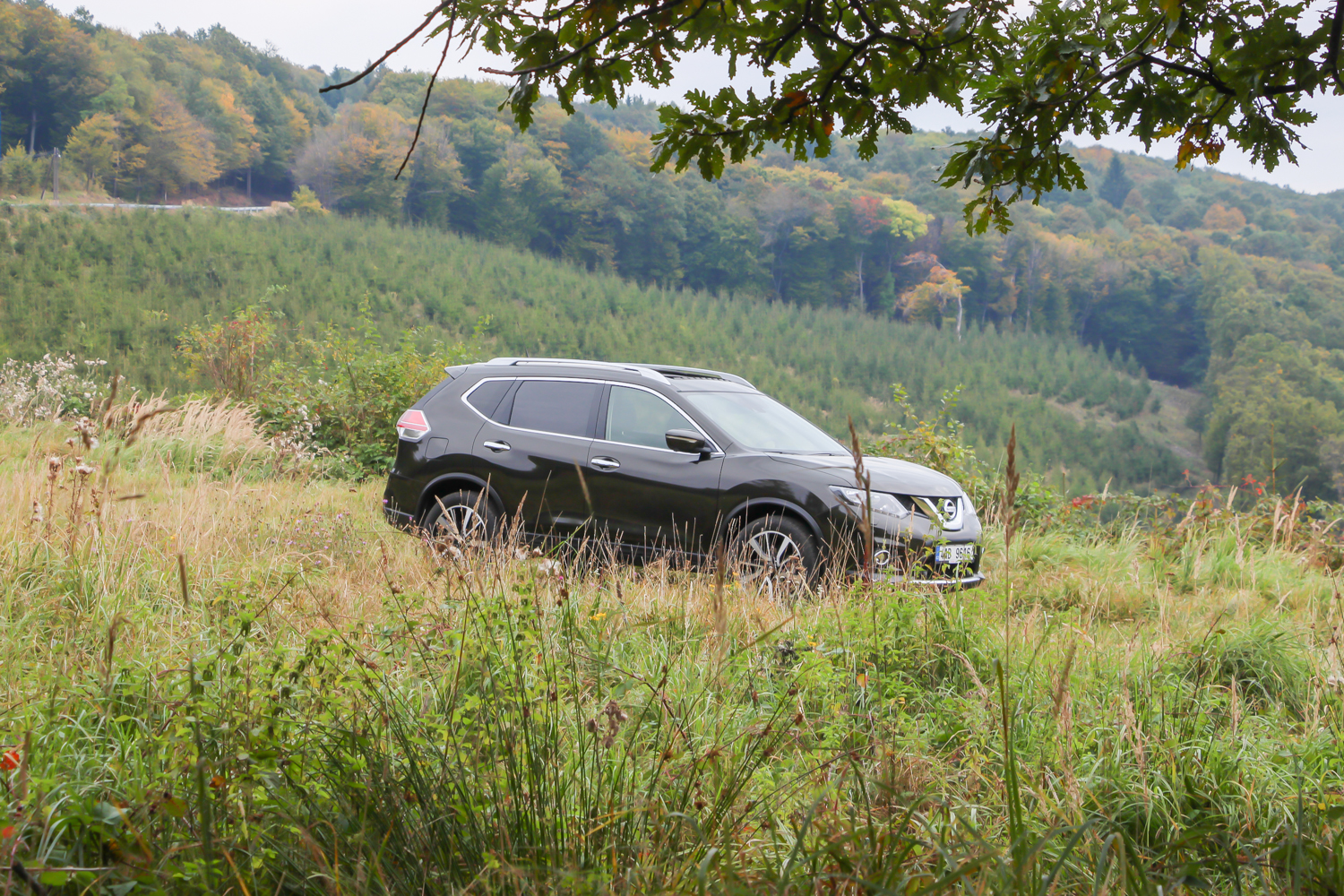 Az automata verziót nem próbáltam, de eleget elmond róla, hogy a földutas, köves, erdeiutas tereptúránk alatt a kollégák ugyanúgy végigmentek vele, ahogy mi az összkerekessel. Sőt, ők nem fulladtak le, nekem viszont egy vízmosáson felfelé többször is sikerült. Oda az egyes is sok volt, felezni kellett volna. Így van ez, nem csak városba, terepre is jobb az automata váltó. A visszagurulásgátló hatásos, csak extrém esetben a motor nyomatékcsúcsa fölé kell pörgetni, hogy csúsztatott kuplunggal tényleg elmenjen az autó. Az extremitást persze itt úgy értem, hogy a terepjárós magazinoktól delegált kollégák azért több dagonyázást vártak volna, hiszen a mi terepútvonalunkon mondjuk egy Fiat Albea, vagy egy Renault Thalia is simán elmenne. Pusztán hasmagassággal meg lehetett mindent oldani. A pláne ebben az, hogy a leendő új X-Trail tulajok nagy része sosem fogja ilyen környezetbe vinni a családi autót. Nem fog köveket görgetni a 19 colos kétszínű felnikkel, belógó ágakkal sem karcolja majd meg az autó oldalát és nem fogja a bakháton növő kalászok dobolását sem hallani az alsó burkolatok felől. Mi próbajelleggel megtettük, rendben volt minden, de a kisebb sziklákon áthajtva az üvegtető párszor megnyikkant – ez nem rossz, mert van olyan más modell, ami fekvőrendőrön is így tesz. Az All-Mode 4×4 rendszer nem erre való, hanem arra, hogy síeléskor, a hágó tetején fekvő kis családi panzió megközelítése se lehessen gond. Természetesen csakis egy garnitúra jó téli gumival.