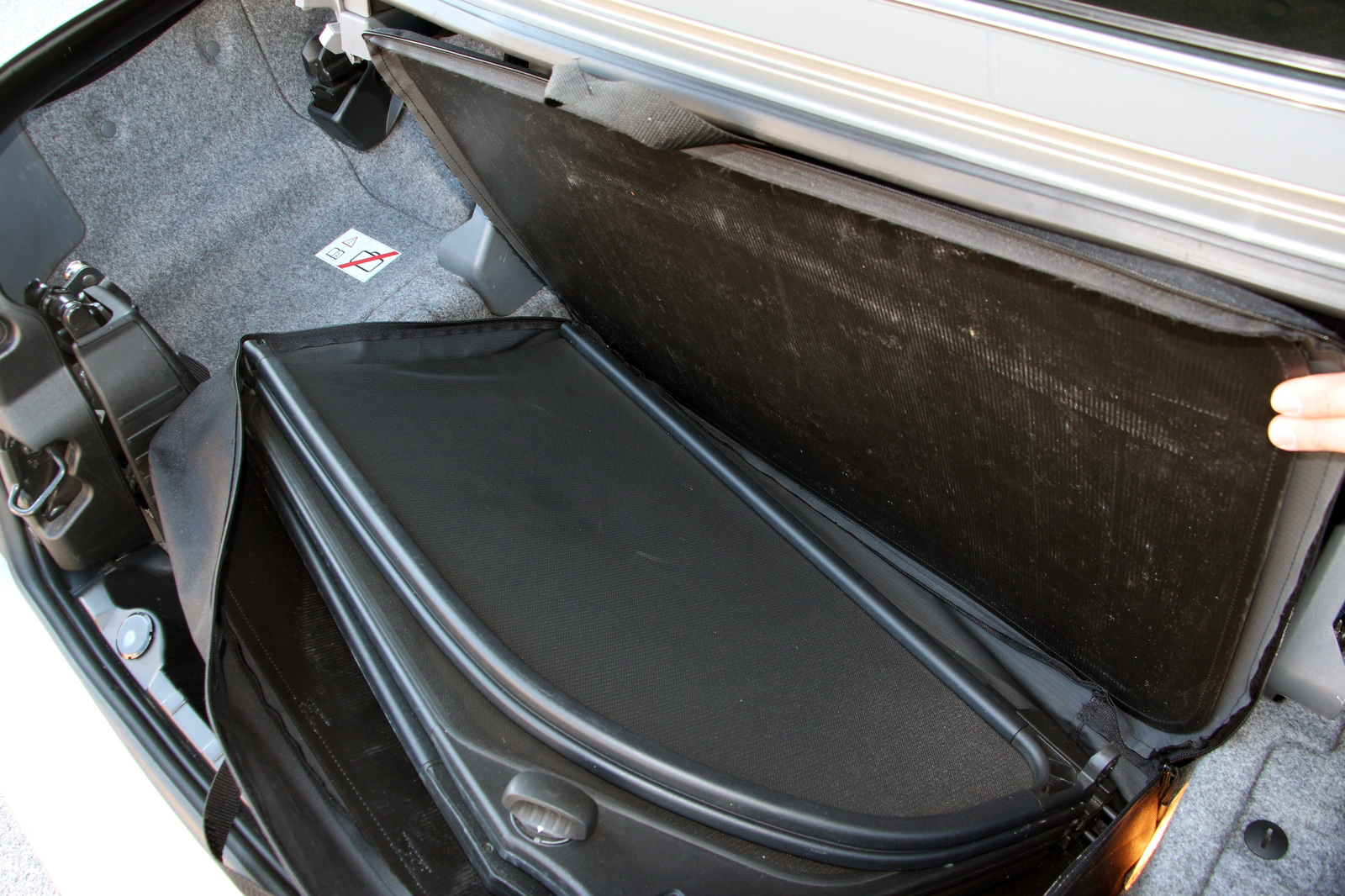 Ebbe, a most 5,5 éves, 91 ezer kilométert futott, és épp eladósorban lévő 330i-be 3 Celsius fokos külső hőmérséklet és verőfényes napsütés mellett ülhettem bele. Mi más lehetett volna az első gondoltam, mint az, hogy le kellene nyitni a tetőt. Nem több ez, mint a kézifék melletti gomb megnyomása, s ha a csomagtérben le van húzva a szeparáló, akkor már nyílik is a tető. Ugyanez elérhető a kulcsról is, ha a nyitógombot ott nyomjuk folyamatosan. Alap, hogy az amúgy kivétel nélkül automata elektromos ablakok közös gombbal is húzhatók le-fel, a szélvédő pedig még nem húzódik a fejünk fölé, de azért elég jó védettséget ad. Van az autóban, pontosabban a csomagtérben saját, éppen a kerékdobok közötti részbe férő tokban utazó szélfogó is, akár azt is betehetjük. De nem nagyon kell, a fagypont körüli hőmérsékletben, persze kabátban, sapkában és sálban, felhúzott ablakokkal, valamint a háromfokozatú ülésfűtést élvezve simán mentem nyitott tetővel még 100 km/órás tempóval is, s egyáltalán nem volt hideg vagy túlzott huzat az autóban.