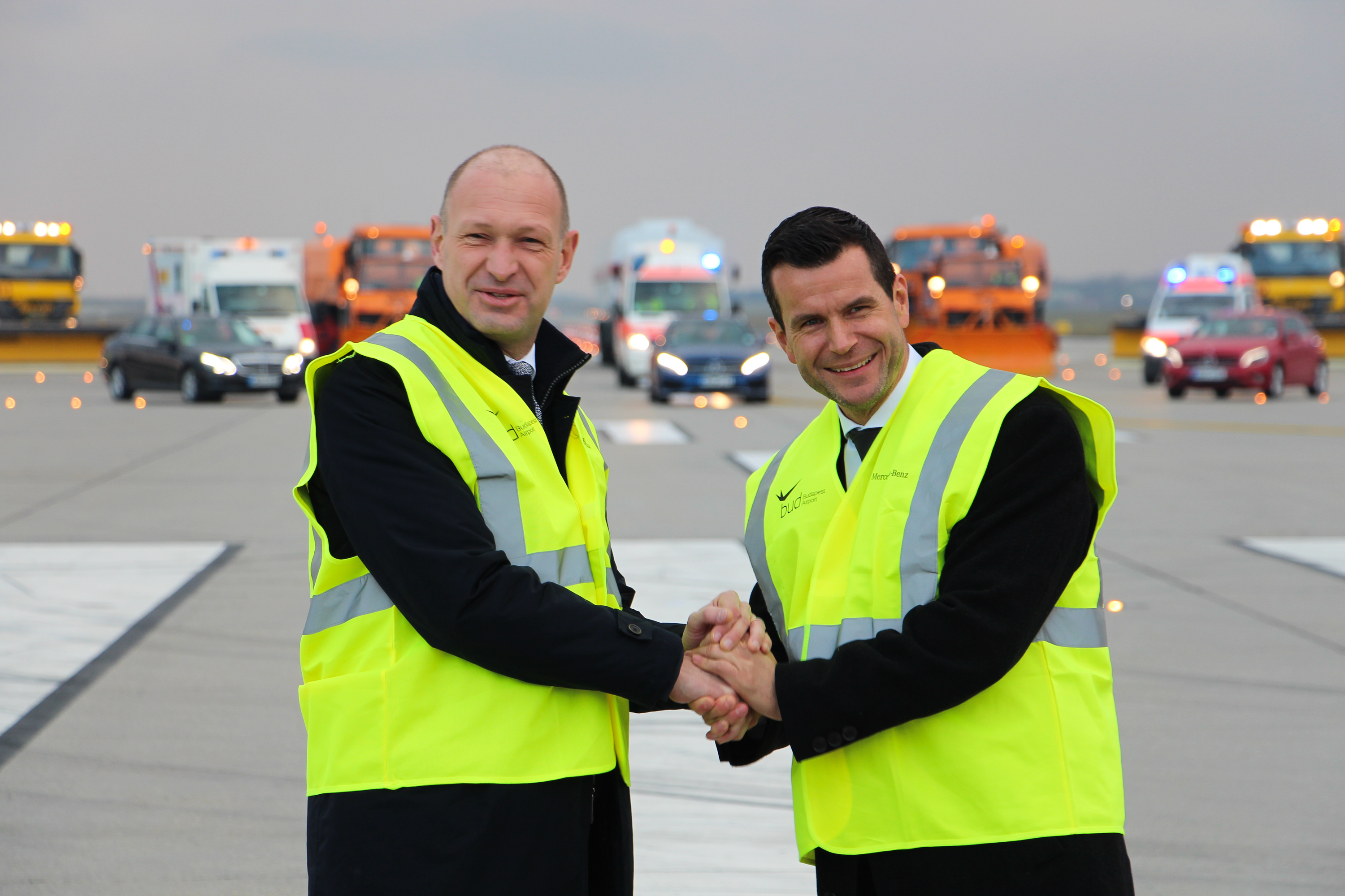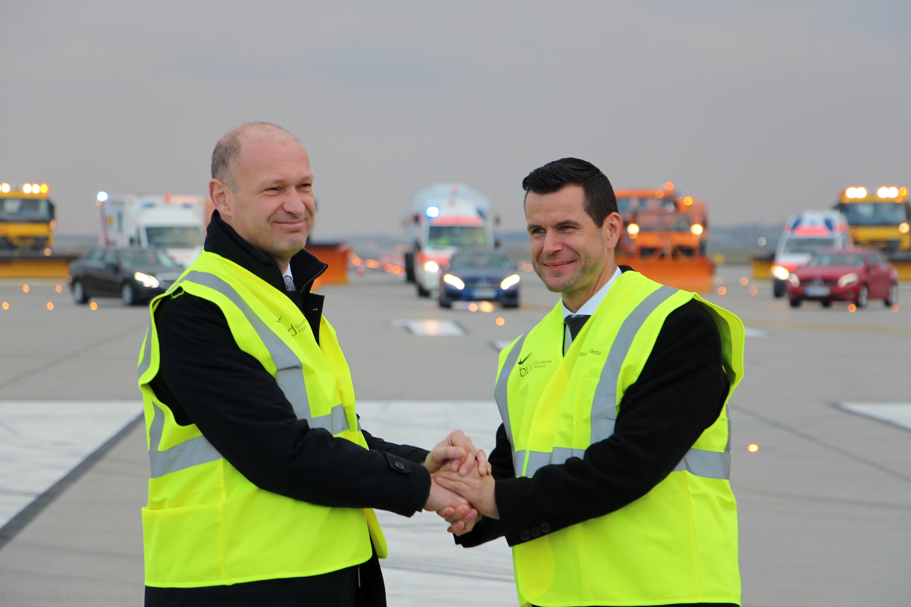 Balról jobbra Jost Lammers, a Budapest Airport vezérigazgatója és Ingo Fröhlich, a Mercedes-Benz Hungária Kft. ügyvezető igazgatója – nem csak egymást, a megállapodást is üdvözölték