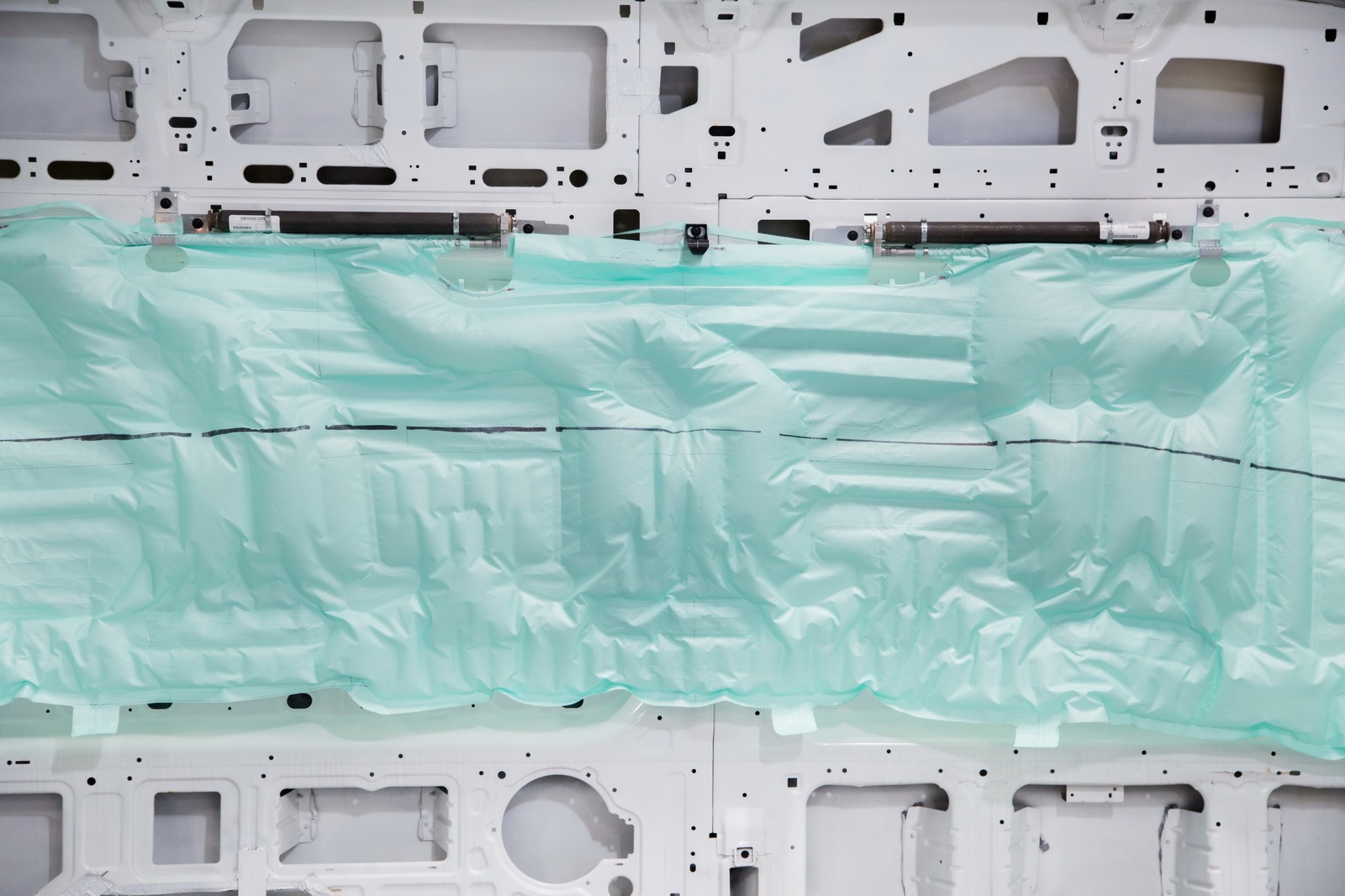 A normál személyautók fejlégzsákjának méretben a jó háromszorosa a 15 személyes Transit busz komplex oldallégzsákja
