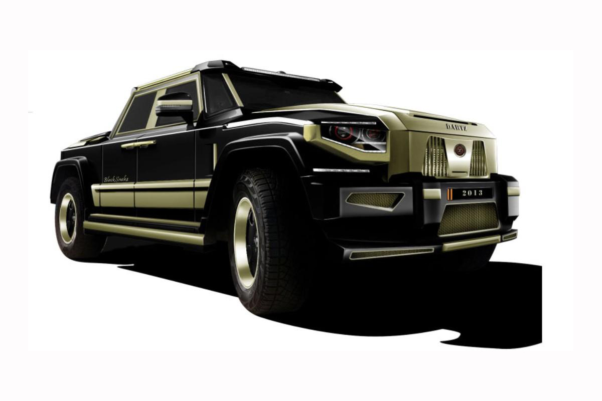 Alapja Mercedes GL 63 AMG, arannyal és gyémánttal díszítették, 1 millió dollárba kerül, és ez a cég első nem páncélozott autója: a orosz Dartz bemutatta legújabb modelljét, a Black Snake-et, vagyis a fekete kígyót. Megjelenése a cég korábbi járműveiről már ismerős szerénytelen agresszivitást tükrözi zord dobozformában. LED-sorból oldalanként csak négy különállót szereltek az elejére, de úgy tűnik, mintha a lámpaburában is rejtőzne egy, nem beszélve a tetejét és farát ékesítő fénycsíkokról, így tulajdonosa egész évben karácsonyi hangulatban közlekedhet a monstrummal. Apropó, ékesítés: orrán valódi gyémántokkal kirakott kígyófigura található, ami a Dartz lett agytrösztje, Leonard F. Jankelovics marketingérzékét dicséri. Az idei ugyanis a kígyó éve Kínában – tavaly is mindenki jól meglovagolta a sárkányét -, Jankelovics pedig a gazdag kínai vevőket veszi célkeresztbe új monstrumával.