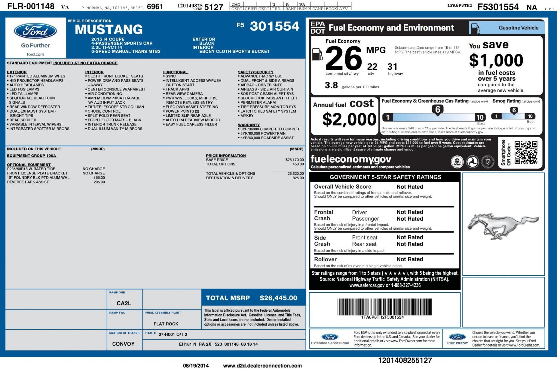 Az állítólagos kiszivárgott dokumentumok szerint a Mustang új négyhengerese kézi váltóval 9 litert kér majd vegyesben, míg városban 10,7-et, országúton meg 7,6-ot. Ezek az értékek nem rosszak, de az Amerikában alap V6-os fogyasztása romlott: 13,9 városban és 8,5 országúton a bűvös érték. Automatával a V6-os jobb városban, azzal „csak 12,4 litert kér. Összevetve a korábbi Mustanggal, abból a V6-os automata országúton 8 decivel kevesebbet kért, a Chevrolet Camaro viszont ugyanennyi benzinnel megy el.