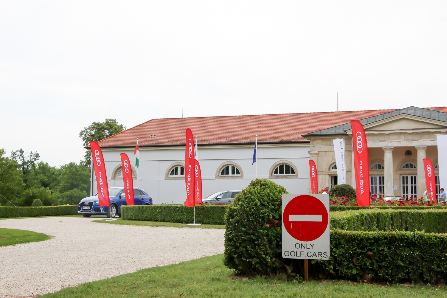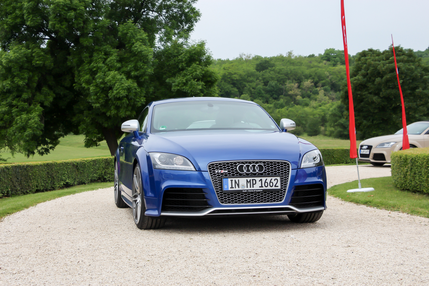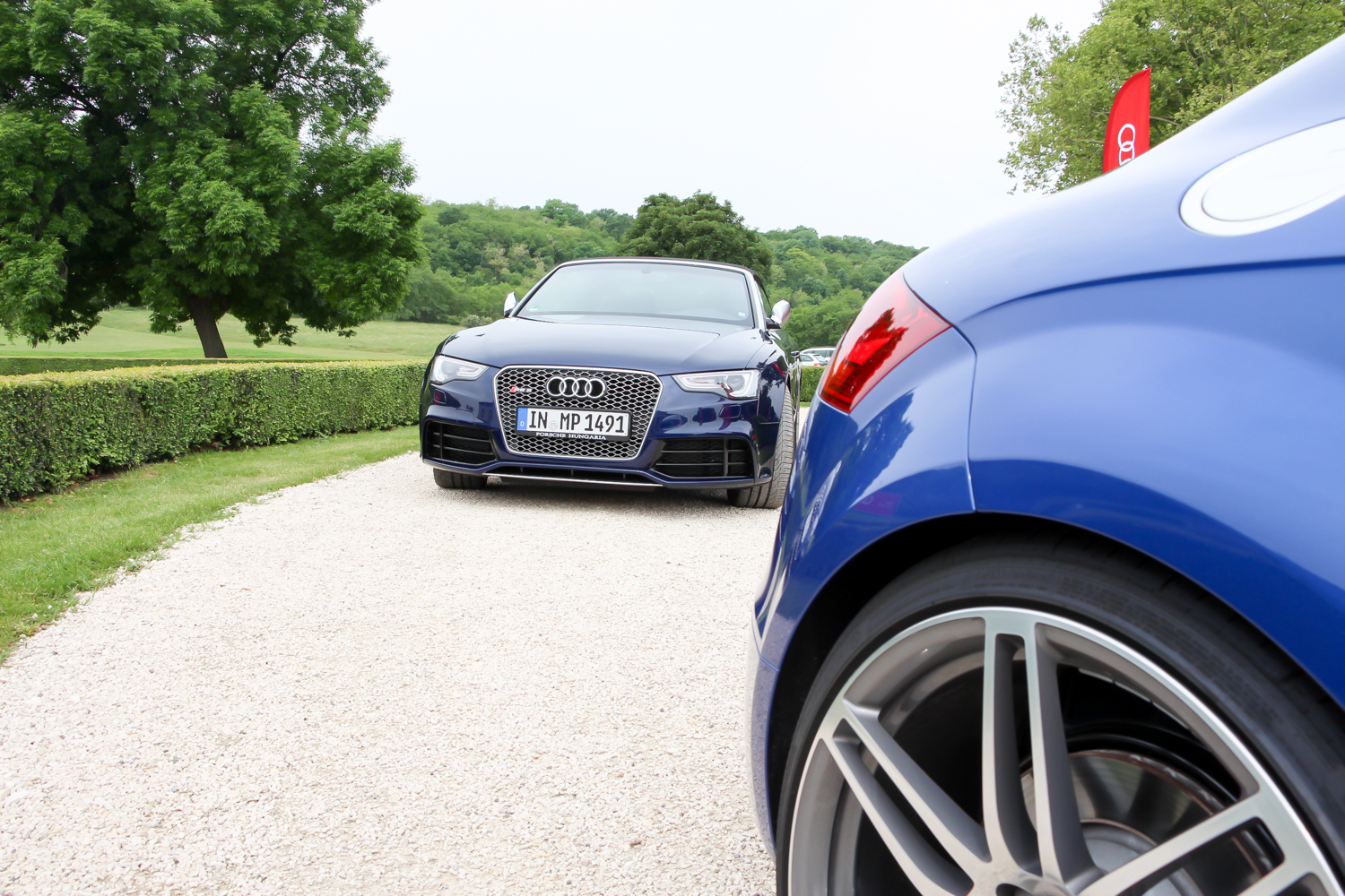 Személy szerint én nagyon szeretem az Alcsútdobozt Etyekkel összekötő 8106-os utat, ezért ebből az irányból közelítettem meg az Audi quattro Golf Kupa helyszínét, ahova az Audi RS modelljeit hívtak kipróbálni. A gyönyörű park felhajtóján elhelyezett Only golf cars felirat sem rettentett meg, mert tudtam, hogy a 8 colos kerekű kis villanyautók mellett ma rendes benzinesek is lesznek itt. A rózsabokrok mögött Volkswagen Golf egyáltalán nem volt, a lapos fekete R8-as is csak alig látszott. Hogy ezt is lehet majd vezetni? Hűha, na ez már egy kicsit megrettentett. Autósújságírói praktika az ilyen menetpróbáknál a fokozatosság elve, eszerint haladva egy TT RS Plus Roadsterben kezdtem a vezetést.