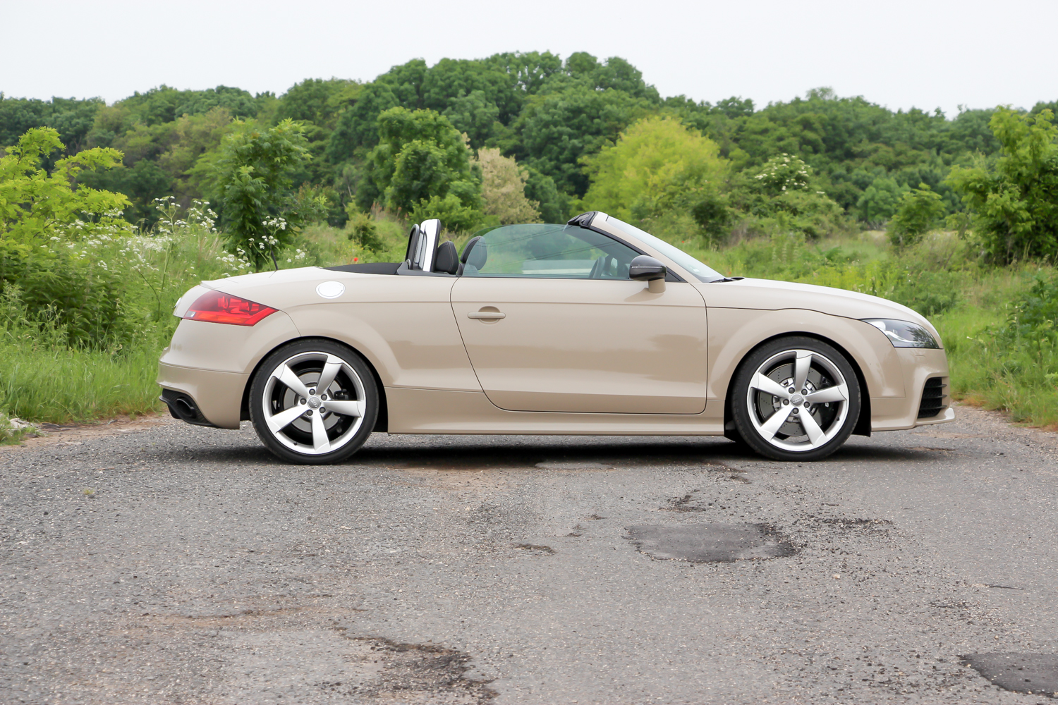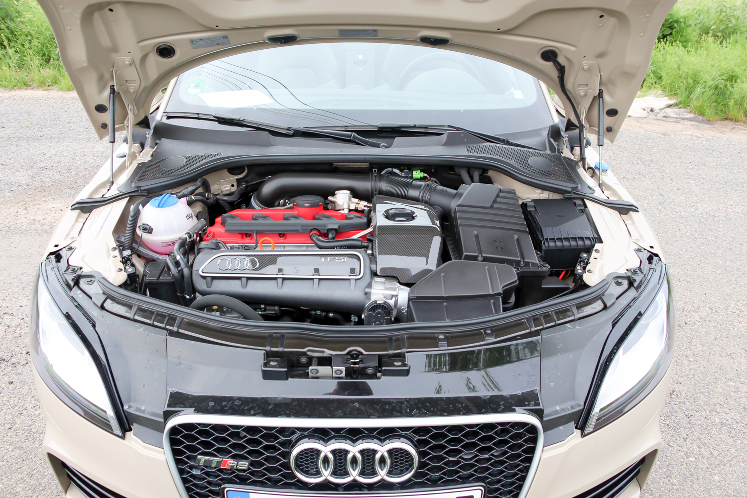 Választhattam volna az RSQ3-ast is, amiben ugyanaz a soros öthengeres motor dolgozik, de itt már rögtön csaltam és a kompakt crossover helyett az 50 lóerővel erősebb, kéziváltós nyitott sportkocsi kulcsát markoltam fel. Ez 4,4 másodperc alatt van százon és 280 km/h a végsebessége. Mindezt egy igazi soros, turbós öthengeres motor erejéből, aminek a génjei között elvileg ott van az ős quattro raliváltozata is. Persze abban még hosszában állt a motor, viszont a legelső, 1980-as változat gyengébb volt ennél az utcai kocsinál – durva ahogy az autók erősödnek. Mint minden RS modellnél, így a TT RS-nél is alapvetés a quattro állandó összkerékhajtás. Mivel a TT az 5-ös Golf padlóvázára épül – ahogy a korábbi Audi RS3 is – nem a legendás Torsen központi differenciálmű a rendszer lelke, hanem a tömegmodellekéhez közelebb álló Haldex kuplungos egység jócskán felerősített változata viszi előre. Ettől függetlenül panasz nem lehet a teljesítményére, sem arra, ahogy azt az útra viszi.