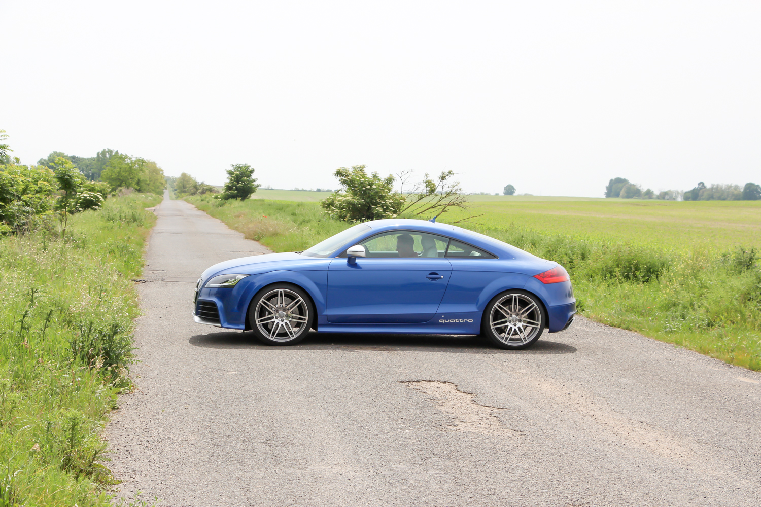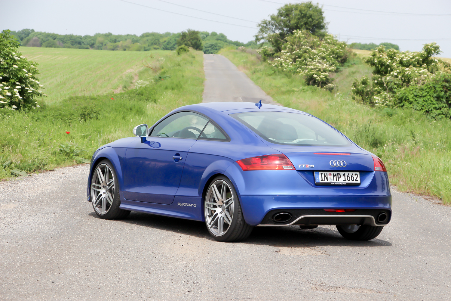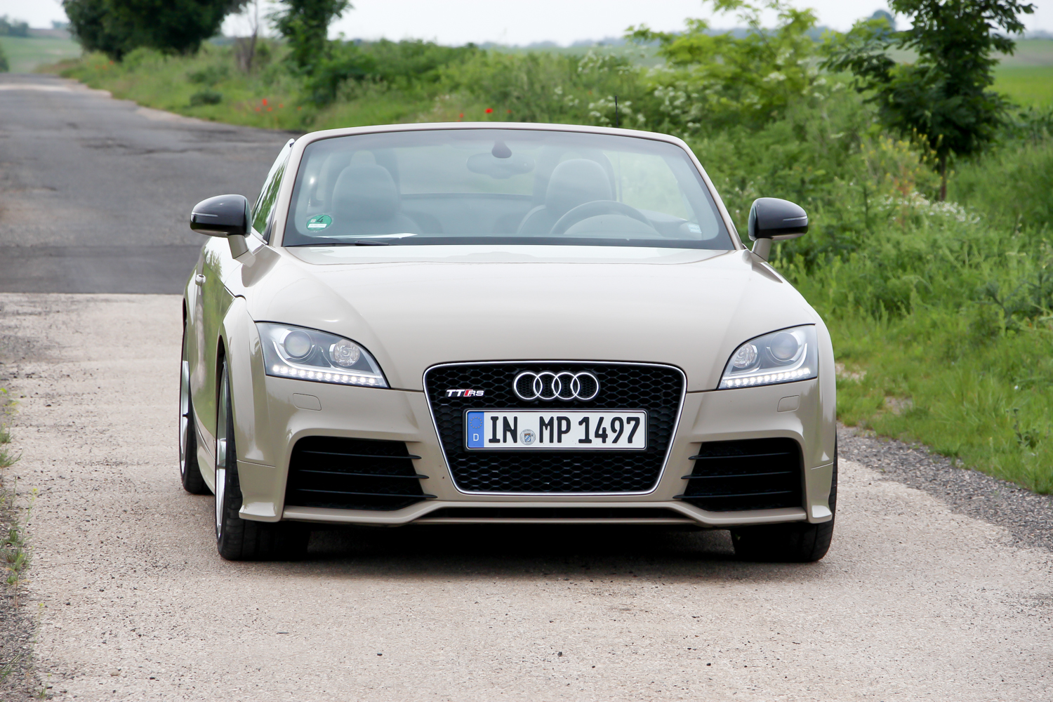 Fotózás ürügyén, a szervezők vendégszeretetét kihasználva elkértem a versenykék TT RS Plus kulcsát is. Mert az a kocsi tényleg nagyon jól mutat a nyári mezőben, meg igazából az a legkedvesebb az én szívemnek. 360 lóerejével és 465 Nm nyomatékával gyengébb az R8-nál, de könnyebb is vagy 200 kilóval és egy negyed méterrel rövidebb is nála. Majd húsz centivel rövidebb tengelytávja autópályán lenne csak hátrány, illetve az R8 áramvonalas kasztnijával versenypályán is sokkal jobban teljesítene nála. Hiába azonban, ha most épp magyar mellékutakon hajtjuk, változatosan rossz minőségű aszfalton, az előző éjszakai zuhét jelző löszátfolyásokkal tarkítva. Ide a kisebb és megengedőbbnek érződő autó jobban illik, a turbós motor is inkább elemében van, mint a szívó V8-as. A kanyar előtti visszaváltáskor ordít a sorötös. Nem úgy, mint amikor az R8 hiper automatája visszapakolja a fokozatot, nem is úgy ahogy az RS5 visszadurrog, sokkal kisfiúsabban, sokkal inkább a ’80-as évekre emlékeztetően – összességében nekem szerethetőbben. Tudom, hogy puha vagyok és kevés ehhez az autóhoz is, de imádom a motor orgánumát, a váltásaim magamhoz képest gyorsak és pontosak, a kormányt alig századmásodpercekig nem fogom két kézzel.