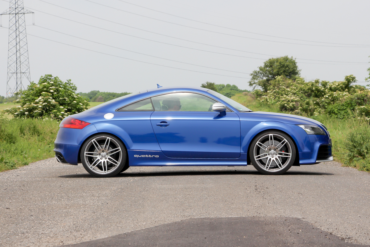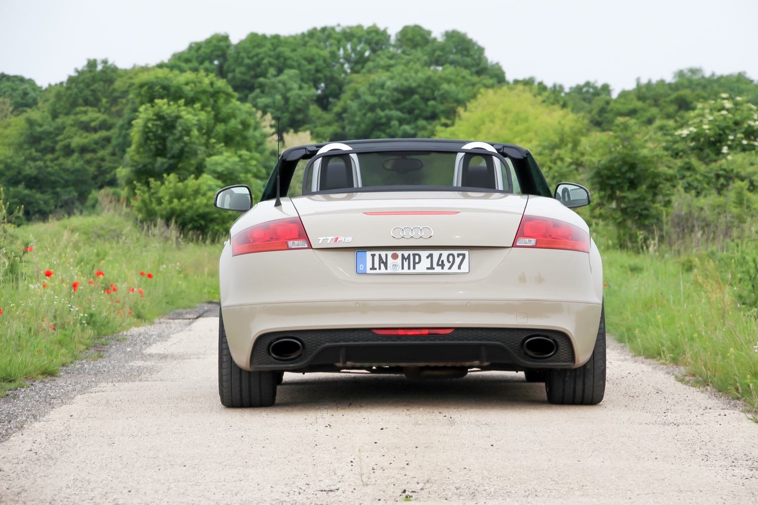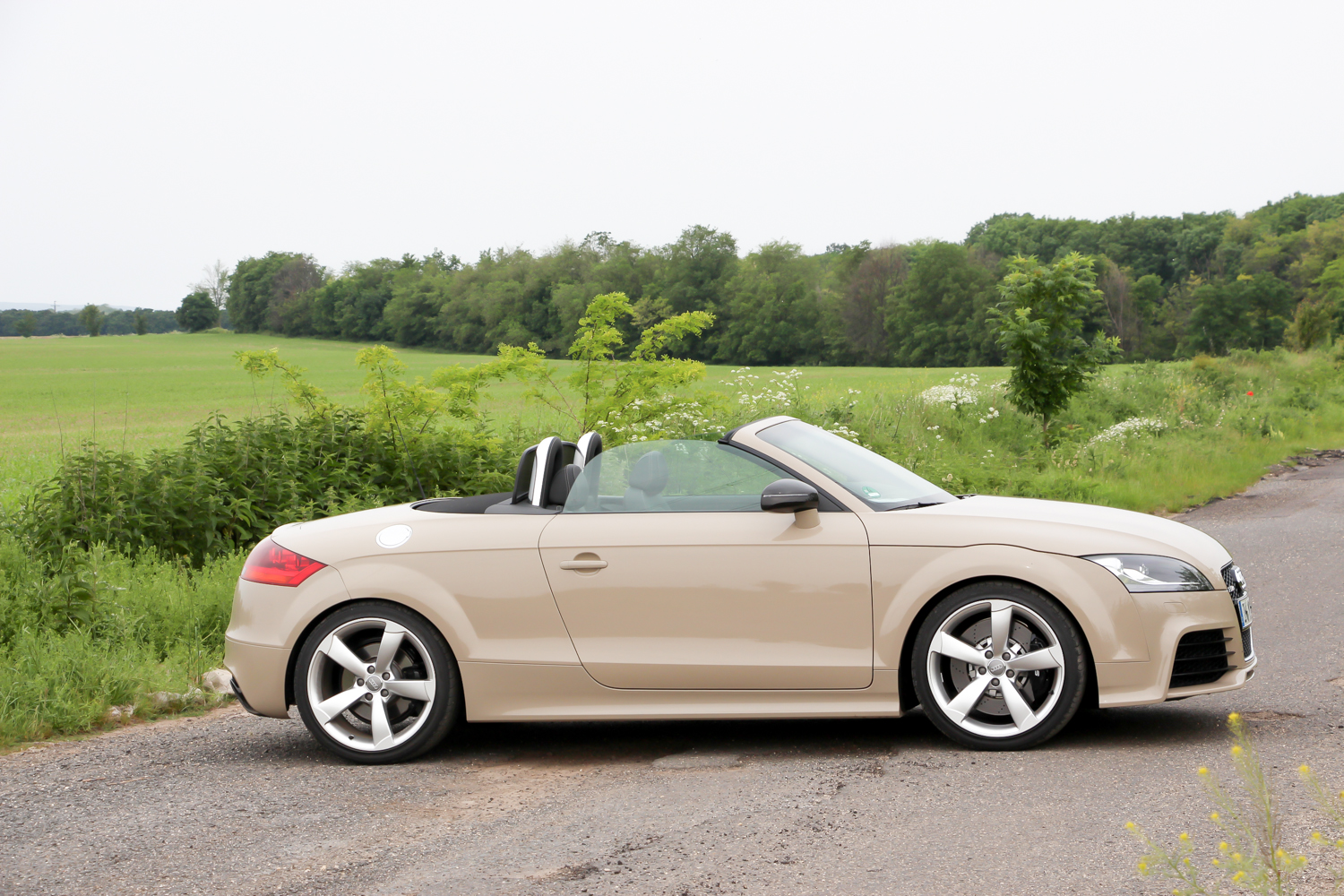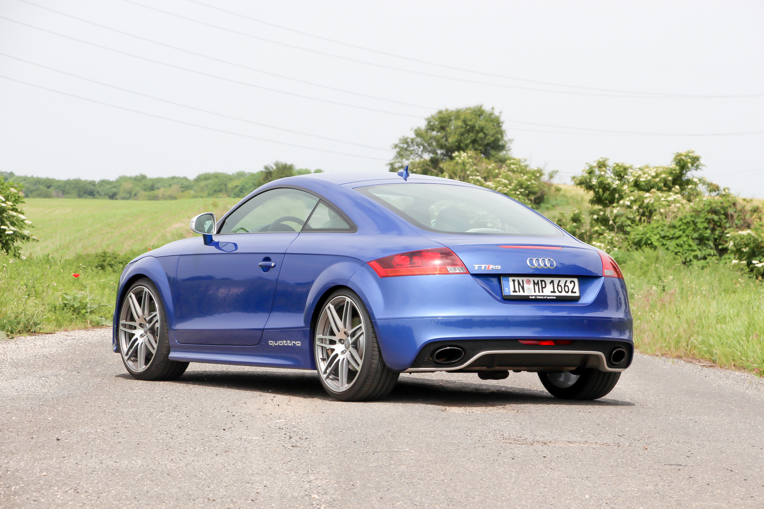 Fotózás ürügyén, a szervezők vendégszeretetét kihasználva elkértem a versenykék TT RS Plus kulcsát is. Mert az a kocsi tényleg nagyon jól mutat a nyári mezőben, meg igazából az a legkedvesebb az én szívemnek. 360 lóerejével és 465 Nm nyomatékával gyengébb az R8-nál, de könnyebb is vagy 200 kilóval és egy negyed méterrel rövidebb is nála. Majd húsz centivel rövidebb tengelytávja autópályán lenne csak hátrány, illetve az R8 áramvonalas kasztnijával versenypályán is sokkal jobban teljesítene nála. Hiába azonban, ha most épp magyar mellékutakon hajtjuk, változatosan rossz minőségű aszfalton, az előző éjszakai zuhét jelző löszátfolyásokkal tarkítva. Ide a kisebb és megengedőbbnek érződő autó jobban illik, a turbós motor is inkább elemében van, mint a szívó V8-as. A kanyar előtti visszaváltáskor ordít a sorötös. Nem úgy, mint amikor az R8 hiper automatája visszapakolja a fokozatot, nem is úgy ahogy az RS5 visszadurrog, sokkal kisfiúsabban, sokkal inkább a ’80-as évekre emlékeztetően – összességében nekem szerethetőbben. Tudom, hogy puha vagyok és kevés ehhez az autóhoz is, de imádom a motor orgánumát, a váltásaim magamhoz képest gyorsak és pontosak, a kormányt alig századmásodpercekig nem fogom két kézzel.
