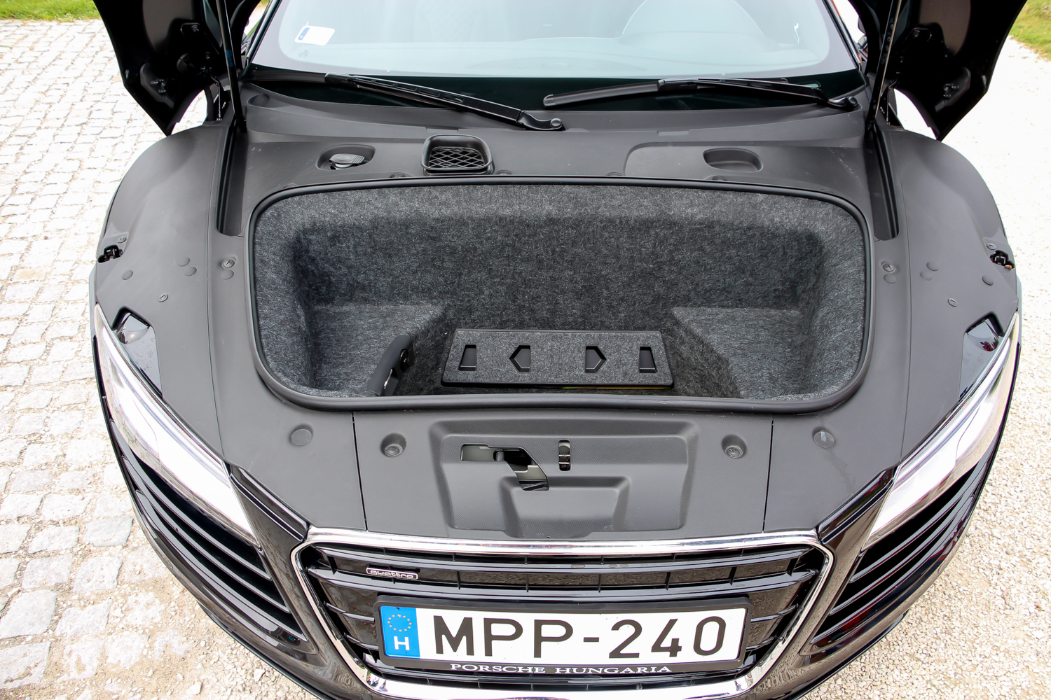 Nem érzem a váltót, és nem is élvezem a motor érces hangját, úgy kapaszkodok a kemény kormányba. Audis kísérőm olyan elnézően löki vissza a váltó hideg fémkarját az automata állásba, mintha én is egy potenciális ügyfél lennék. Pedig csak egy buta autósújságíró vagyok, aki minden képességét összeszedve is csak annyira képes, hogy feleslegesen tiltásig pörgeti a V8-ast. Pattogunk rendesen, a kifehéredett aszfalthoz képest a legközelebbi főút, a 811-es ócska burkolata is svájci autópályának hat. Visszatérve a bázisra alig bírok kikászálódni a kormányhoz közel húzott ülésből. Megvolt, nem hiába tartottam tőle, ehhez még kell ezt-azt tapasztalnom, hogy tényleg élvezni tudjam. Ettől függetlenül az R8, mint mérnöki munka megkérdőjelezhetetlen. A slusszpoén az, hogy egy kis megszokás után valóban alkalmas akár a napi bevásárlásra is, persze csak akkor, ha az elöl lévő lukba befér a motyónk.