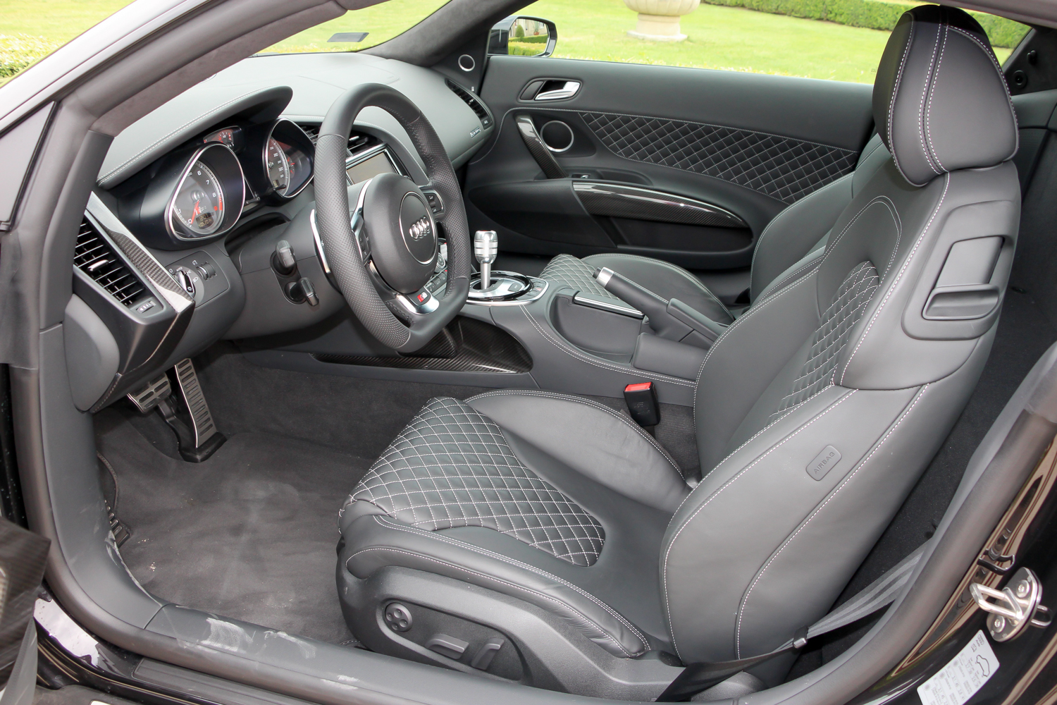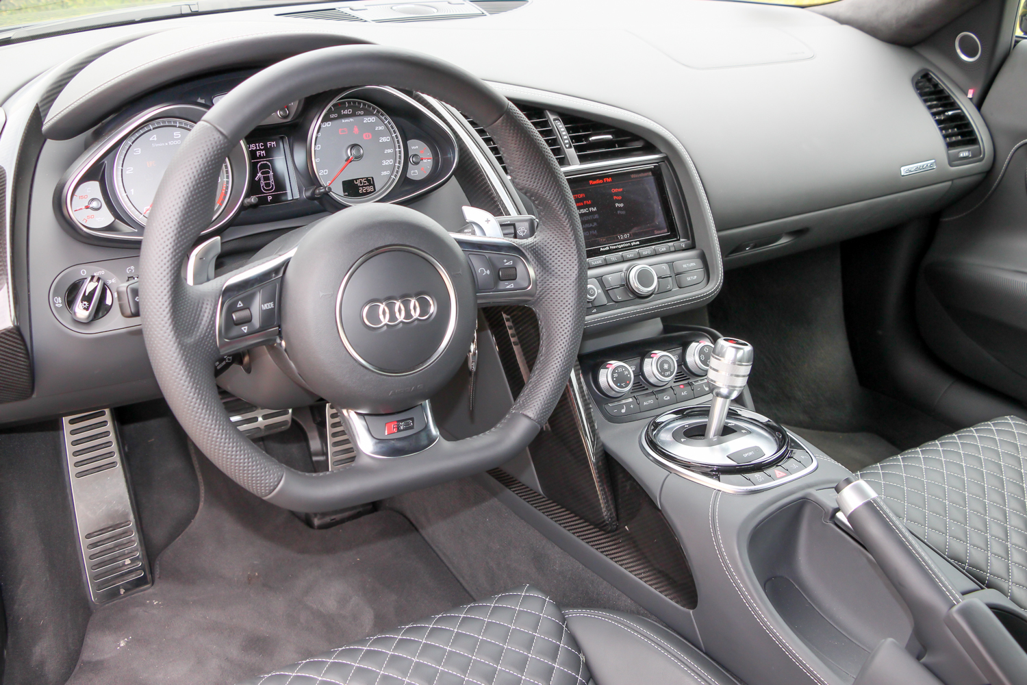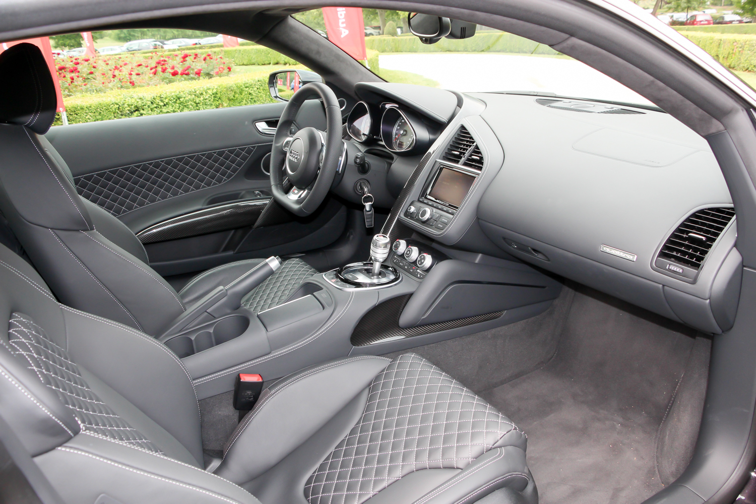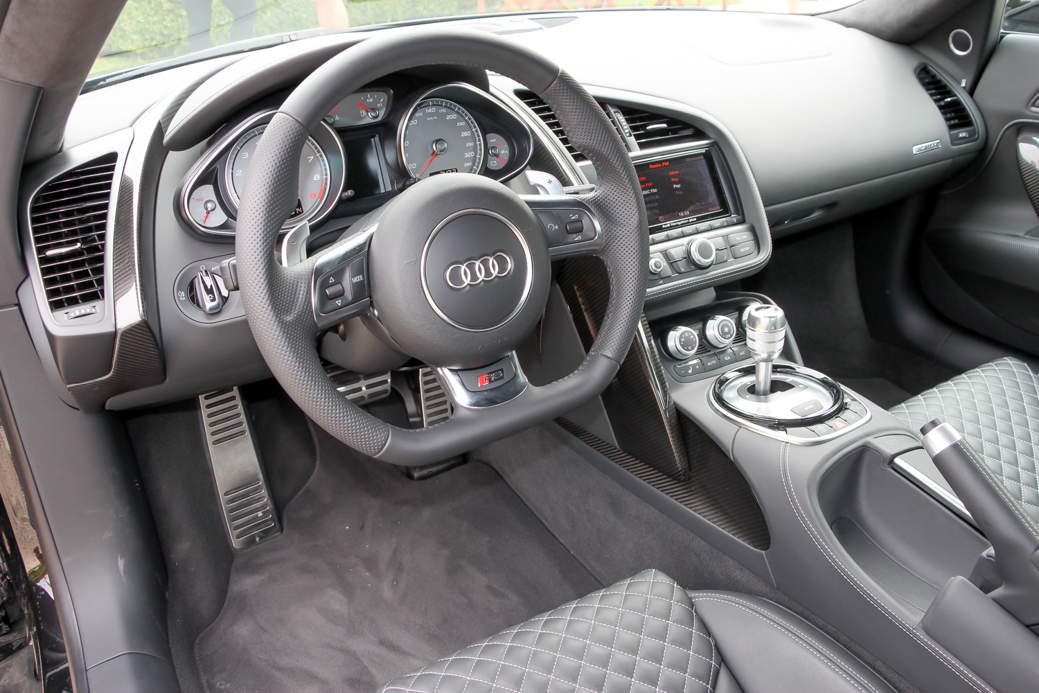 Ez szinte egy sima Audi belső. Az R8 minősége és formái ismerősek a többi Audiból, de a kabin felépítése valódi szupersportautós hangulatú