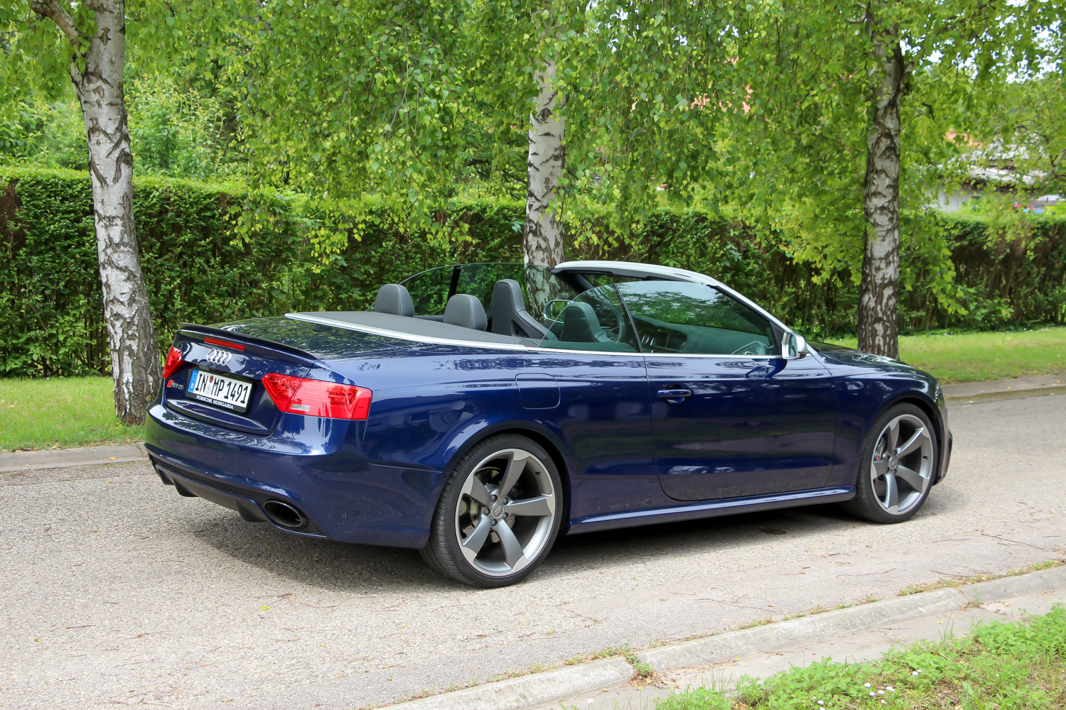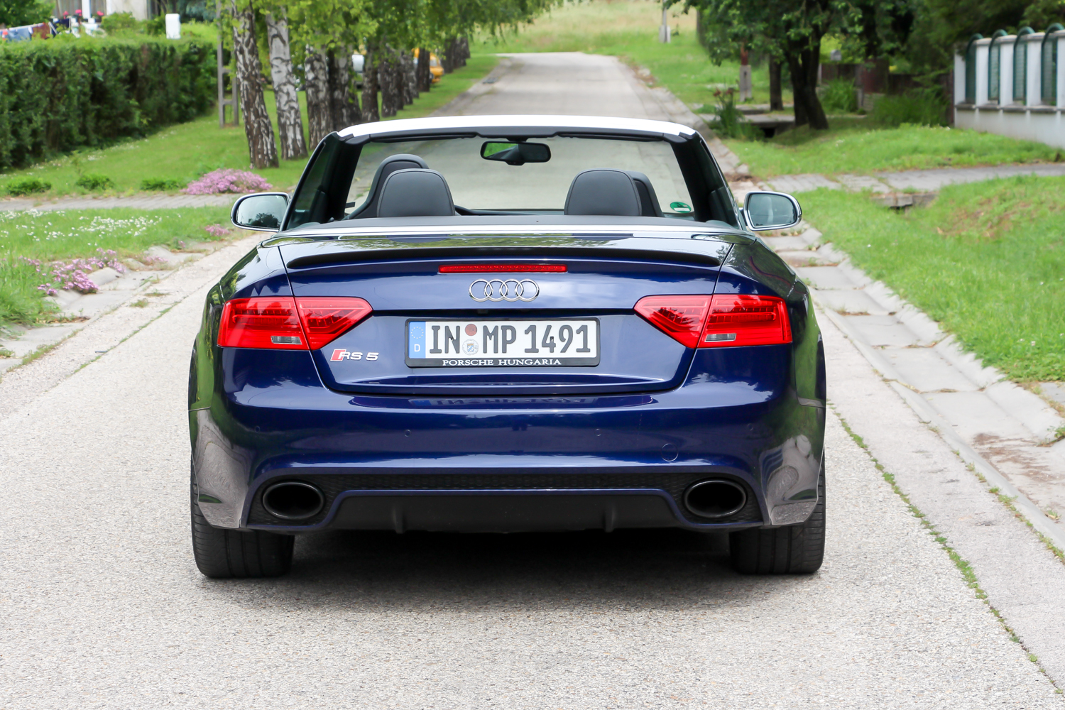 Nagyon durván tájidegen elem egy Fejér megyei falu mellékutcájában a 27,3 milliós alapárú RS5 Cabrio 4.2 V8 quattro S tronic, főleg ebben a mélykék színben
