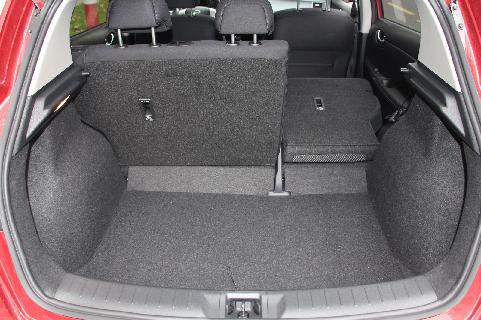 Alaphelyzetben sem kicsi, 385 literes, támladöntéssel 1,6 méter hosszú, ám sajnos nem sík padlójú a csomagtér