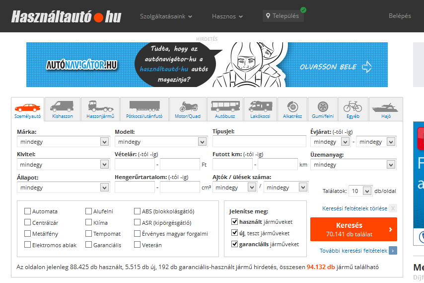 Neked a teljesítmény adatok beállítása kellene a főoldalra, egy harmadik személynek pedig valami teljesen más dolog. Az kicsit engem is zavar, hogy az automata váltót be lehet kattintani a főoldalon, de én mindig pont a manuális váltós autókat keresem, így be kell mennem a bővített keresőbe. Szóval ha egy 7 személyes egyterűt akarok manuális váltoval, akkor hiába van kinn a szállítható személyek száma, mert a manuális váltó miatt be kell mennem a részletesbe.