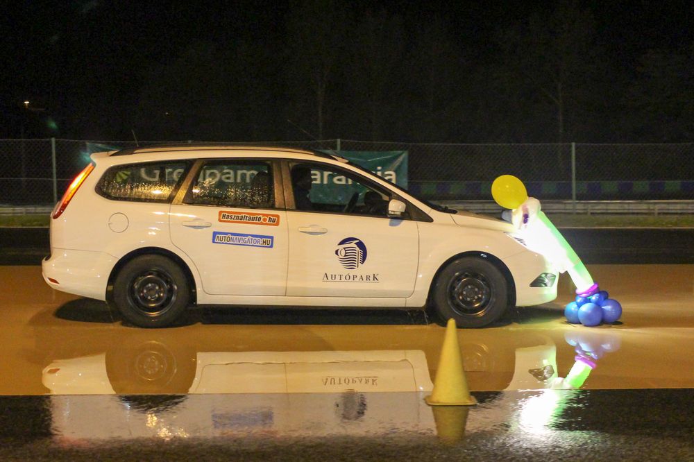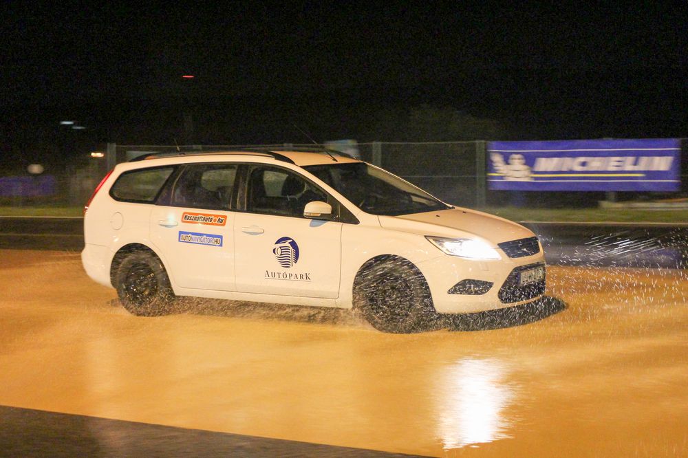 - Fékút 60 km/óráról nedves aszfalton a Tanpálya locsolt pályáján