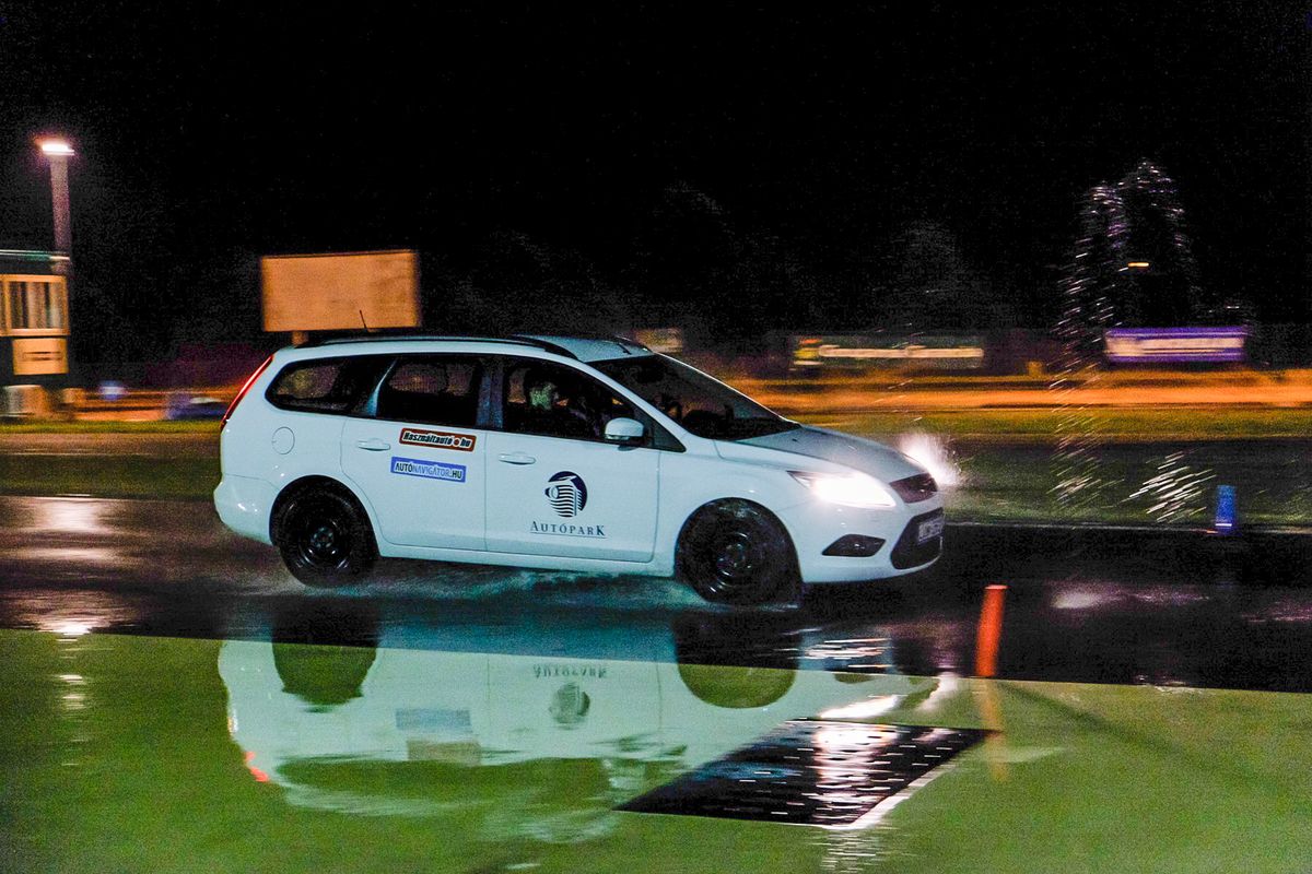 - Fékút 60 km/óráról nedves aszfalton a Tanpálya locsolt pályáján