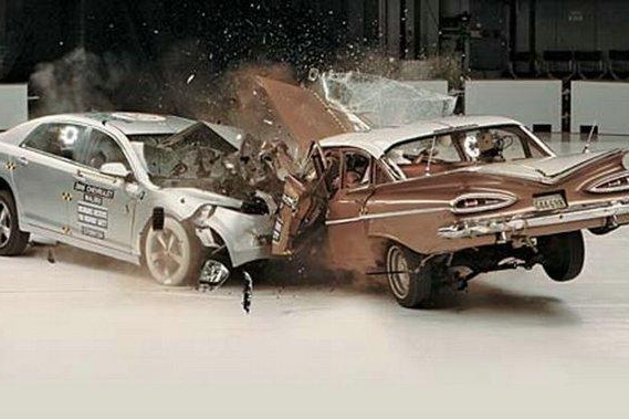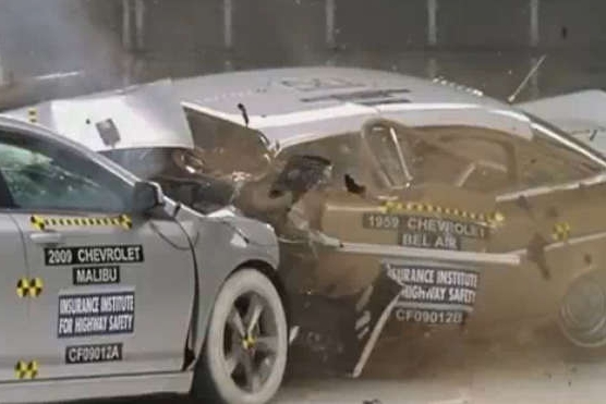Ezúttal e témában mutatunk két töréstesztet, amelyek egyértelmű választ adnak. Az első amerikai, az akkor 50 éves NHTSA 5 évvel ezelőtt végezte. Nem mai tehát, mégis sokatmondó. Egy 1959 Chevrolet Bel Air és egy 2009-es Chevrolet Malibu találkozik rajta. Mindkettő csúnyán összetörik, az utascella azonban nagyságrendekkel jobban egyben marad az új autóban. Nyilvánvaló, hogy mindkettő nem csak gazdasági, hanem szerkezeti totálkáros is lesz az ütközés után, ám akármennyire nagy és nehéznek tűnő autó az ötvenéves Bel Air, biztonságból kevesebbet ad, mint a modern Cruze.