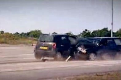 A második videó már komolyabb lélegzetű mű, s szintén nem mai. A Fifth Gear csapata két használt autót, egy hároméves Renault Modust és egy mindenképp több mint 10 éves Volvo 940-est küld egymásnak 40 mérföld/órás, azaz mintegy 60 km/órás tempóval. A félátfedéses ütközésnél sebességkülönbségük tehát 120 km/óra fölötti. Vajon a mindenen átgázoló biztonsági etalonnak tartott kocka-Volvo vagy a töpszli, ám 5 Euro NCAP csillagos Renault ad-e nagyobb biztonságot a sofőrnek és utasának, aki jó eséllyel élete párja, a számára legfontosabb ember? Nos, miként az a videóból látható, a modern, energiaelnyelőkkel és légzsákokkal tűzdelt Modus nagyságrendekkel jobb utasvédelmet ad, mint a méretesebb 940-es. Kár azzal érvelni, hogy az öreg autókban még volt anyag, még a rozsdamentes, hibátlan darabok sem tudnak olyan biztonságot adni, mint a mai autók.