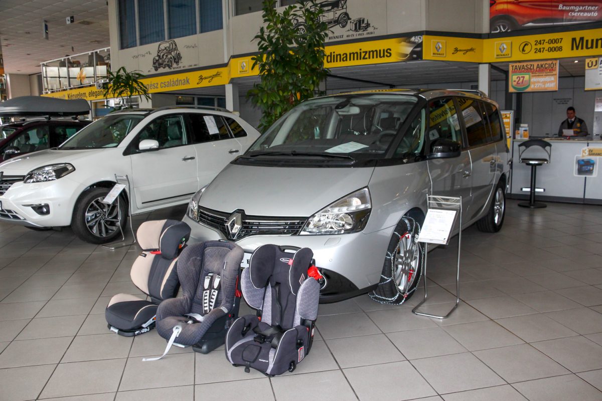 Két modellt néztünk a Renault-nál is, náluk ugyanis a kompakt Grand Scénic és a nagyobb Espace is kínál három Isofixet. A Scénic esetén fiaskó, hogy a 2.0 dCi motor épp nem szerepel a palettán, az 1.6 dCi a legerősebb dízel. Jó gép, ha viszont automata váltót szeretnénk, jelenleg az 1.5 dCi választható EDC, azaz dupla kuplungos automatával. És bizony a Scénic sem mai gép, az aktuális harmadik generáció 2009-ben jelent meg, modern sofőrsegédből egyedül sávelhagyásra figyelmeztetés, illetve a reflektor automatikus lekapcsolása szerepelhet. De igazából nem is ez a fájó, hanem a méret. Na nem a Sharanhoz, vagy az S-MAX-hoz viszonyítva, azok nem lehetnek mércék, hiszen nagy egyterűek, de a Scénic ma a kompaktok körében sem nagy. A méretesebb, korrektebb verziók között van, de léteznek tágasabbak. És ez felnőttként beülve is érezhető. Keskenyek a hátsó ülések. A három gyerekülés berakása itt volt – szó szerint – a leginkább izzasztó feladat, az ülések egymáshoz feszültek, a középső – Isofix helyett övvel rögzített – pedig kissé csálén is állt. Mivel egyedül itt kényszerültünk 1.5-ös motort választani, nem meglepő, hogy itt konfiguráltuk a legolcsóbb autót, 8,15 millióért már tolatókamerás, navigációs, bőrkárpitos, nyitható panorámatetős verzióban vihetnénk haza az 1.5 dCi EDC-t, ami azért nem rossz.