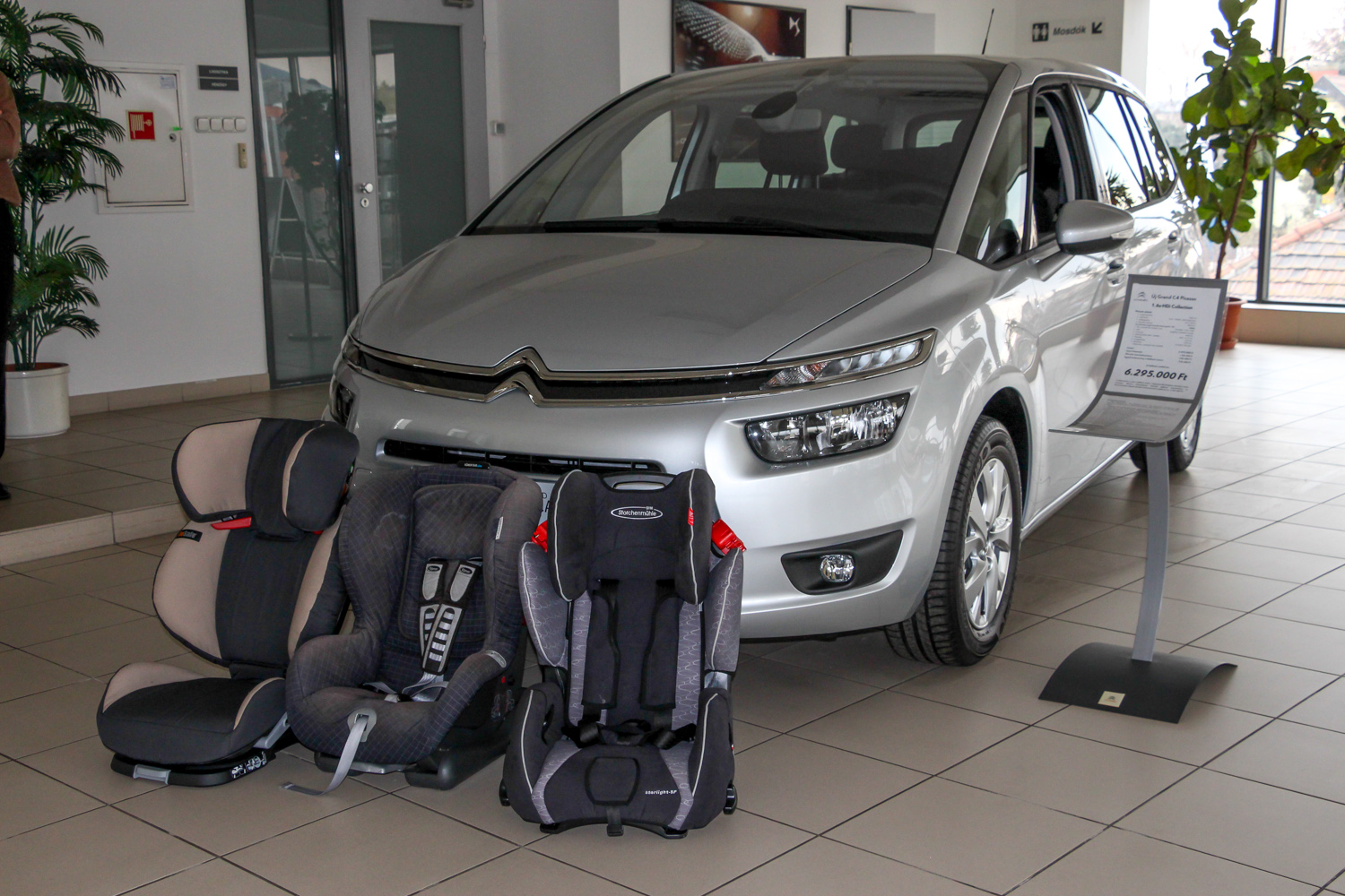 Végezetül a PSA kompakt egyterűit tekintettük meg. Azért csak azokat, mert míg a Fordnál vagy a Volkswagennél a kompaktokban nincs 3 Isofix, a PSA-nál a koros nagyokban nincs, a frissebb kompaktokban viszont van. Az új Citroën C4 Picassóban és annak hosszított, hétülésesként is elérhető Grand verziójában is. A kompaktok közül próbánk szerint a C4 kínálja a legnagyobb helyet három gyerekülés számára. De a Citroën nem csak térből, extrákból is sokat kínál. A C4 Picasso még a nagyobb méretű egyterűeket is lepipálja opciós kínálatával. Elektromos csomagtérajtó, távolságtartós tempomat, holttérfigyelő, sávelhagyásra figyelmeztetés, automatikusan lekapcsolódó reflektor, 360 fokos parkolókamera és parkolóasszisztens egyaránt szerepelhet nála, de még olyan egyedi extrák is, mint ülésmasszázs, az utasnál felhajtható lábtámasz. Az extrák sorát jelzi az is, hogy az akciósan 8 680 000 forintos csúcsverzióból (még csak nem is az összes extra megrendelésével) itt is gond nélkül tudtunk 10 920 000 forintos álomgépet varázsolni, igaz, a szintén nem kezdő kereskedő a Citroën esetén is elhúzta a mézesmadzagot a céges vásárlás esetén realizálható, az alapból is járó bő félmilliós mellé társuló több mint egymilliós árkedvezménnyel.