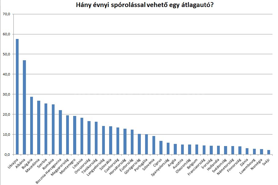Nem egy luxusautó, csak egy új Suzuki Swift esetén néztük meg, hogy az hány havi átlagbért jelent az egyes országokban, illetve azt, hogy az hány évnyi spórolással (az átlagbér 10%-os félretevésével) lenne megvásárolható