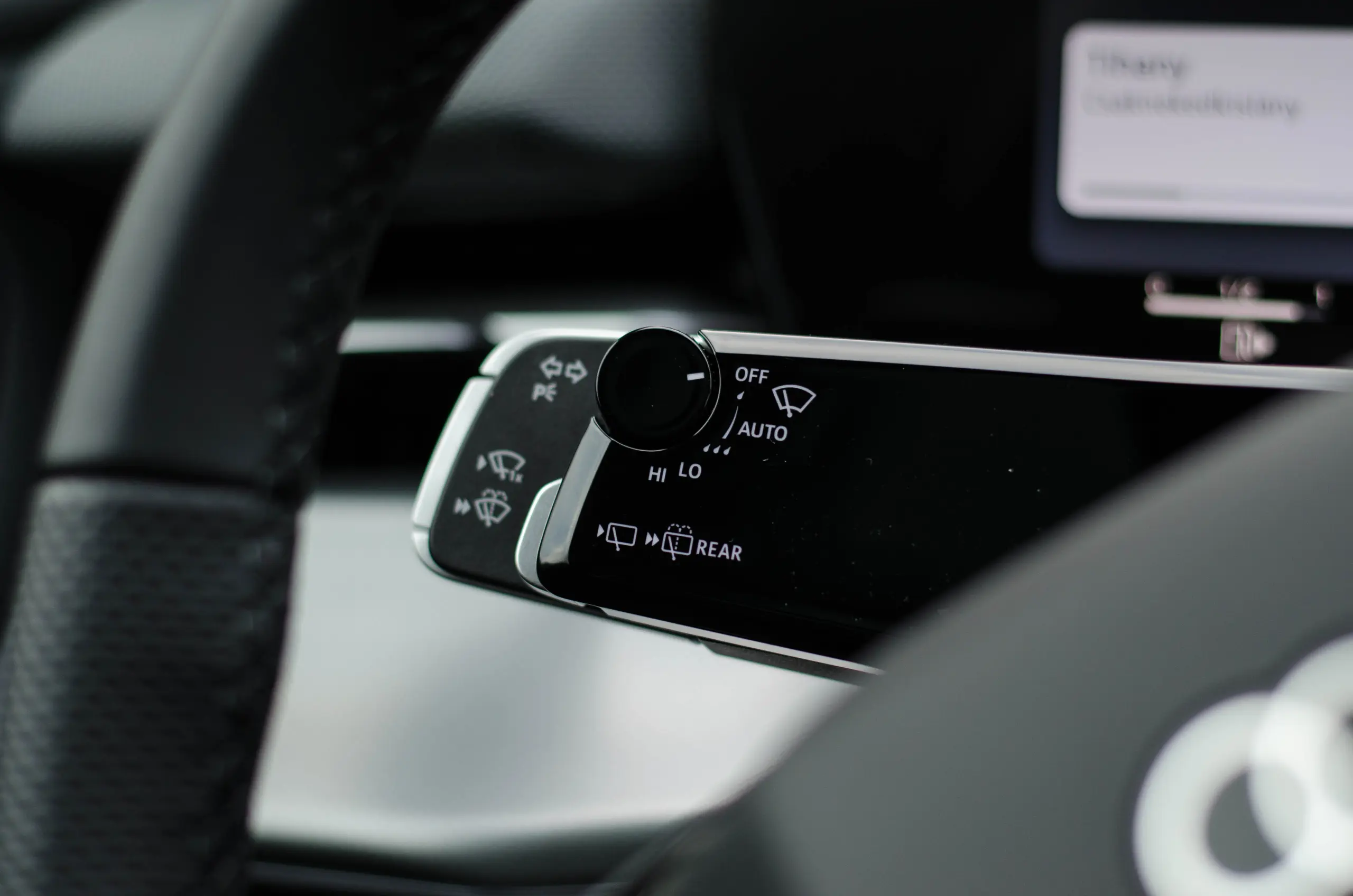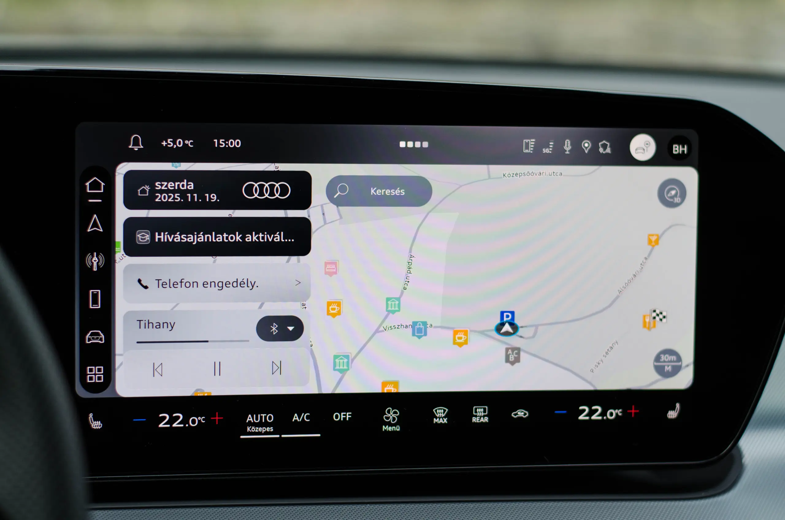 És ha már a fizikai gomboknál tartunk, akkor nem szabad elmenni az Audi új indexkapcsolója mellett. Mert bár a marketing a kormány mögötti kezelőfelület egészét innovatív újdonságként kezeli, a jobb oldali váltókar valójában pontosan ugyanaz, mint rengeteg, más modellben, csak egy szép, új ruhába öltöztetve. A bal oldalra pillantva azonban a megszokott bajuszkapcsoló helyett egy komplett kezelőtömbön a funkciók ijesztő sokasága néz vissza a sofőrre. Szerencsére azonban ez csak a látszat, ugyanis az alapok terén, vagyis az index és a reflektor esetében minden pontosan úgy működik, ahogy bármilyen más autóban, a többi funkció pedig egytől egyig jól elkülöníthető helyet és mozdulatot kapott a karon. Mindent egyszer kell megtanulni, aztán odanézés nélkül kezelhető. Általában nem szoktam támogatni, ha egy gyártó az alapvető funkciók terén próbálja meg feltalálni a spanyol viaszt, de ez kimondottan jól sikerült.