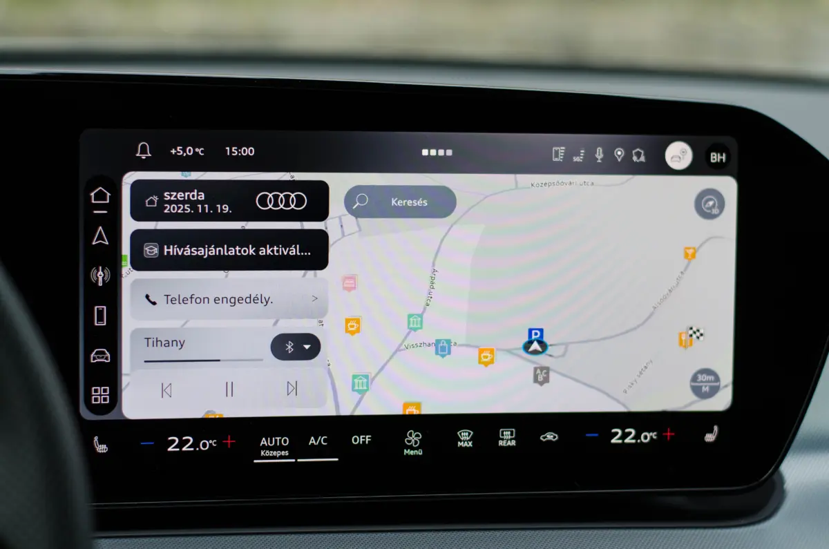 Az utastérben például kimondottan látványos az előrelépés. Az általam nemrég tesztelt S6 Avant e-tron, illetve a két Q6 e-tron kabinjához képest például egyenesen felüdülés az új Q3-ba átülni. Jól látszik, hogy az Audi hallgatott a visszajelzésekre, mert még alacsony felszereltség esetén is figyeltek az anyagokra. A ritkán tapogatott részeken sem a legolcsóbb, fröccsöntött műanyagot használták, illetve ahol mégis spórolni kellett, ott legalább érdekes textúrát adtak a borításnak, hogy jó érzés legyen megfogni. A két képernyő sajnos ezt a műszerfalat is leuralta, de ehhez lassan hozzászoknak az újautó-vásárlók. Szerencsére azonban rengeteg funkció kapott fizikai gombot, akár olyanok is, amelyek mostanában előszeretettel költöznek képernyőkre, mint például a világítás, a tükörállítás, a kipörgésgátló, a menetstabilizátor, és még sorolhatnám.
