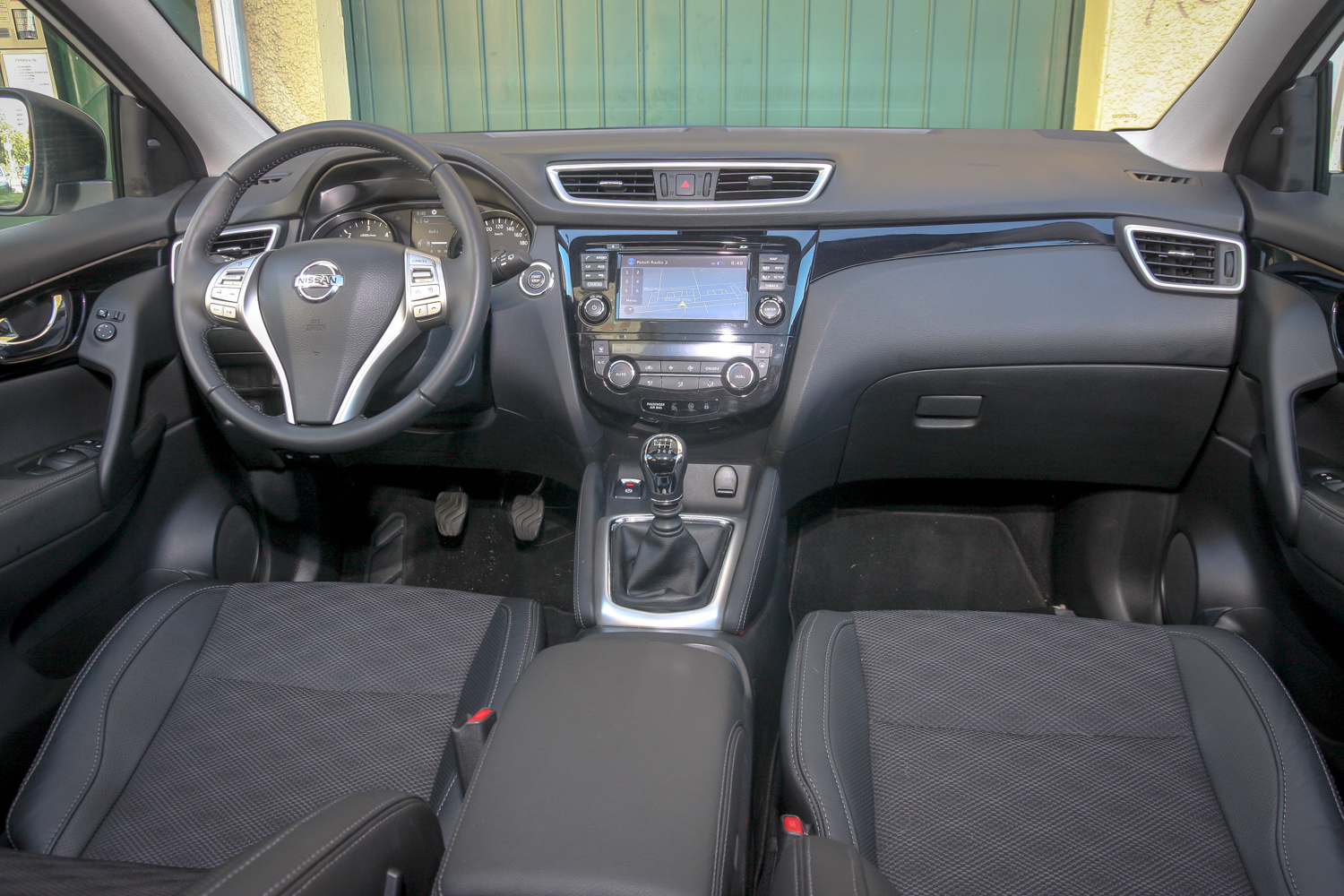 A középső Acenta szint már ködlámpát, kétzónás automata légkondit, esőszenzort, motorosan behajtható tükröket, bőrözött volánt és váltógombot, hátra is könyöklőt, jobb minőségű kárpitozást, sofőroldalon deréktámaszt, 4 helyett 6 hangszórót és 17 colos alufelnit is ad. A csúcs Tekna meg biztonsági csomagos és aktív pajzsos. Előbbi táblafelismerést, vészfékezést, sávelhagyásra figyelmeztetést, automata reflektort, parkolóradart, elektrokróm belső tükröt, utóbbi parkolóasszisztenst, holttérfigyelést, mozgótárgy-észlelést és éberségfigyelést takar. Kár, hogy mint a Note-nál, itt is van rés a pajzson, ami jelen esetben az, hogy nincs adaptív tempomat. De azért sok-sok mindent kínál és törésteszten is bizonyítottan vigyáz utasaira a Qashqai, köszönjük.