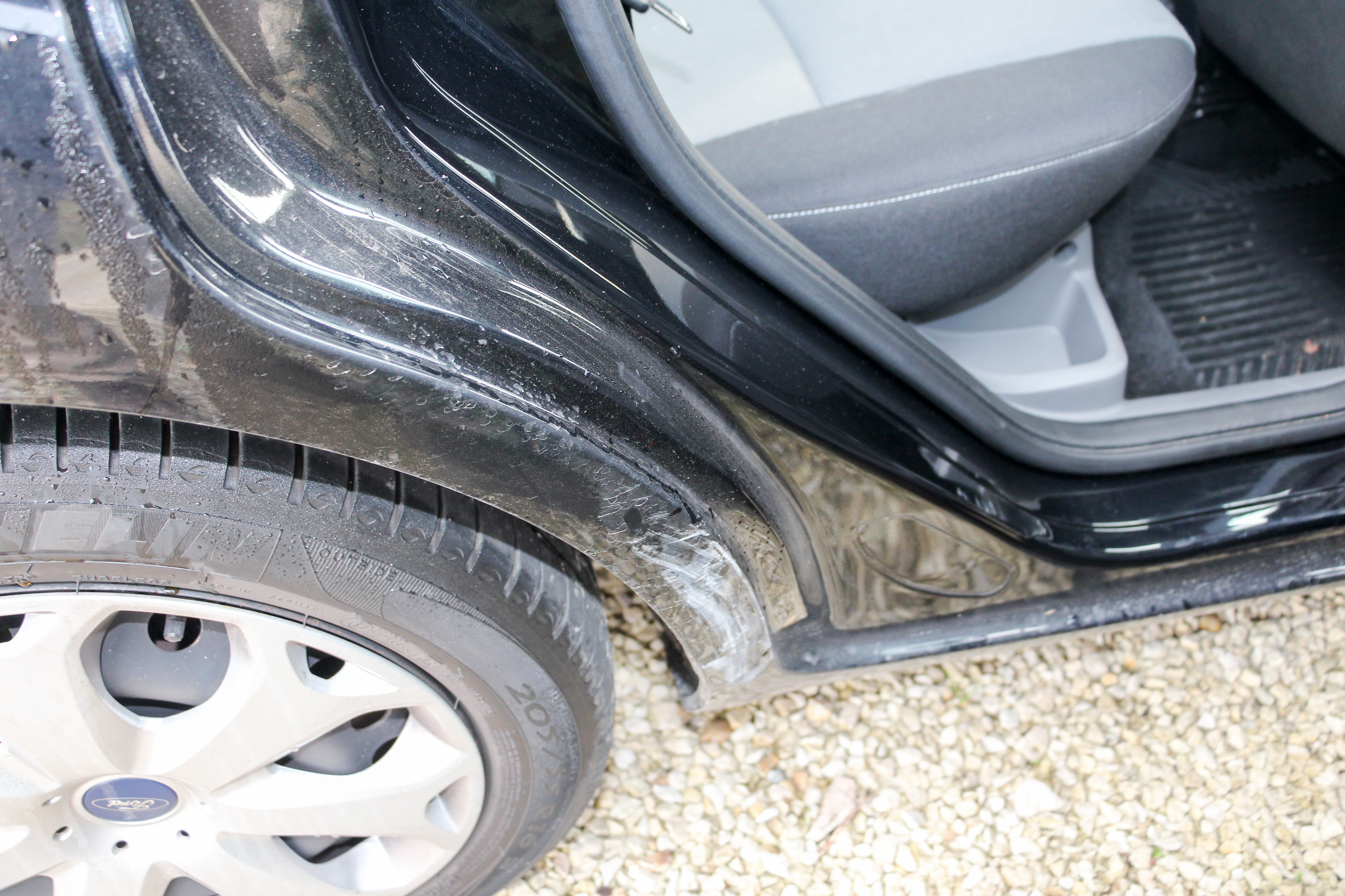 Minimális gyűrődés a sárvédő kerékjárati ívén, viszont épp elegendő ahhoz, hogy belül is megtörjön az üregvédelem. Ha ezt nem bontják le, nem cserélik, az autó záros időn belül rozsdásodni fog