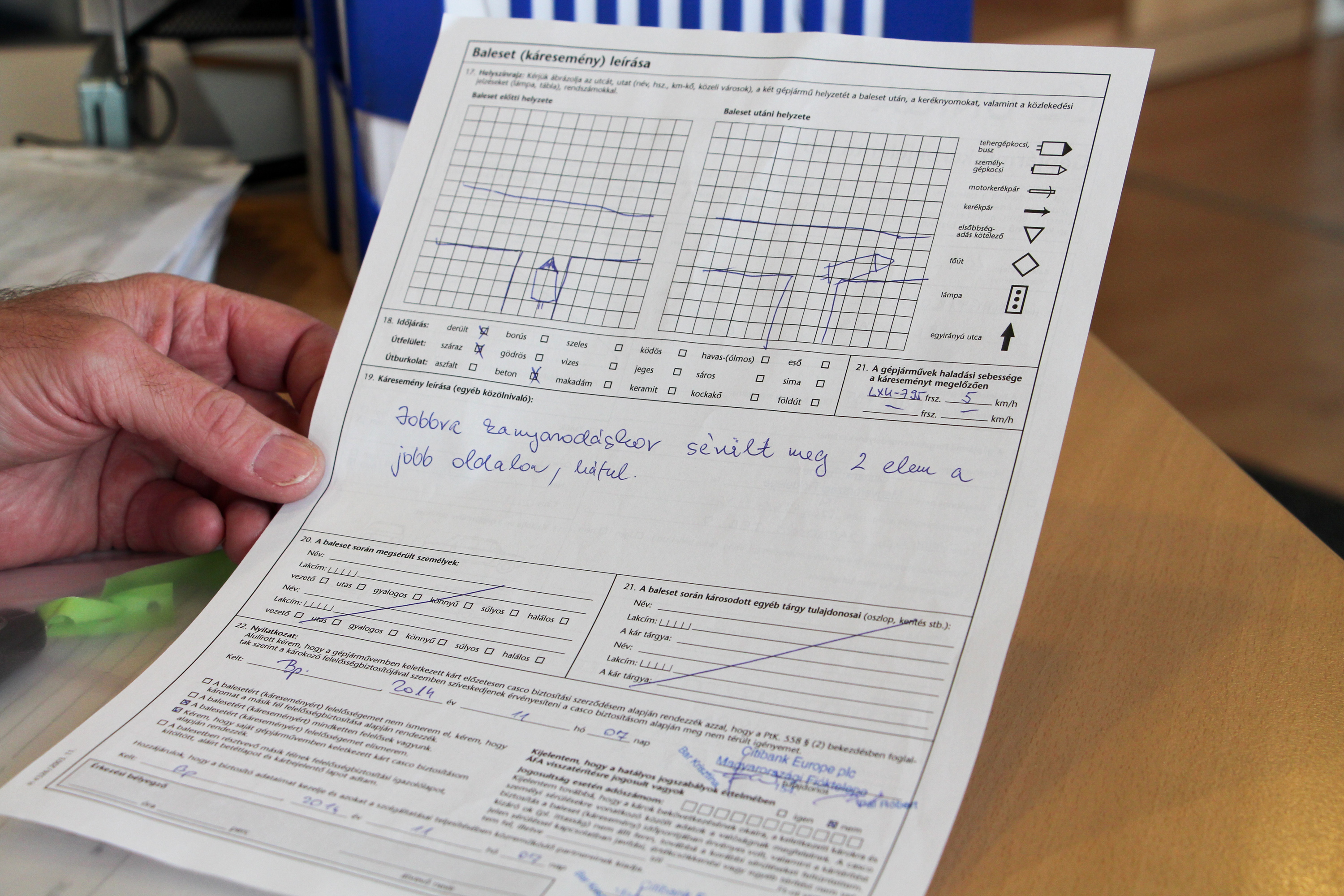 A kárbejelentő minden fontos információt meg kell adjon. Nem elegendő, hogy „jobbra kanyarodáskor sérült meg 2 elem, be kell vallani, hogy nem magától, hanem attól, hogy ott volt egy kemény tereptárgy, amit nem vett észre a sofőr