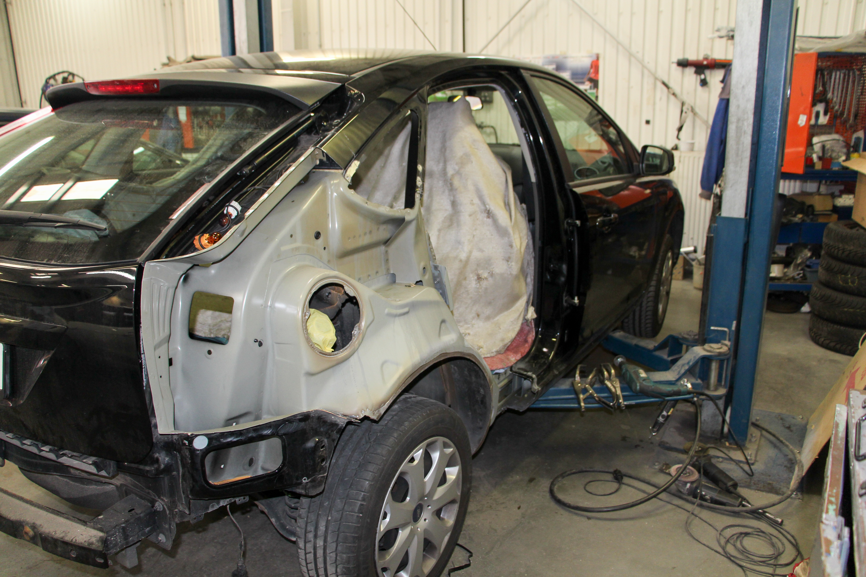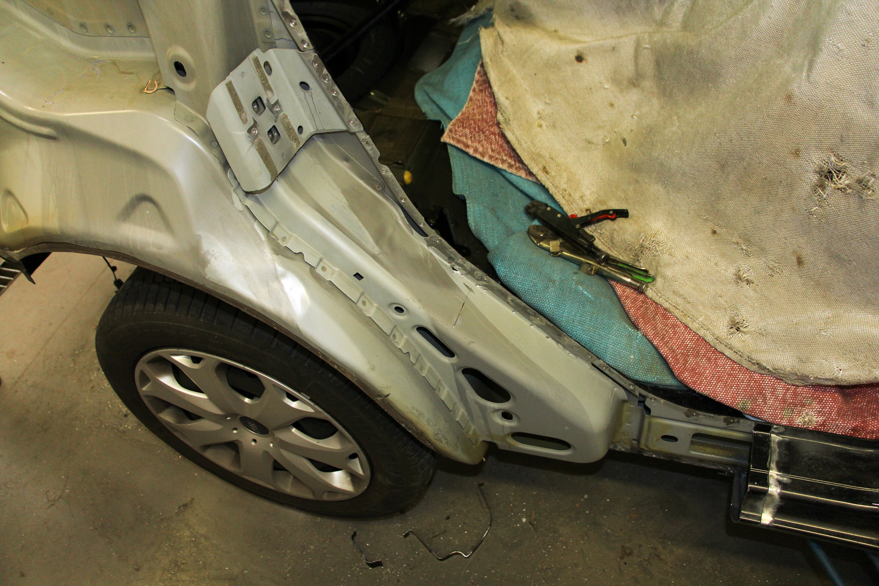 Külön a kerékjárati ív nem cserélhető, a sárvédővel együtt kell. Az elemet a küszöbnél és az ablak mellett vágják. Az elsőre nem is vészesnek tűnő sérülés miatt ennyire le kellett bontani az autót
