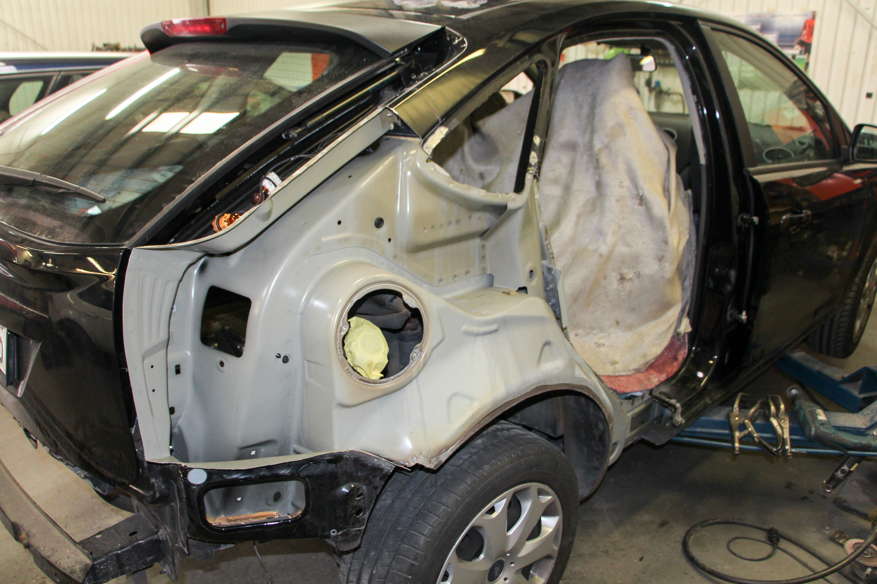 Nem csak az ajtót, a sárvédőt is cserélni kell. Azt pedig a küszöbnél, illetve a hátsó oldalablaknál vágva lehet kivenni, illetve berakni. A Focus jobb hátsó sarkát le kell bontani, az üveget ki kell vágni, szét kell flexelni a lemezeket, lefúrni a ponthegesztéseket, majd az új, a kivágottakkal azonosan méretre vágott elemeket fel kell hegeszteni. Nagy vonalakban lépkedve mindezek után jöhet a fényezés előkészítése. Csiszolás, filler alapozó felfújása, újabb csiszolás, alapozás, hőkamrás fényezés, utána pedig már csak vissza kell rakni a lebontott elemeket, fel kell építeni az autót a pőre lemeztől az utolsó kárpitdarabig, vissza kell ragasztani az oldalüveget, össze kell rakni az új ajtót a régi zárral, kilinccsel, ablakemelővel, minden kárpitelemmel. Itt egyébként új külső kilincs is kellett, az is sérült ugyanis, takarókupakjával együtt. Összességében tucatnyi alkatrész kellett az első pillantásra csak egy új ajtót igénylő javításhoz.