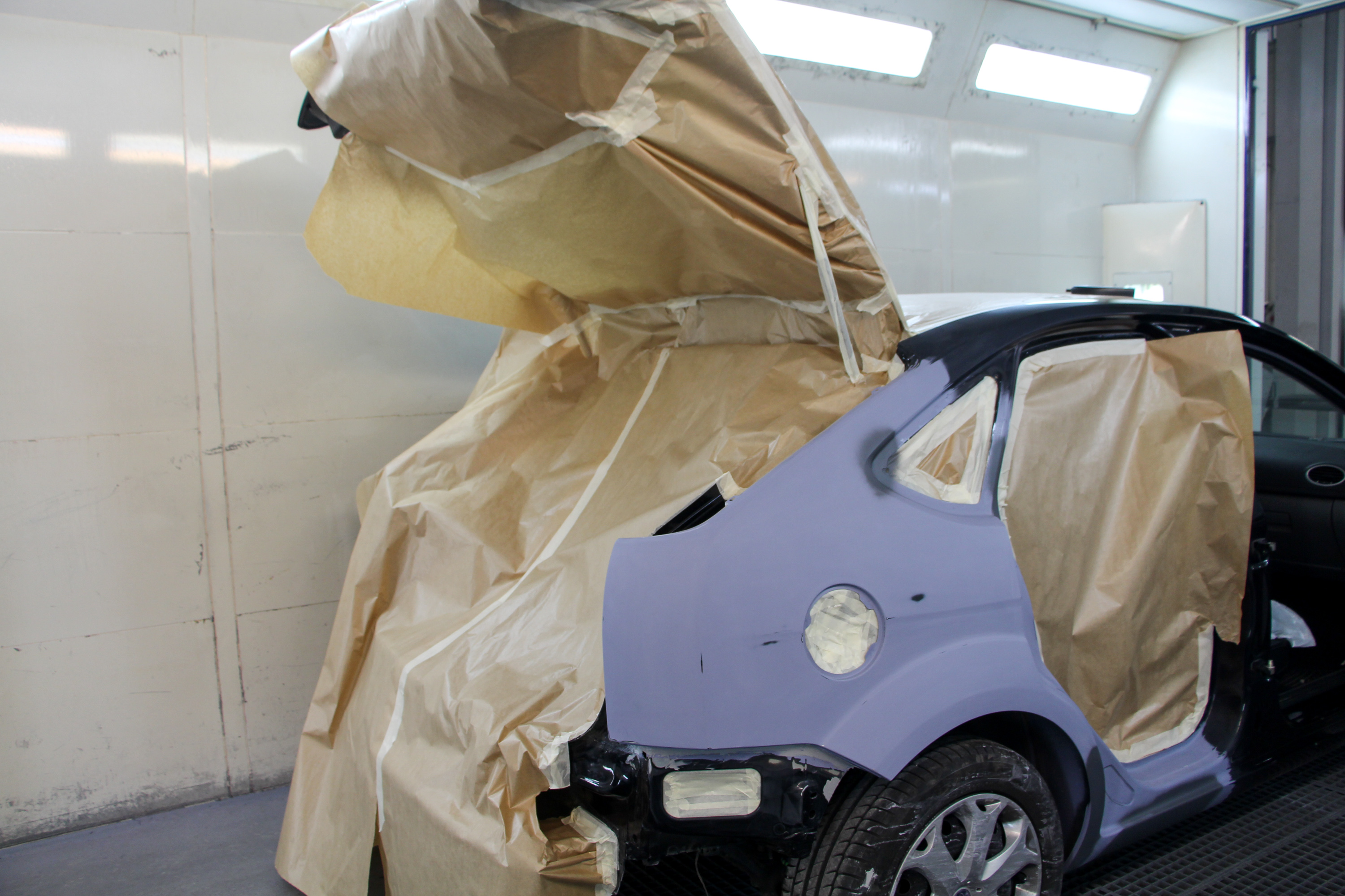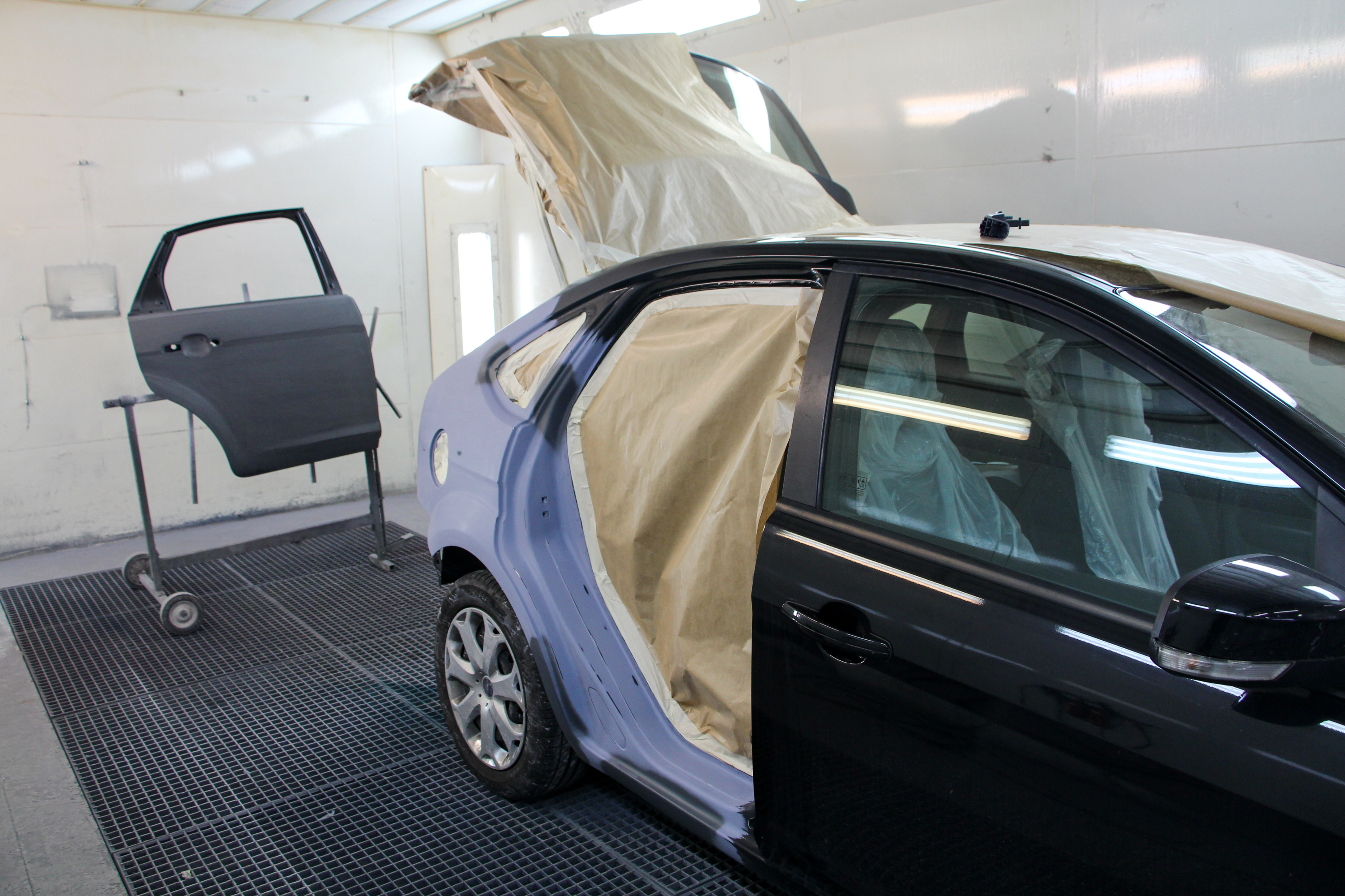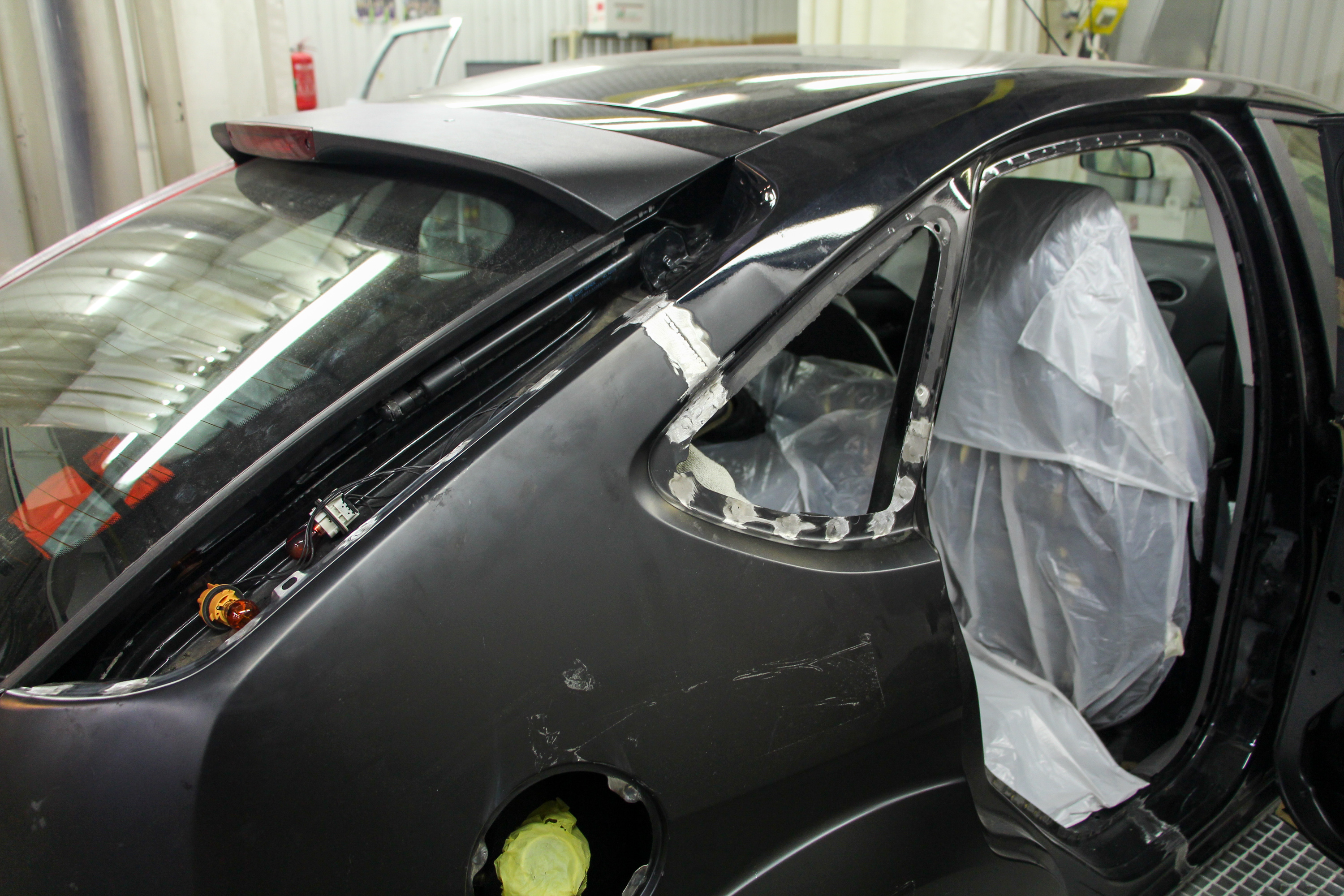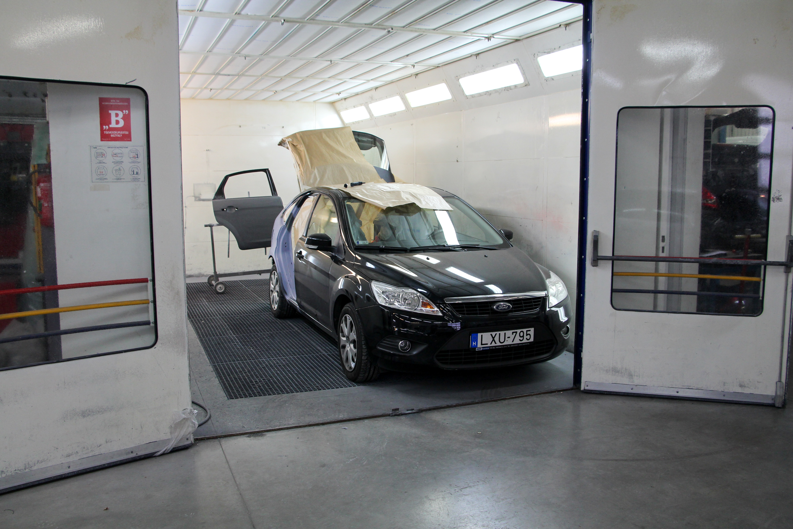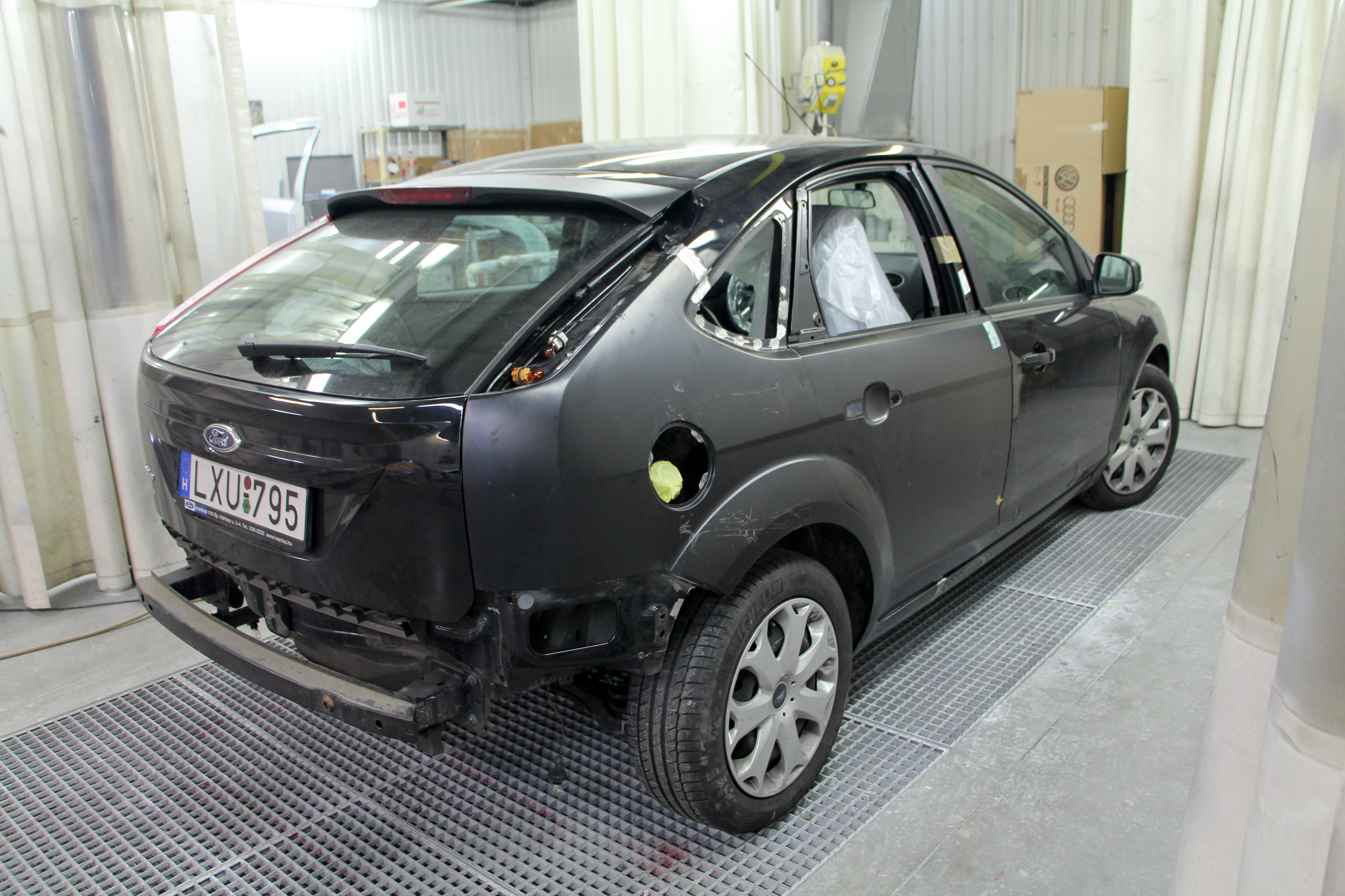 Csiszolás után a filler a karosszérián, csiszolva a gyári új hátsó ajtó is. A fényezőkamerában járunk, ahol 60 Celsius fokon égetik be a festéket