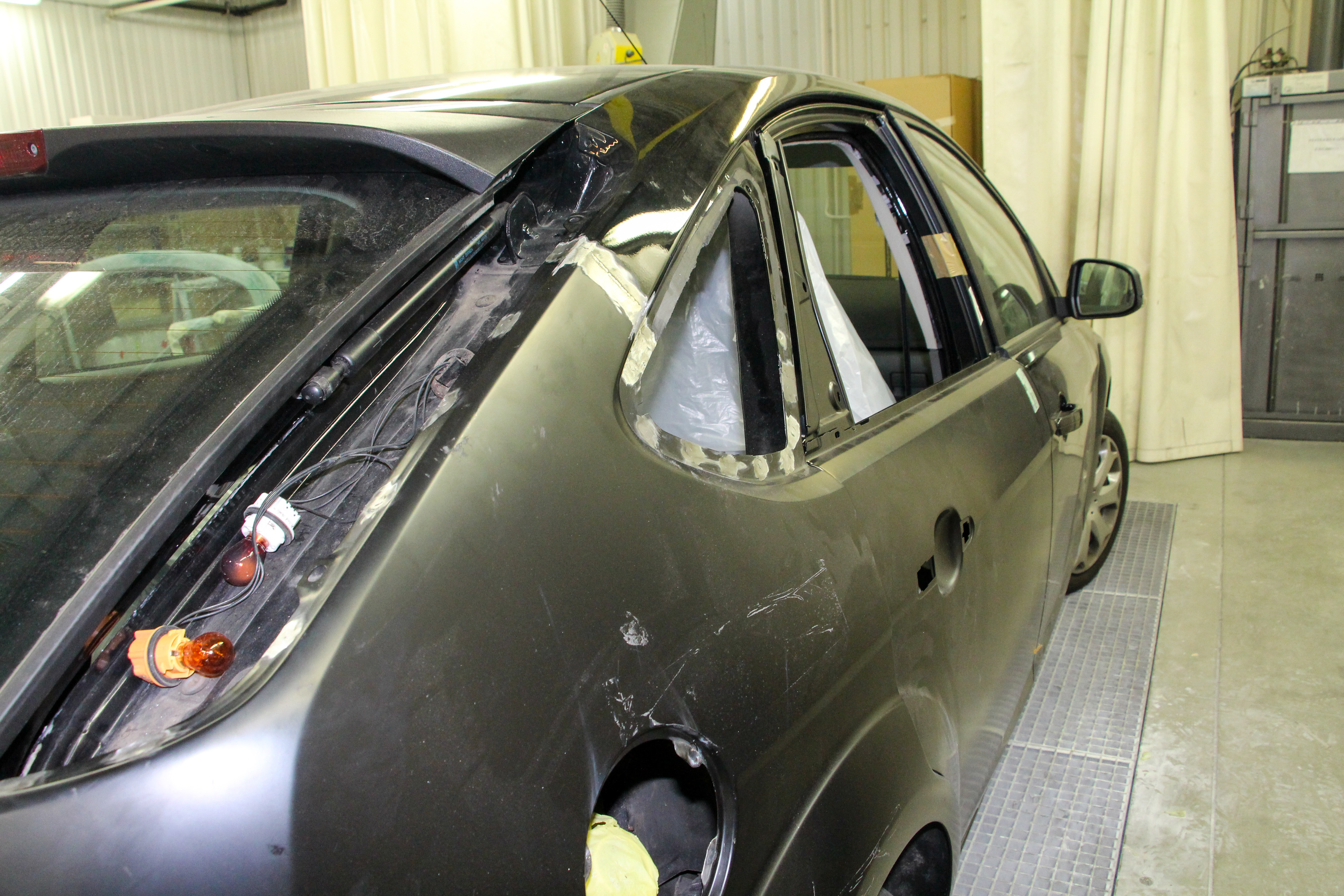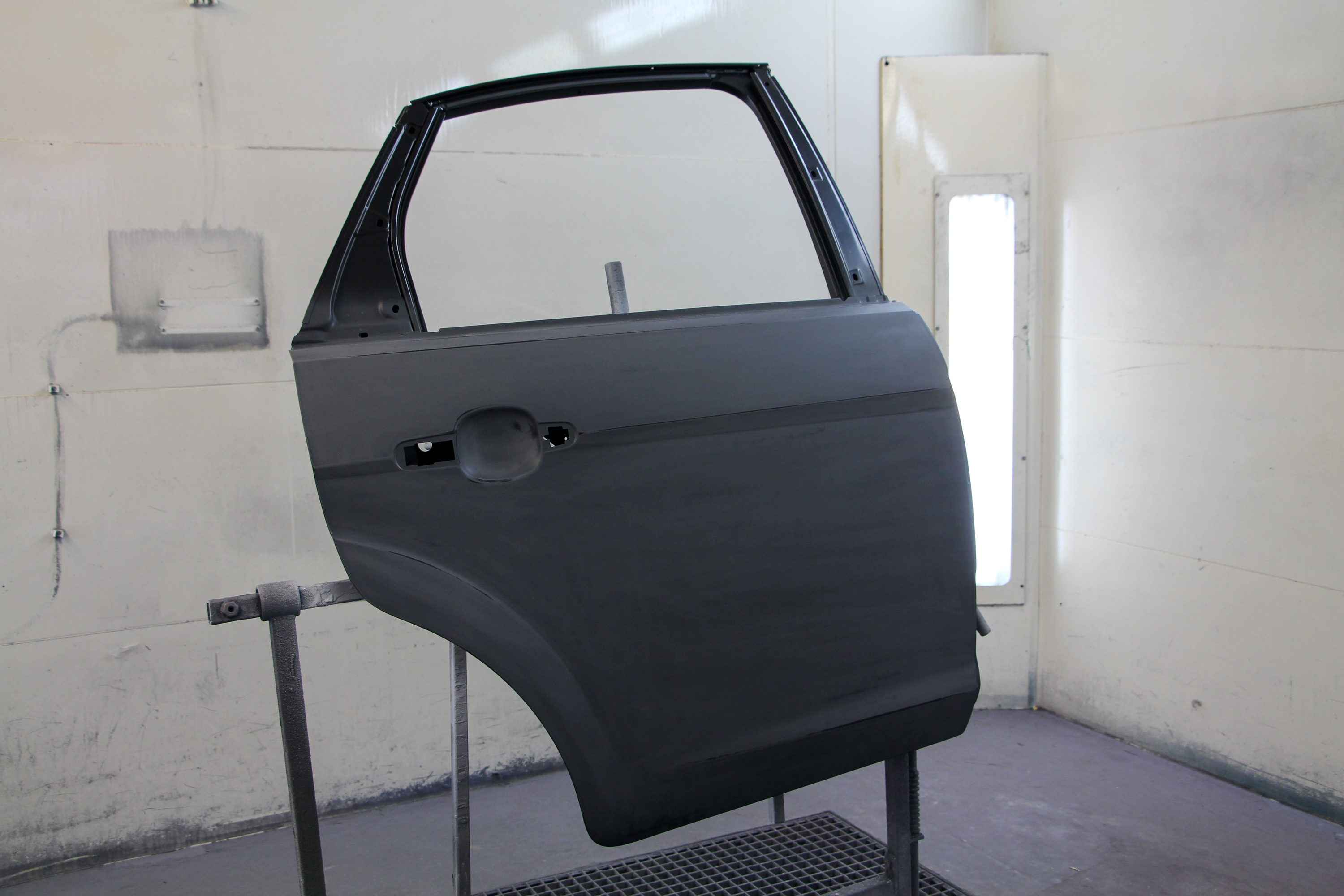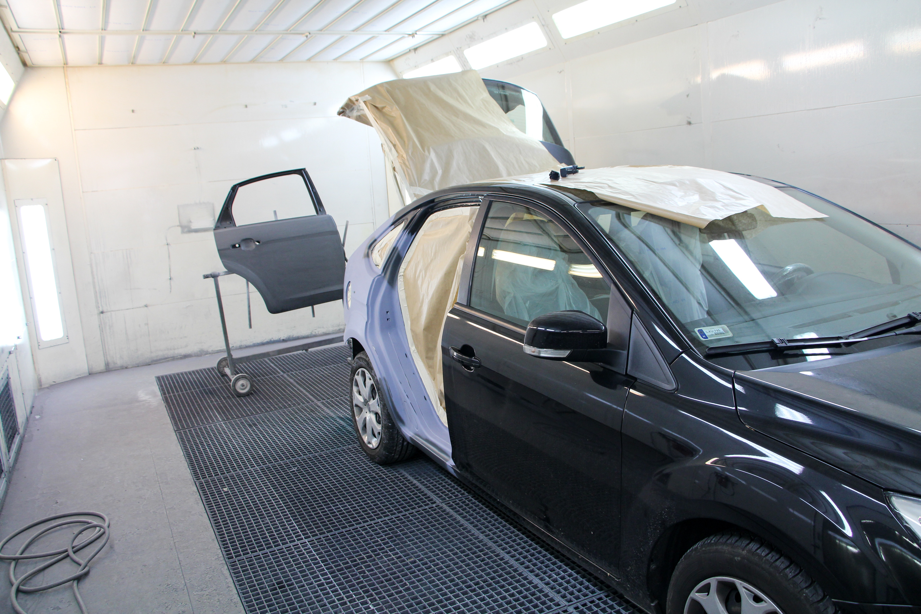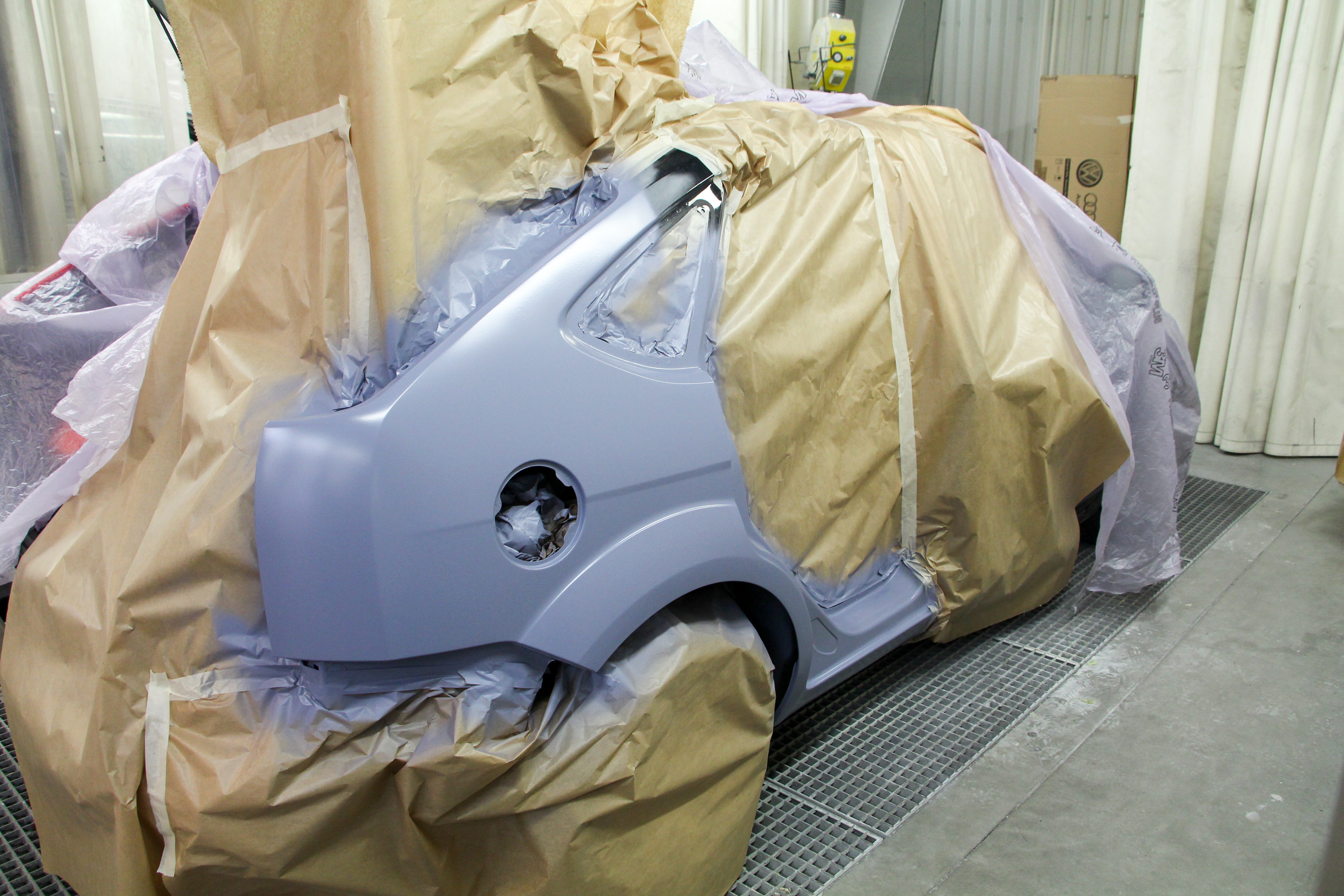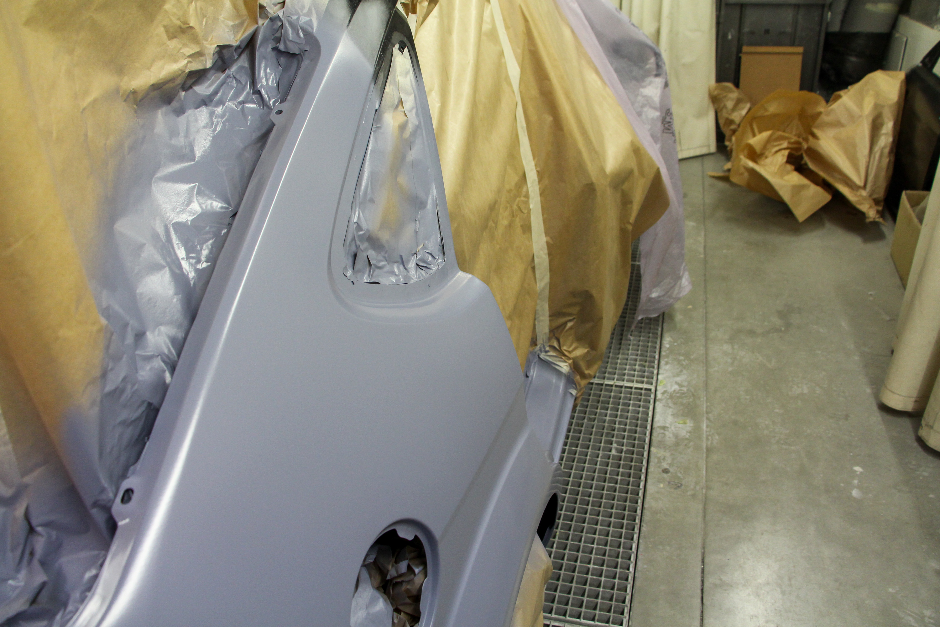 Csiszolás után a filler a karosszérián, csiszolva a gyári új hátsó ajtó is. A fényezőkamerában járunk, ahol 60 Celsius fokon égetik be a festéket