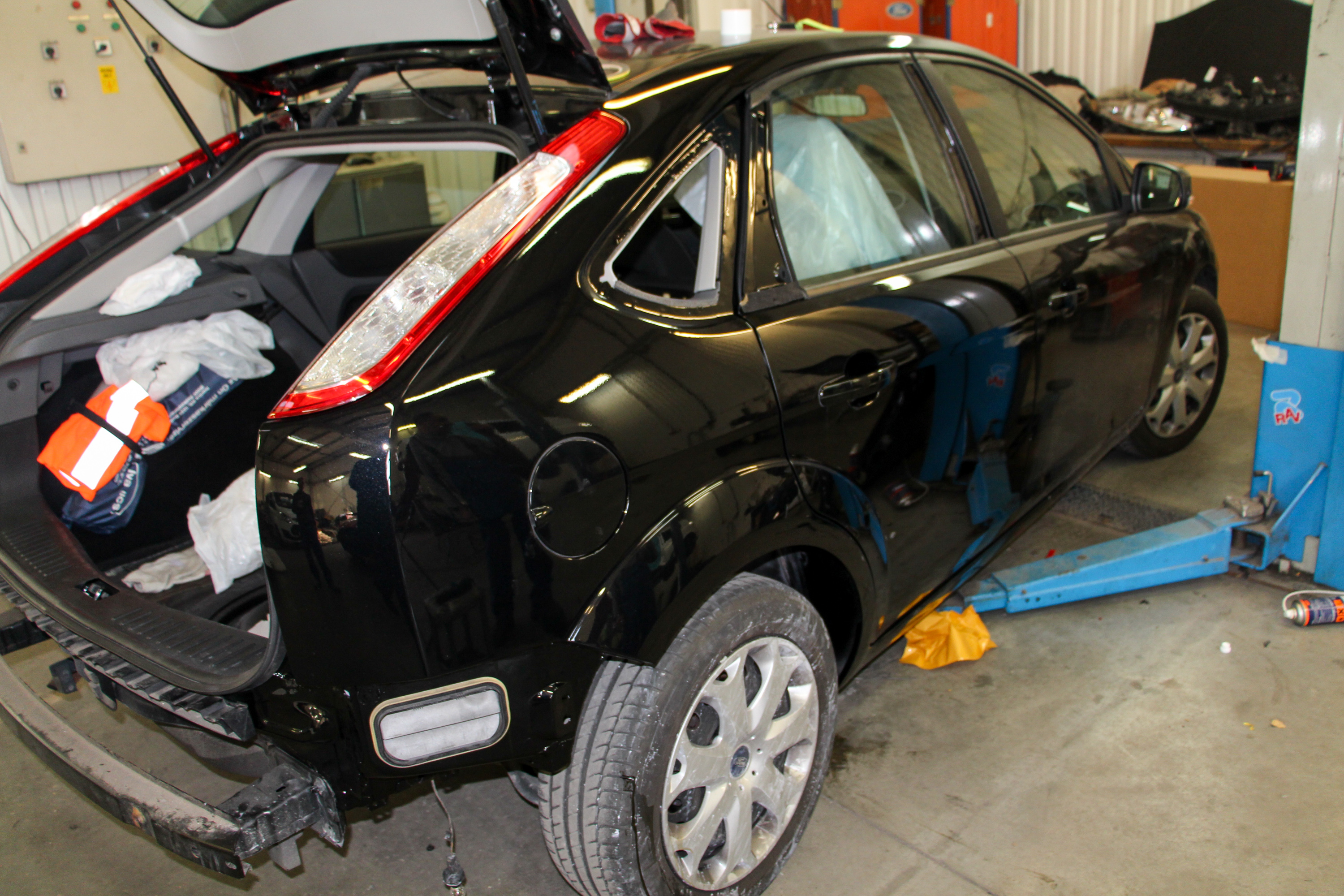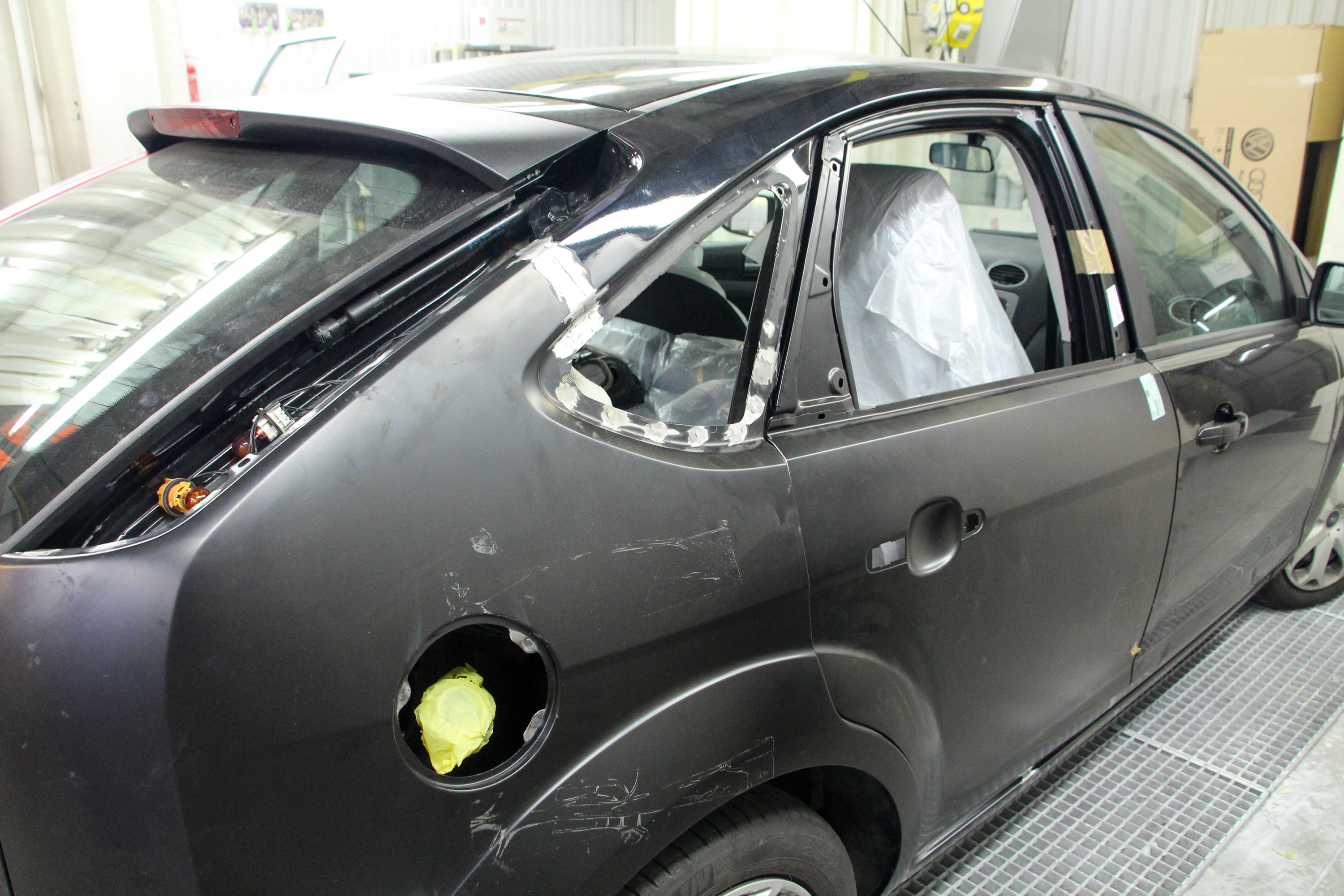 Már fényezve, összeszerelés közben a Focus, a hátsó üveg ragasztása 6 óra alatt köt teljesen, addig nem is mozdítják az autót