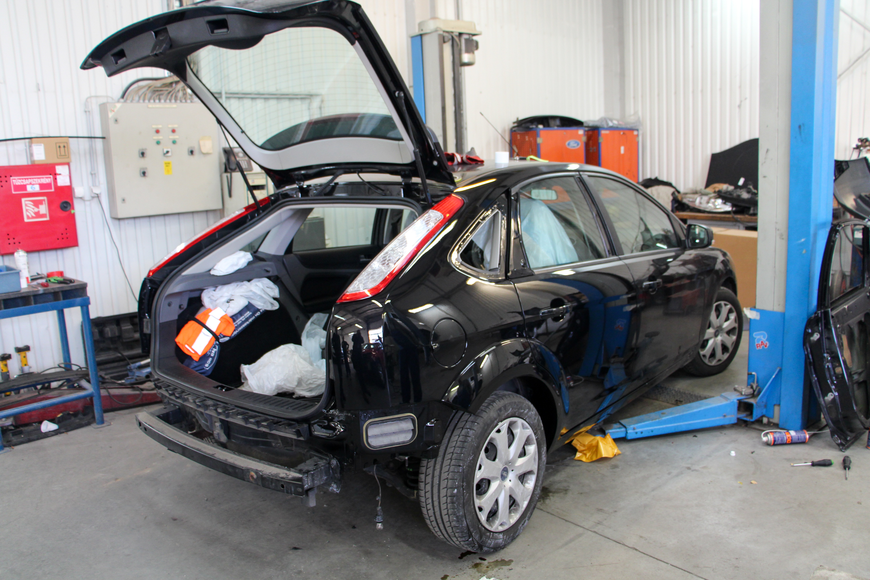És itt jön be a márkaszerviz egyik óriási előnye. Tudják, hogy a javításhoz mire van szükség, pillanatok alatt el is érik az alkatrészeket. Ami nincs itthon, az a rendelést követő második munkanapra a németországi központi raktárból is hazaér, de azért egy Focushoz jellemzően itthon is megvannak a kurrens alkatrészek – főként az Autó Fortnál, amely alkatrész-nagykereskedő is. Így például ajtó és hátsó sárvédő is volt delikvensünkhöz, pedig utóbbi azért nem egy aprócska elem. Tudja a szerviz azt is, hogy az egyes paneleket pontosan miként kell lebontani, visszarakni. Nem kell a szerelőknek azon agyalniuk, hogy melyik patentet miként tudják oldani. Ha esetleg olyan autót szerelnek, amivel még nem találkoztak (a Focus II nyilván nem ilyen), akkor a teljes gyári adatbázis rendelkezésükre áll – részletes ábrákkal és leírásokkal.